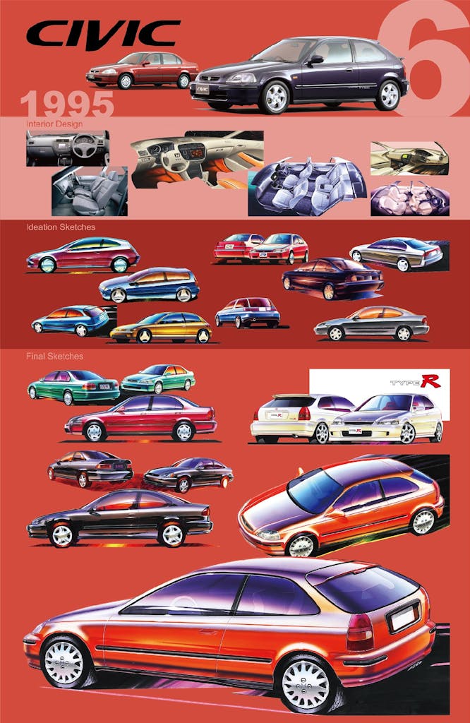 La sesta generazione di Civic fu sviluppata per creare un valore superiore a quello della sua categoria. Negli anni Novanta, i bassi consumi di carburante e le altre misure di tutela ambientale acquisirono un peso maggiore, e per tale motivo il modello fu dotato di un motore VTEC di nuova concezione. Inoltre, fu proposta in anteprima la “Hondamatic”, una trasmissione automatica a variazione continua (CVT) che offriva cambi di marcia fluidi e un consumo di carburante paragonabile a quello di un modello manuale. Basandosi sulle eccezionali capacità dinamiche della Civic standard, nel 1997 Honda fece debuttare la variante Type R. Con l’obiettivo di offrire le prestazioni più estreme mai raggiunte dalla Civic, questa vettura è diventata il simbolo di 25 anni di successi per Honda nel competitivo settore delle hot hatch.