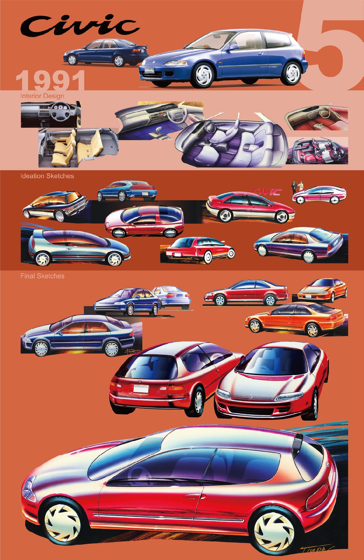 La quinta generazione di Civic arrivò subito dopo, nel 1991, debuttando con una forma più elegante e aerodinamica, con un appeal più sportivo che manteneva al contempo la funzionalità quotidiana diventata ormai sinonimo di Civic nell’immaginario collettivo.