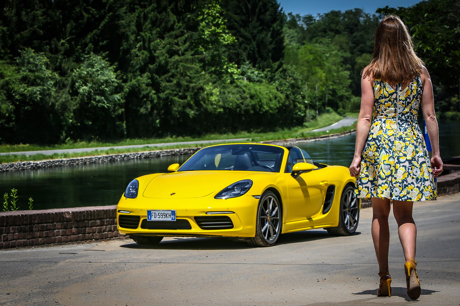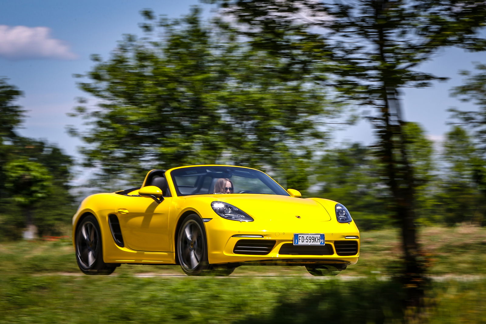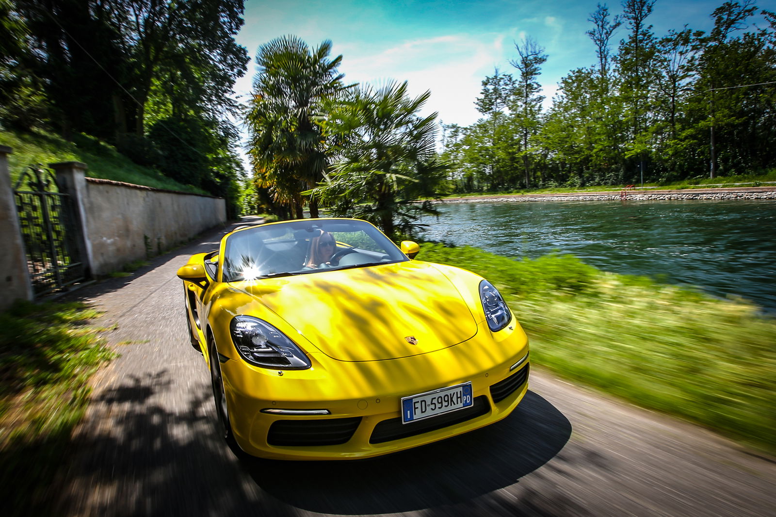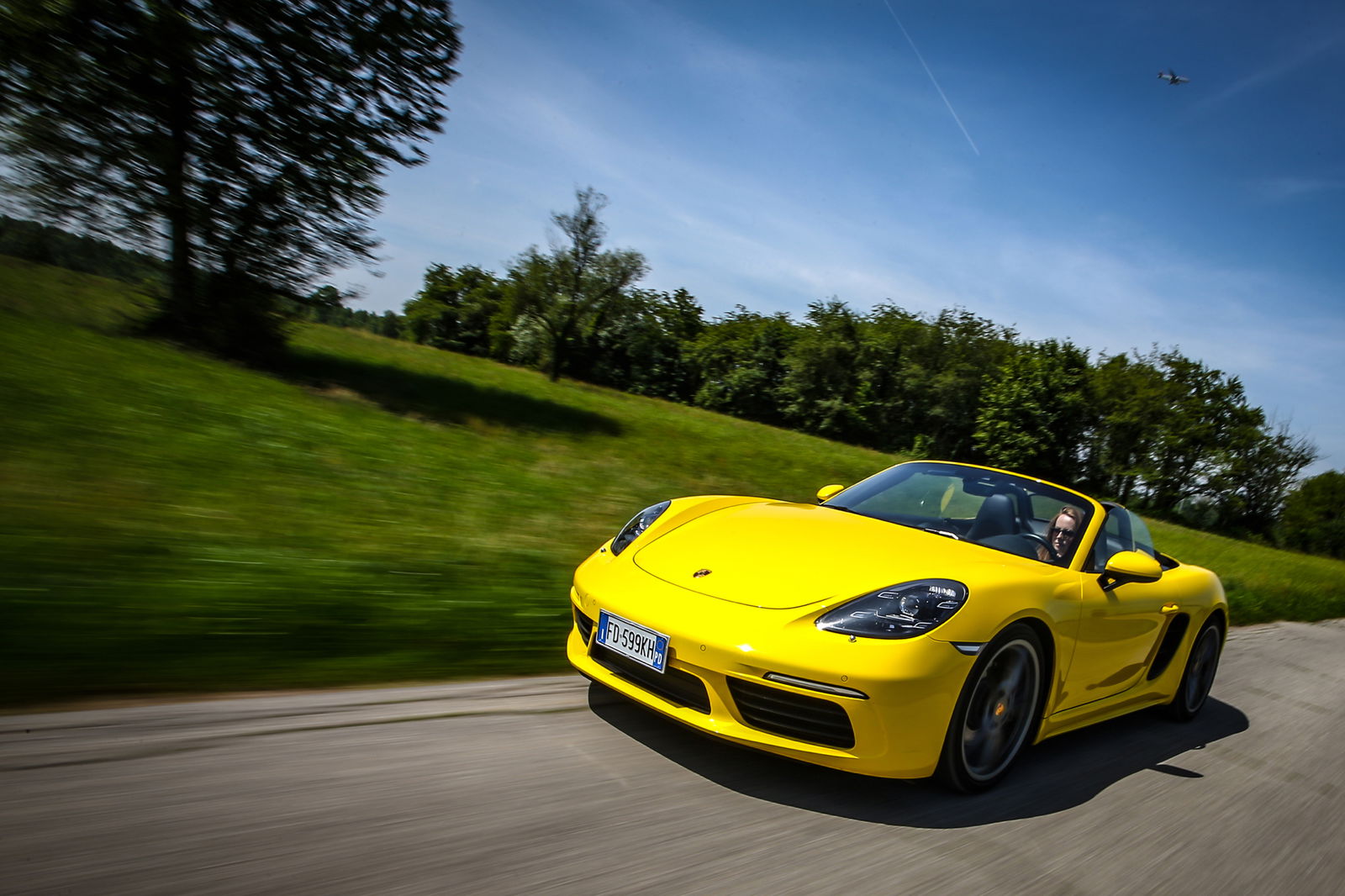 Ma la nuova Boxster non è solo un nuovo motore, il design, inedito per questo modello è decisamente più moderno e aggressivo, le prese d’aria anteriori sono più generose, i fari bixeno rendono giustizia al muso, ma è nella vista laterale e in quella posteriore che secondo me la Boxster dà il suo meglio, con le due grandi “anse” che portano aria alle bocche laterali per far respirare il Boxer montato centralmente. La coda imponente con lo spoiler retrattile (automaticamente oltre una certa velocità o a comando con un pulsante sul Tunnel centrale) e i due gruppi ottici posteriori uniti da una fascia mi piace davvero molto. Se il vestito cambia, anche il telaio è tutto nuovo, l’assetto diverso, i cerchi posteriori sono più larghi così come la carreggiata e i freni.NUOVA ANCHE DENTROA Zuffenhausen hanno lavorato anche all’interno dell’abitacolo dotando la Boxster del nuovo sistema PCM con schermo da 7 pollici, impianto Hi-Fi da 110 Watt e vivavoce Bluetooth, anche lui ereditato dalla 911 e di serie, ma incredibilmente con il navigatore offerto in optional a 1.586 euro. Come è optional anche il modulo Connect per collegare wireless il cellulare l’antenna esterna e l’Apple Car Play. Tante, forse fin troppe solo le features a pagamento. Ecco perché non è affatto difficile veder lievitare il prezzo dai poco più di 56.000 euro del modello “base” agli 84.000 dell’auto in nostro possesso che aveva addosso quasi tutto ciò che era disponibile per la Boxster.CONTINUA A LEGGERE –> VAI ALLA PROVADRIVEAccensione a sinistra; potresti avere gli occhi chiusi e capire comunque che è una Porsche. Ma anche la posizione di guida rende riconoscibile la Boxster come Porsche, accucciata e bassa con una ergonomia di guida perfetta, e tutto al posto giusto.Accensione. Il “Flat-Four” fa sentire la sua voce attraverso lo scarico sportivo, abituato al sound del sei cilindri all’inizio resto un po’ stranito. Curioso che una Porsche suoni così. Tuttavia il lavoro fatto dai tecnici del suono è stato ottimo. Solo ai bassi regimi si percepisce un sound simile a quello di una Subaru Impreza Sti (e io lo considero un complimento) poi ai medi e alti il Boxer Porsche mette insieme una sinfonia di note e di scoppiettii in rilascio (nella mappatura Sport) davvero coinvolgenti.#SEMPREAPERTALa capote esiste, ma la Boxster a mio parere va guidata rigorosamente sempre aperta. A tetto chiuso l’abitacolo è angusto (ovviamente) ma una volta aperto il tetto (operazione velocissima) si gode appieno della spider tedesca ottimamente isolata dal vento della corsa (ma non dal rumore del motore, cosa che a qualcuno potrebbe anche piacere) anche ad alta velocità.MOTORE CON BRIO