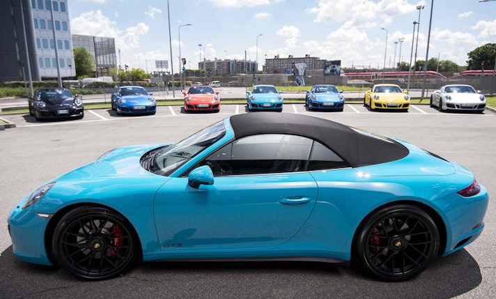 E poi la chicca: nel parterre compaiono anche un paio di GTS con cambio manuale a 7 rapporti. Siamo sempre più convinti che il cambio automatico sia il futuro ma poi, chissà perché, il manuale viene sempre conteso. E che manuale! Non lo avevo mai provato ma il 7 marce Porsche conquista. La frizione per essere su un’auto così potente conquista per la morbidezza e modulabilità e la leva –rigorosamente con pomello rivestito in Alcantara, così come la corona del volante- ha innesti veloci, precisi, secchi, e il motore sdoppietta in scalata. Una goduria. La prima parte del test nel traffico denso di Milano e, successivamente, la parte autostradale mostrano che la 911 GTS non ha perso l’attitudine GT.NON PERDE COMFORTL’assetto ribassato, le maggiori prestazioni, gli scenografici cerchi da 10 pollici con pneumatici ultraribassati offrono sicuramente maggiori performance ma non fanno perdere alla 911 il suo aplomb quando si tratta di guidare nella “vita reale” e questo è e resta sicuramente uno dei punti di forza di quest’auto. Cabrio, 4 ruote motrici e cambio manuale. Colore: rigorosamente Blu Miami. Faccio l’arrogante e ovviamente mi trascino tutti gli occhi addosso. Certo, occorre saperlo portare un colore così, non è da tutti, ma nella breve sosta presso il concessionario Porsche di Desenzano scopro che i colori accesi sono tornati di gran moda e che vendono un gran bene.CABRIO PER OSTENTARE