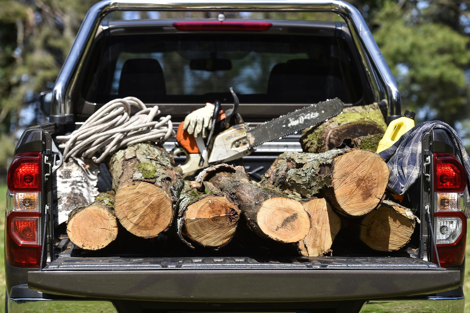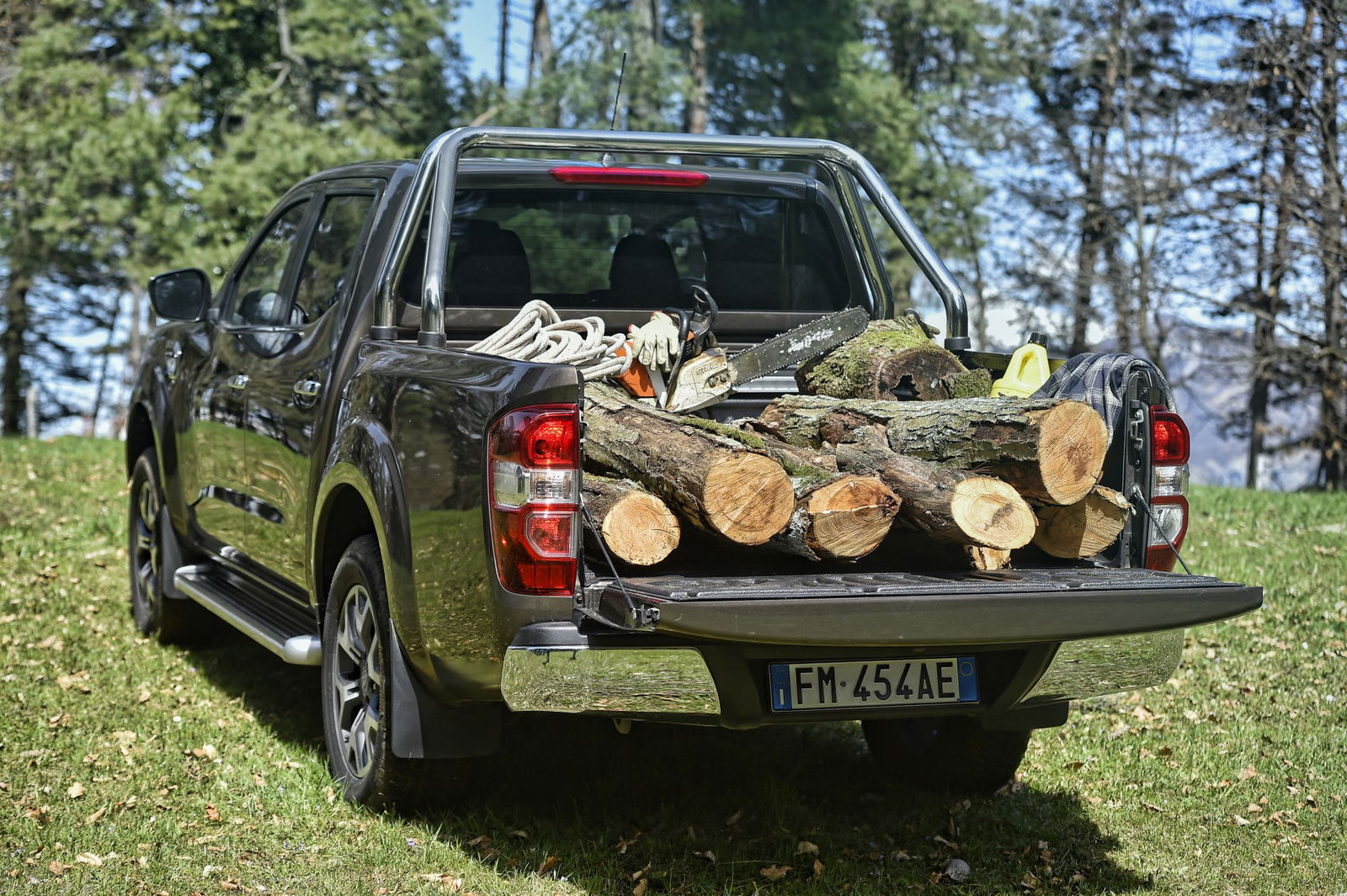 LONTANO DALLA CITTÀL’autostrada si trasforma prima in statale, poi in provinciale e comincia anche a salire torcendosi un po’. Il passo dell’Alaskan è notevole (siamo a 315 cm) e del peso ho già detto, ma la configurazione Multilink della sospensione posteriore, invece della classica balestra che caratterizza la maggior parte dei concorrenti, gli conferisce comportamento e reazioni più automobilistiche, con un accettabile trasferimento di carico e un buon rigore in curva.Il passo successivo è la deviazione verso casa, un fuoristrada leggero e con fondo abbastanza compatto, con qualche passaggio un po’ ripido reso viscido dalle piogge dei giorni precedenti. È la scusa per inserire il 4×4 e provare anche il controllo elettronico in discesa (comodo non toccare i pedali e lasciar fare alla macchina…).Dubito che meno del 99% dei possibili clienti dell’Alaskan si imbatta in situazioni più scabrose e per tutti loro la buona notizia è che le gestisce senza alcun tentennamento. Certo, gomme più off-road garantirebbero più grip, ma a scapito di una maggiore rumorosità di marcia.SPORCHI E CONTENTIArrivato a casa mi rendo conto del rischio corso dal tetto e dai tori: trenta metri di pino schiantato in mezzo alla radura e un melo piegato dallo spavento e dallo spostamento d’aria… Il lavoro grosso lo hanno già sbrigato il Livio e la sua Husqvarna da un metro, però è rimasto ancora molto da fare, così, indossata la camicia a scacchi d’ordinanza e fatta miscela alla motosega comincio a darci dentro anch’io, con la direzione lavori di Alarico e Teodorico (i ragazzotti con le corna).La sequenza, ripetuta per un intero pomeriggio, è taglia, carica, trasporta e scarica. Mi sembra quasi di trattarla male, l’Alaskan, a riempirle il cassone di tronchi nodosi, prima, e sedermi alla guida con le scarpe infangate e i vestiti pieni di segatura, poi.Ma lei non fa una piega, non si lamenta del rumore assordante del 2T delle motoseghe, non si scompone sotto il tonfo dei ceppi e neppure dopo una terribile testata di Alarico.Mi viene un dubbio… Chissà, magari, le ho regalato un momento di gloria ed esaltazione, facendole vivere qualche ora di quella vita che si era illusa sarebbe stata la sua, quando le avevano detto che da grande sarebbe diventata un pick-up…