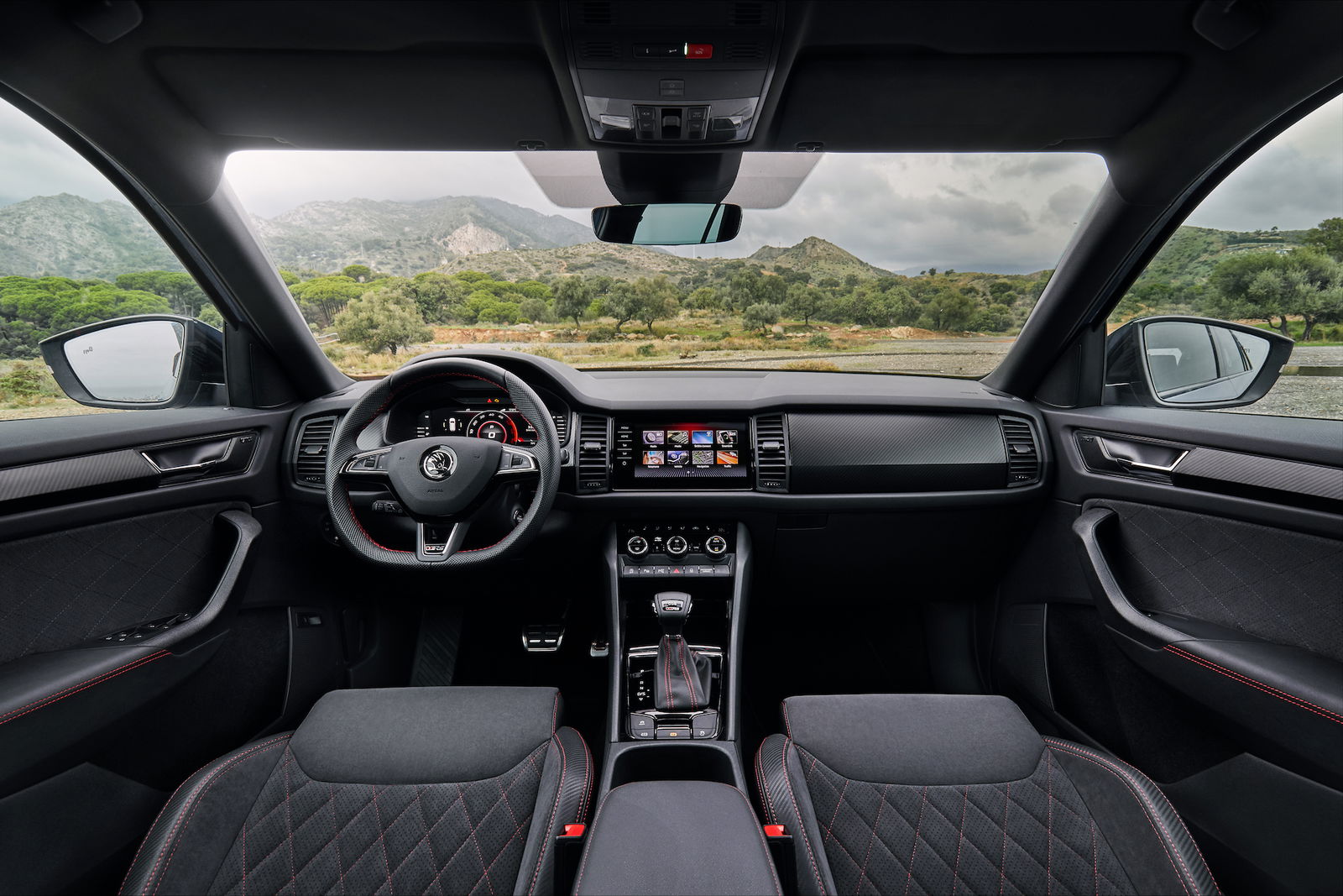 Quello che voglio capire è se questa Kodiaq ha le spalle abbastanza grosse da reggere il peso della sigla RS, che dal 1974 marchia le Skoda più cattive. E se è vero che l’auto si governa con il “lato B”, la Kodiaq comincia con il piede giusto, grazie a sedili contenitivi e comodi allo stesso tempo. L’abitacolo sembra quello di una monovolume: si possono scegliere cinque o sette posti, con i sedili in terza fila che non sono così sacrificati come si potrebbe credere. Con sette passeggeri il bagagliaio diminuisce fino a 230 litri, che diventano oltre 700 in versione cinque posti e ben 1.950 con i soli sedili anteriori in posizione. Non mancano poi le soluzioni furbe, tipiche del marchio ceco, come i poggiatesta posteriori con ali laterali per aiutare il riposo, la torcia elettrica nel vano bagagli o il raschietto del ghiaccio nello sportello del serbatoio. Mi sono piaciuti meno gli inserti in finto carbonio in plancia, che al tatto risultano un po’ rigidi e “croccanti”.