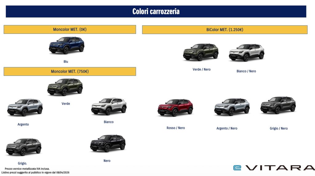Prima di passare alle impressioni di guida, i prezzi. Il listino parte da 36.900 euro. Per questa cifra si può scegliere tra la e Vitara 2WD in versione Top e la 4WD in versione Cool. Con 38.900 euro si compra invece la 4WD Top. L’allestimento Cool è già completo, sia chiaro, ma quello Top che giustifica alla grande il sovrapprezzo con dotazioni di alto livello. In ogni caso le cifre sono molto competitive e al momento fanno della e Vitara l’unico SUV elettrico a trazione integrale del mercato sotto i 40.000 euro. I soli optional sono le vernici speciali e le livree con il tetto a contrasto, come si vede nello specchietto qui sotto.