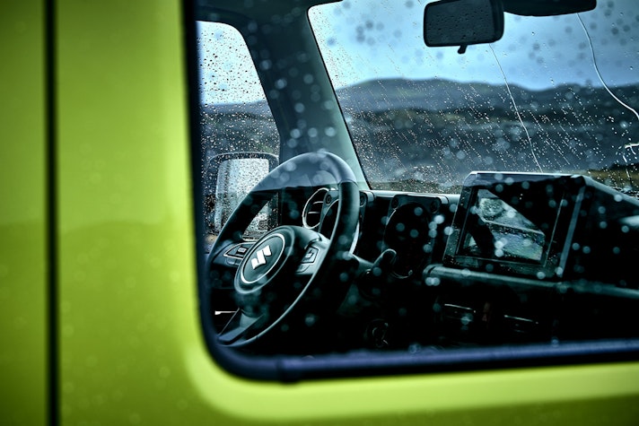 Le dimensioni del Jimny sono mini ma lo spazio per guidatore e passeggero per nulla sacrificato; i nuovi interni sono riusciti: tanta plastica sì, ma di buona qualità e piacevole aspetto, oserei quasi l’aggettivo “elegante” per alcuni particolari come il quadro degli strumenti e il display, circondati da cornici lucide. I sedili sono comodi, contenitivi quanto basta anche nella guida fuoristrada, pulsanti grandi e ben posizionati (anche se per un po’ ho continuato a cercare l’alzacristalli alla mia sinistra, sul bracciolo della portiera…), ben dimensionato anche il volante, con la praticità dei comandi integrati e piazzato al posto giusto anche il cambio, seguito dal selettore delle quattro ruote motrici e delle ridotte (tornato a grande richiesta di nuovo manuale).