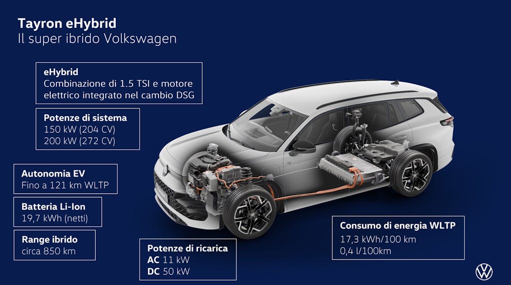 Ultima ma non meno importante, ho saggiato anche per un breve tratto la Tayron eHybrid. L’ibrida plug-in impiega il motore 1.5 TSI Evo2 insieme a un motore elettrico alimentato da una batteria da 19,7 kWh netti. Per evitare di somergevi di numeri e dati tecnici mi avvalgo ancora una volta di una immagine.