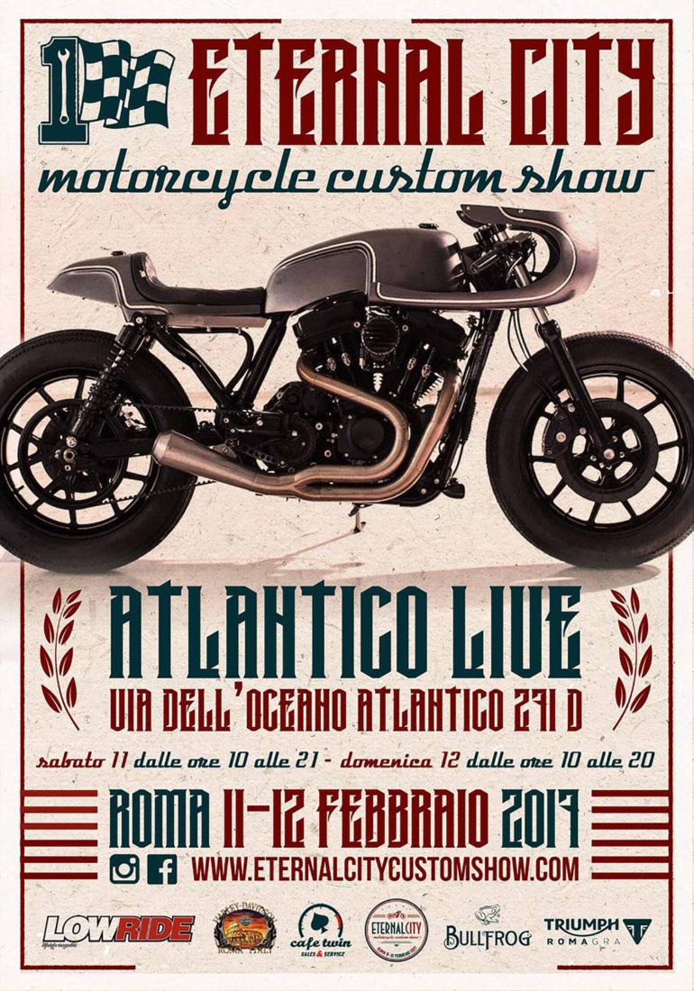 COSA: ETERNAL CITY CUSTOM SHOW, a Roma debutta la fiera del custom DOVE E QUANDO: Roma, 11-12 febbraioL’Eternal City Custom Show fa il suo debutto sabato 11 febbraio e punta a diventare un momento d’incontro alla scoperta dell’universo moto, con la benedizione di aziende e artigiani. L’evento, in programma all’Atlantico Live, a Roma, una struttura di 6.000 metri quadrati che ci concentra nel quartiere Eur, è organizzato in aree tematiche: produzione di serie, special, cafe racer, scrambler, vespe, lambrette, abbigliamento e accessori. Non mancheranno show e intrattenimento. Orari di apertura: sabato 11 febbraio dalle 10 alle 21; domenica 12 dalle 10 alle 20. Il biglietto d’ingresso costa 10 euro; i bambini fino ai 5 anni entrano gratuitamente. Per info: eternalcitycustomshow.com