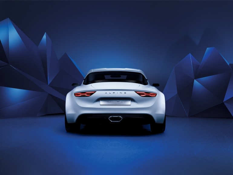Alpine Vision Concept riprende la linea slanciata e compatta della progenitrice A110 e può contare sulla collocazione centrale del motore. Quest’ultimo, stando a rumors recenti, un 4 cilindri 1.8 derivato dall’unità di 1,6 litri appannaggio di Renault Clio RS, pertanto forte dell’iniezione diretta della benzina, della sovralimentazione mediante turbocompressore e di almeno 250 cv (300 cv per la versione RS). Propulsore che dovrebbe consentire alla coupé di scattare da 0 a 100 km/h in 4,5 secondi. Un tempo, nemmeno a farlo apposta, identico a quanto dichiarato dalla più acerrima rivale che la transalpina troverà sul proprio cammino: Alfa Romeo 4C Coupé. Quanto alla trasmissione, le immagini diffuse lasciano intuire la presenza di un cambio automatico con paddle al volante; più precisamente un’unità a doppia frizione a 7 rapporti derivata dal sistema EDC utilizzato in gamma Renault. Una dotazione, anche in questo caso, identica a quanto riservato a 4C (sebbene con “sole” 6 marce).