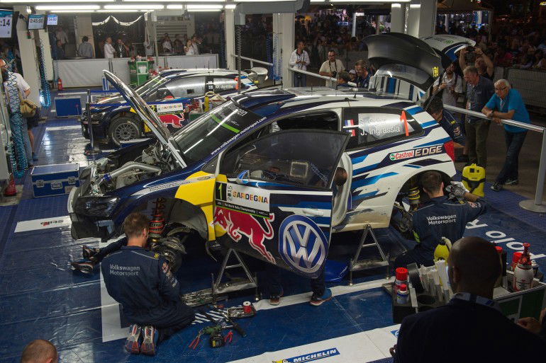 Sulla strada verso il Monte Lerno si sente un rumore cupo, di auto da corsa. Mi volto e dal finestrino del pullman vedo una Ford nera sorpassarci a tutta velocità. Al volante riconosco Robert Kubica, il campione polacco ex Formula 1, oggi rallysta mondiale, e in quel preciso momento capisco quanto è bello seguire una competizione del genere: anche se le auto si vedono solo per pochi istanti durante le prove speciali, nessun’altra disciplina motoristica permette di stare “dentro la gara” e a contatto con macchine e piloti come questa. Sébastien Ogier (F), Julien Ingrassia (F) Volkswagen Polo R WRC (2015) WRC Rally Italia Sardegna 2015Facciamo un passo indietro: siamo in Sardegna in occasione del Rally d’Italia, sesta prova del World Rally Championship. Il “Sardegna” non è un rally qualsiasi ma il più impegnativo della stagione con i suoi 1.500 km di lunghezza, di cui 400 di speciali su una terra resa secca dalla calura estiva e insidiosa da sabbia e pietre grosse come palloni da calcio.Arriviamo ad Alghero il venerdì sera. Qui c’è il “parco assistenza”, il luogo dove i campioni riportano le auto a metà e al termine delle giornate di gara per la necessaria manutenzioni e dove incontriamo gli uomini del team Volkswagen del campione del mondo in carica e leader di classifica Sébastien Ogier. Ci raccontano che il primo round di questo rally italiano è andato alla Hyundai, la rivale più insidiosa della squadra tedesca, dopo una lotta sul filo dei secondi tra Hayden Paddon, pilota neozelandese al volante della Hyundai i20 WRC, e il francese Ogier su Volkswagen Polo R, staccato al termine della lunga giornata di soli 8,8 secondi.Non c’è però da preoccuparsi – ostentano sicurezza in Casa VW – perché il rally è lungo e Séb (Ogier) sa quando è il momento di spingere sull’acceleratore.Il mattino dopo torniamo al box Volkswagen dove ad accoglierci c’è Fabrizio, meccanico italiano del team VW Motorsport, che segue la squadra n. 2 di Mikkelsen e Floene.Mechanics WRC Rally Italia Sardegna 2015Dai suoi occhi vispi e dalle parole svelte traspare una passione sfrenata: con orgoglio ci racconta qualche numero della squadra Volkswagen impegnata nel mondiale rally. Sono 7 i bilici in giro per l’Europa, 54 le persone tra meccanici e ingegneri, cuoco e staff, oltre a 15 addetti dedicati al marketing. 28 pneumatici per ogni gara e 18 (!) paraurti.Noto all’interno del box un display che indica 45 minuti. Fabrizio mi spiega che si tratta del tempo massimo che per regolamento i meccanici possono dedicare a sistemare le auto alla sera quando rientrano in assistenza.Non sarà troppo poco? Se il tempo scarseggia i piloti possono dare una mano ai meccanici? Fabrizio storce il naso e mi risponde che “non sta bene” che pilota e navigatore mettano le mani sulla macchina. e comunque il tempo concesso dal regolamento è sufficiente per risolvere ogni problema.RallySardegna201500013Dopo la chiacchierata nel box Volkswagen ci avviamo verso la partenza della prova speciale n. 15 “Ozieri-Ardara”. Questa speciale è famosa perché passa accanto a una suggestiva chiesa medioevale: il pubblico si assiepa sui caratteristici muretti a secco che delimitano i campi aridi e la strada della speciale. Fa caldissimo e gli organizzatori si affannano a mantenere ordine e a far rispettare ai tifosi più scalmanati le distanze di sicurezza.Distanziati di due minuti l’uno dall’altro, i campioni sfrecciano come palle di fucile tra le strade strettissime del tracciato, facendo la barba ai muretti. Lo spettacolo dura pochi secondi, poi spariscono dietro la collina.Durante la giornata assistiamo a un’altra speciale, l’ultima in programma il sabato. Lunga più di 40 km, si attorciglia attorno al Monte Lerno, sotto le cui pendici ci fermiamo per assistere alla prova. Da quel punto riusciamo a vedere un lungo tratto di curvoni in discesa che i piloti affrontano a velocità pazzesche ma con precisione ed eleganza incantevoli.Andreas Mikkelsen (NOR), Ola Fløene (NOR) Volkswagen Polo R WRC (2015) Andreas Mikkelsen (NOR), Ola Fløene (NOR) Volkswagen Polo R WRC (2015) WRC Rally Italia Sardegna 2015Alla fine della discesa c’è una curva stretta dove le auto scaricano tutti i 320 cv dei motori 4 cilindri 1.6 di cilindrata. In uscita dalle ruote posteriori ad ogni accelerazione parte una sassaiola verso il pubblico. Ma il gioco dei tifosi più temerari è proprio quello di stare il più vicino possibile ai beniamini, anche a costo di prendersi una pietra addosso.Come anticipato dagli uomini Volkswagen, il campione del mondo Ogier va all’attacco e prova dopo prova nella giornata di sabato recupera parecchi secondi, complici guai meccanici alla Hyundai di Paddon, tanto che a fine giornata il francese in classifica è davanti a tutti. Attorno alle 21 circa (la gara è partita alle 7 del mattino) attendiamo il rientro al parco assistenza: il campione francese ci ripaga dell’attesa entrando nel box in sgommata. Parte il cronometro: 45 minuti per sistemare l’auto e poi tutti a nanna in attesa dell’ultima mezza giornata di gara.Sébastien Ogier (F), Julien Ingrassia (F) Volkswagen Polo R WRC (2015) WRC Rally Italia Sardegna 2015Le quattro prove speciali del Rally d’Italia di domenica mattina vedono ancora una volta duellare il campione del mondo Sébastien Ogier (Volkswagen Polo) e Hayden Paddon, che al volante della sua Hyundai i20 non si perde d’animo, tallonando per tutta la mattinata il rivale. Riusciamo a gustarci anche un’altra prova speciale, vista mare questa volta, caratterizzata da un salto spettacolare su un cambio di pendenza.Rientriamo al parco assistenza giusto in tempo per goderci insieme ai meccanici Volkswagen l’arrivo dell’ultima prova. Alla fine trionfa Séb Ogier, seconde e terze le Hyundai i20 di Hayden Paddon e Thierry Neuville. Ed è davvero significativa la sportività dimostrata dagli uomini del team tedesco, da cui parte un applauso spont
