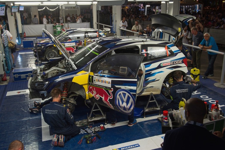 Facciamo un passo indietro: siamo in Sardegna in occasione del Rally d’Italia, sesta prova del World Rally Championship. Il “Sardegna” non è un rally qualsiasi ma il più impegnativo della stagione con i suoi 1.500 km di lunghezza, di cui 400 di speciali su una terra resa secca dalla calura estiva e insidiosa da sabbia e pietre grosse come palloni da calcio.Arriviamo ad Alghero il venerdì sera. Qui c’è il “parco assistenza”, il luogo dove i campioni riportano le auto a metà e al termine delle giornate di gara per la necessaria manutenzioni e dove incontriamo gli uomini del team Volkswagen del campione del mondo in carica e leader di classifica Sébastien Ogier. Ci raccontano che il primo round di questo rally italiano è andato alla Hyundai, la rivale più insidiosa della squadra tedesca, dopo una lotta sul filo dei secondi tra Hayden Paddon, pilota neozelandese al volante della Hyundai i20 WRC, e il francese Ogier su Volkswagen Polo R, staccato al termine della lunga giornata di soli 8,8 secondi.Non c’è però da preoccuparsi – ostentano sicurezza in Casa VW – perché il rally è lungo e Séb (Ogier) sa quando è il momento di spingere sull’acceleratore.Il mattino dopo torniamo al box Volkswagen dove ad accoglierci c’è Fabrizio, meccanico italiano del team VW Motorsport, che segue la squadra n. 2 di Mikkelsen e Floene.