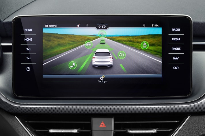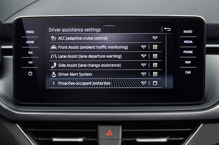 Infine, la sicurezza: come vedete dall’immagine qui sopra la Skoda Kamiq può vantare mantenitore attivo di corsia e frenata d’emergenza in città con dispositivo di riconoscimento pedoni di serie. A pagamento si può avere il cruise control adattivo (con funzione stop&go insieme al cambio DSG), il rilevatore di veicoli nell’angolo morto, il sistema di abbaglianti automatici e la frenata automatica nelle manovre di parcheggio.