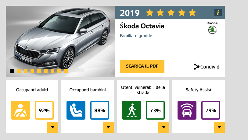 Cinque stelle, ovvero massimo punteggio nei crash test Euro NCAP per Skoda Octavia, nelle due versioni wagon e berlina. La best-seller della Casa boema ha ottenuto il 92% nelle valutazioni che riguardano la protezione degli occupanti adulti, l’88% dei punti disponibili per la protezione dei bambini e il 79% per i suoi sistemi di assistenza. La produzione della quarta generazione di Octavia è già iniziata. L’appuntamento con il mercato italiano è fissato nel secondo trimestre del 2020.