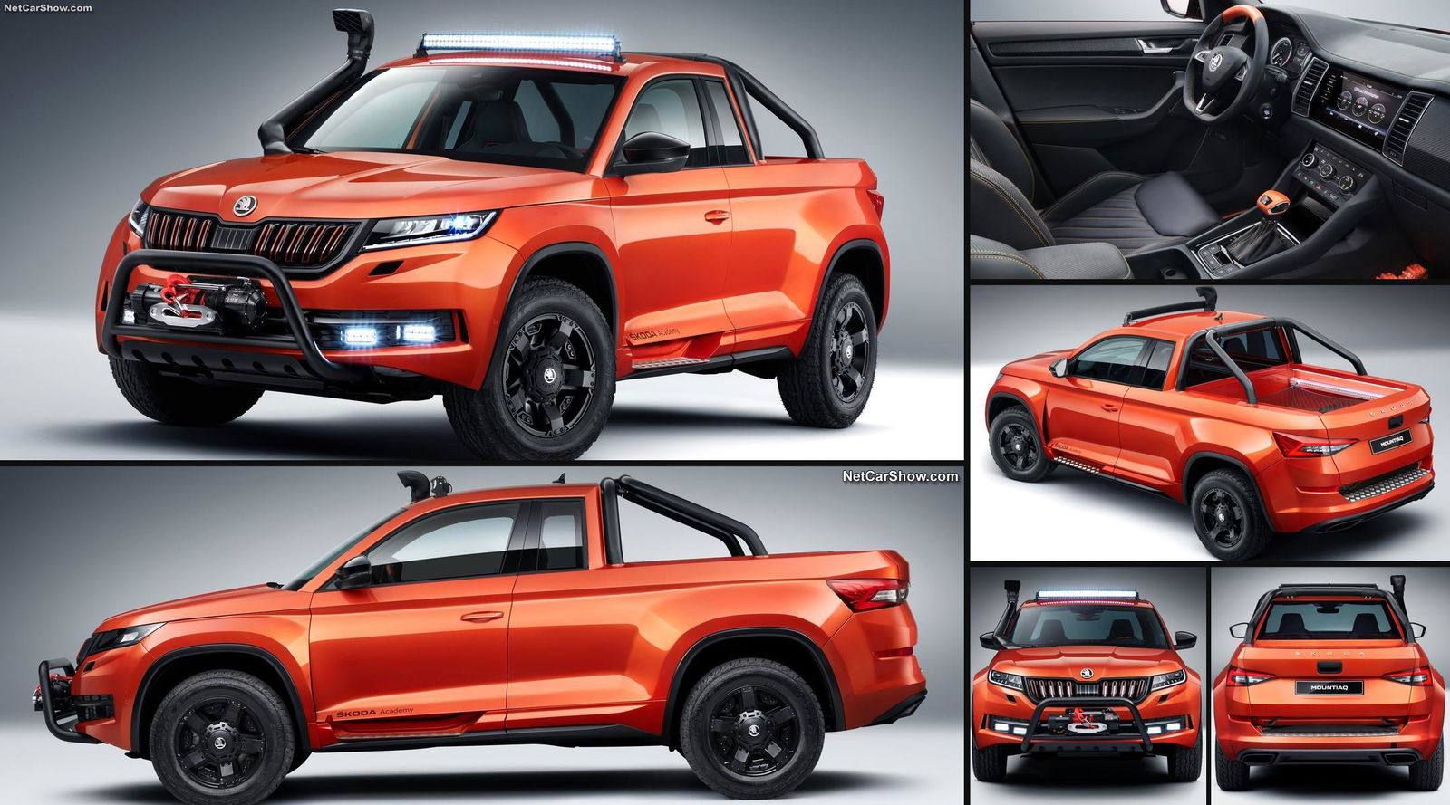 Barra luci posizionata sul tetto e un frontale caratteristico che include verricello, bull-bar e fari speciali in livrea Sunset Orange. Ecco come si presenta la concept car Mountiaq, frutto di 2.000 ore di lavoro di 35 praticanti della Škoda Vocational School. I giovani hanno tratto ispirazione dalla SUV Kodiaq e dato forma a un pick up che punta tutto su design e capacità off-road.