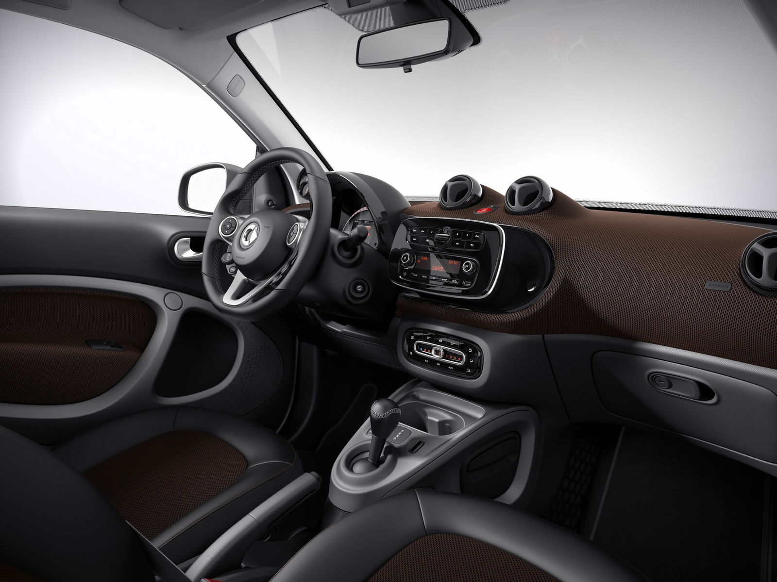 La fortwo, l’utilitaria più corta sul mercato – è lunga solo 2,69 m – si aggiorna. La novità principale è rappresentata dalla disponibilità di serie, sin dall’allestimento entry level youngster, della frenata automatica d’emergenza e dei fendinebbia. Un upgrade in materia di sicurezza tutt’altro che marginale, esteso anche alla versione a quattro posti forfour.Tessuto ed ecopelle per la PerfectRispetto al passato, le dotazioni di tutti gli allestimenti sono più ricche. La versione Passion, ad esempio, può contare sui nuovi cerchi in lega da 15 pollici cui si aggiungono il frangivento per la fortwo cabrio e la possibilità di avere la cellula di sicurezza Tridion, vale a dire l’esoscheletro in acciaio distintivo della produzione smart, in nero o argento. Non ci sono novità per la Proxy che, anzi, esce di scena in favore dell’inedito livello Perfect. Questi condivide gli accessori con la Passion, distinguendosi per gli abbinamenti cromatici interni in tessuto marrone ed ecopelle brown o black, le cuciture a contrasto e le finiture nere della plancia. Un ulteriore plus consiste nel pacchetto Led & Sensor, di serie, che ai classici fari alogeni abbina i gruppi ottici posteriori a Led e i sensori luci/pioggia.