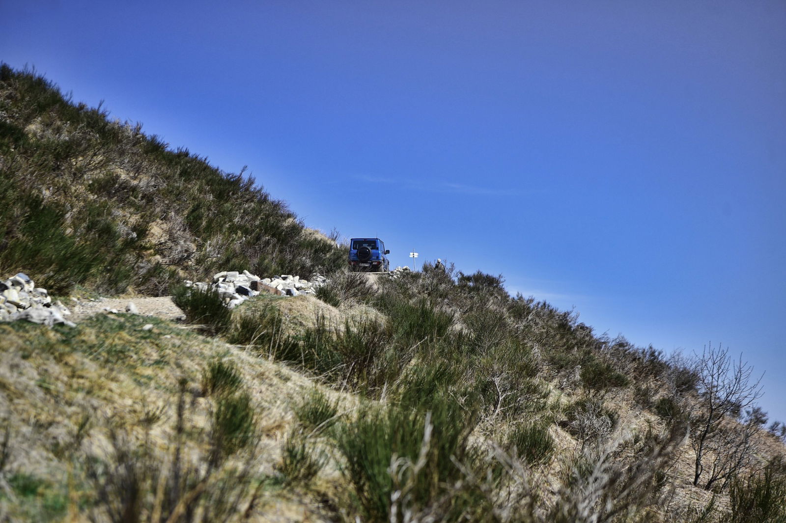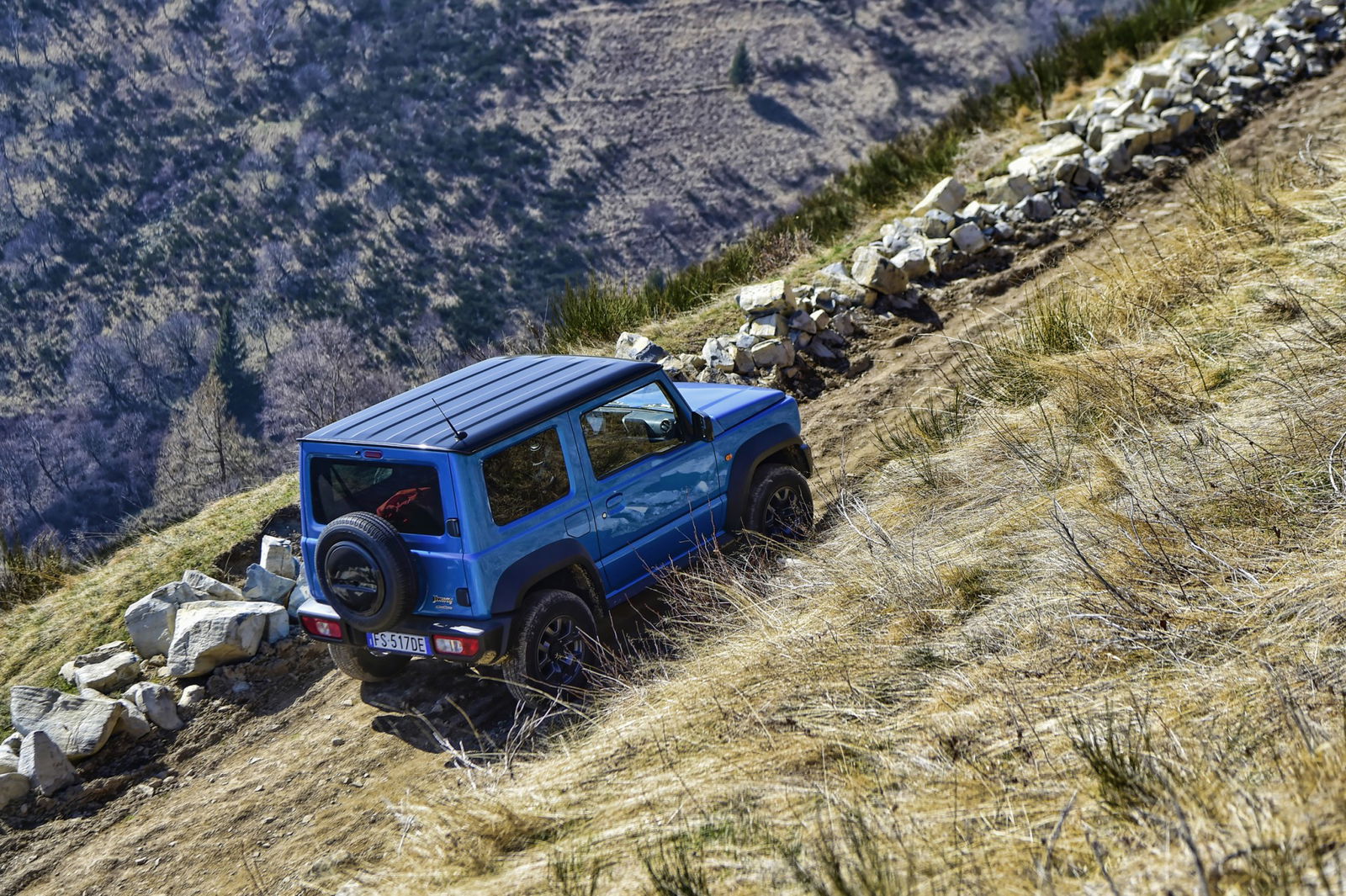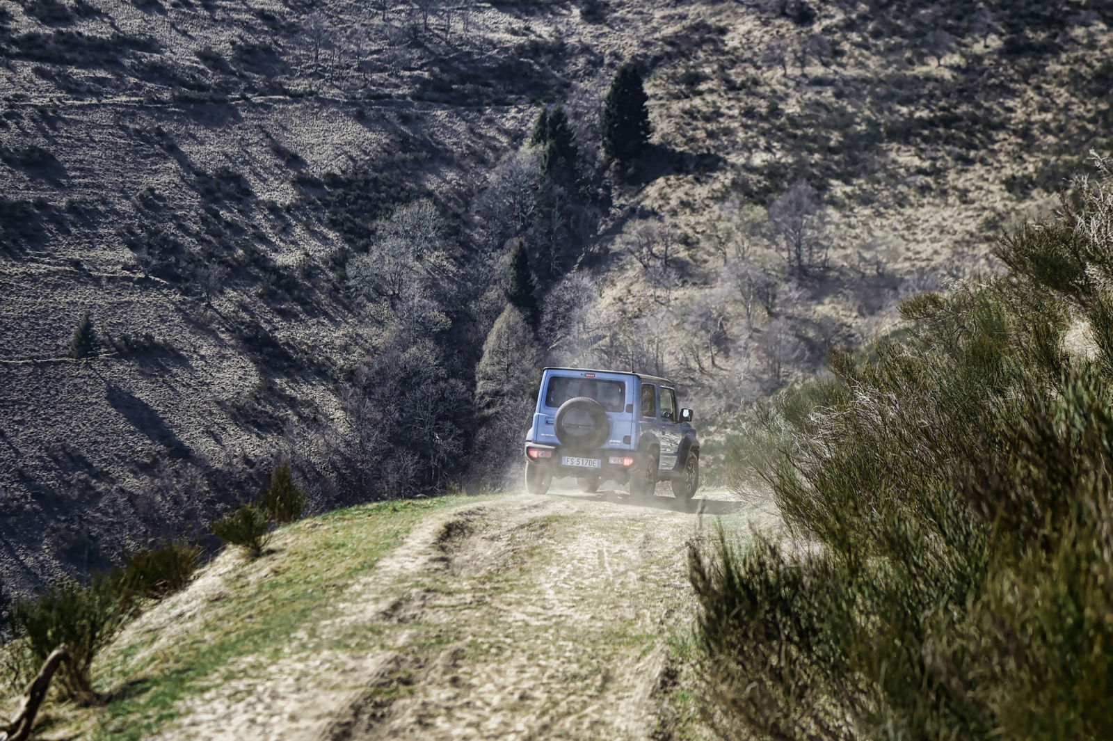 Per la nuova Jimny, Suzuki ha deciso che la versione sarebbe stata solo una, full-optional (ci sono anche i sedili riscaldabili), prendere o lasciare. L’unica cosa che si potrebbe quindi desiderare è un treno di gomme aggressive per il fuoristrada, ma a noi non sarebbero servite: anche con le Bridgestone Dueler H/T di serie, basta affidarsi alla trazione integrale abbinata alle ridotte per rampare su qualsiasi fondo compatto e mediamente sconnesso, come quelli con i quali avremmo avuto a che fare noi nel nostro compito di ricognizione e tracciatura del percorso della skyrace. Il campo di gara è molto esteso, variegato e percorribile per la maggior parte del suo sviluppo solo sulle gambe. Il nostro obiettivo era dunque quello di avvicinarci il più possibile alla traccia, quindi raggiungerla e seguirla a piedi per marcare bivi ed eventuali passaggi non immediati.