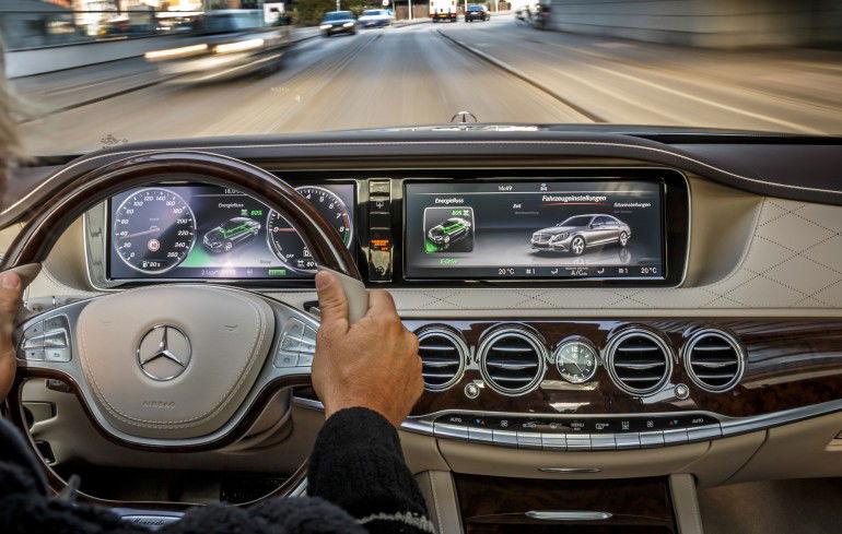 Raggiunto il cartello “Stuttgart” la domanda è sorta spontanea “E adesso chi lo porta questo panzer fra le vie del centro…”. Domanda fuoriluogo. Non solo ci siamo destreggiati fra gli stretti sensi unici ma, arrivati a destinazione, siamo pure scesi nel microscopico parcheggio sotterraneo e, fra una colonna di cemento e un paraurti sporgente, abbiamo infilato la S 500 nella sua nicchia con precisione chirurgica. In tutto ciò io mi ero appena svegliato dopo un pisolo da vero uomo d’affari con la testa appoggiata al favoloso cuscino che ricopre il poggiatesta, avvolto nella rilassante atmosfera creata dalle sette tonalità di luce soffusa selezionabili a seconda dell’umore. Se tutto ciò non bastasse, sappiate che tra l’infinita lista degli optional ci sono anche la pre-climatizzazione, che consente di salire in macchina trovando il microclima impostato per l’ora di partenza, e anche una speciale telecamera a 360° che mostra la macchina e l’area circostante anche con una bird view (una vista dall’alto) virtuale…