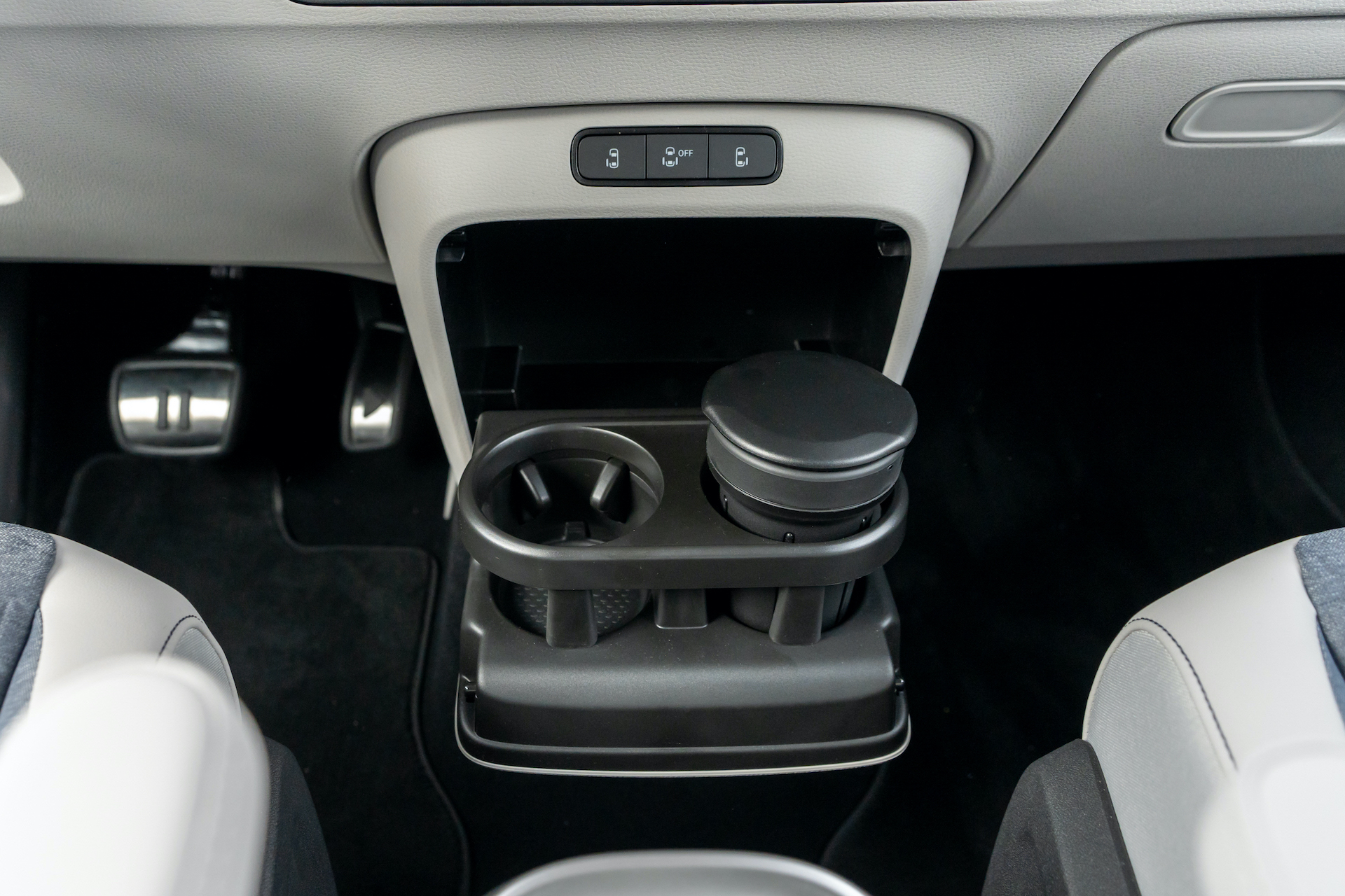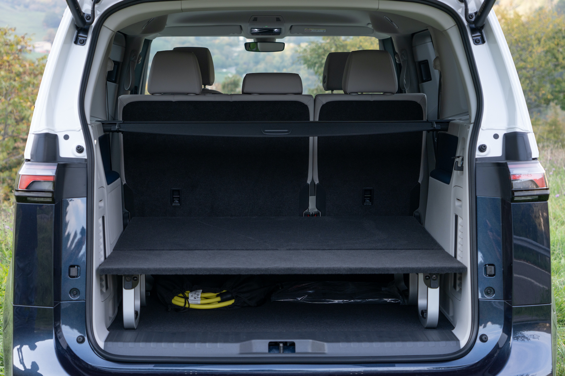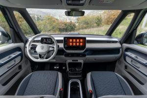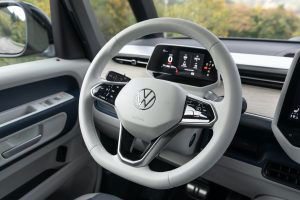 Nell’abitacolo, i punti di forza dell’ID.Buzz sono tanti, il primo dei quali è il passo pari a 2,98 metri. Una distanza notevole tra l’asse anteriore e quello posteriore che, unito alla considerevole altezza della carrozzeria, regala un volume interno pazzesco. Il modello provato, come tutti quelli in arrivo nella prima fase della commercializzazione, è a cinque posti: lo spazio è insuperabile in ogni direzione, davanti e dietro ma anche nel bagagliaio: il vano di carico tocca i 1.121 litri in configurazione 5 posti e 2.123 litri abbattendo gli schienali della seconda fila.
