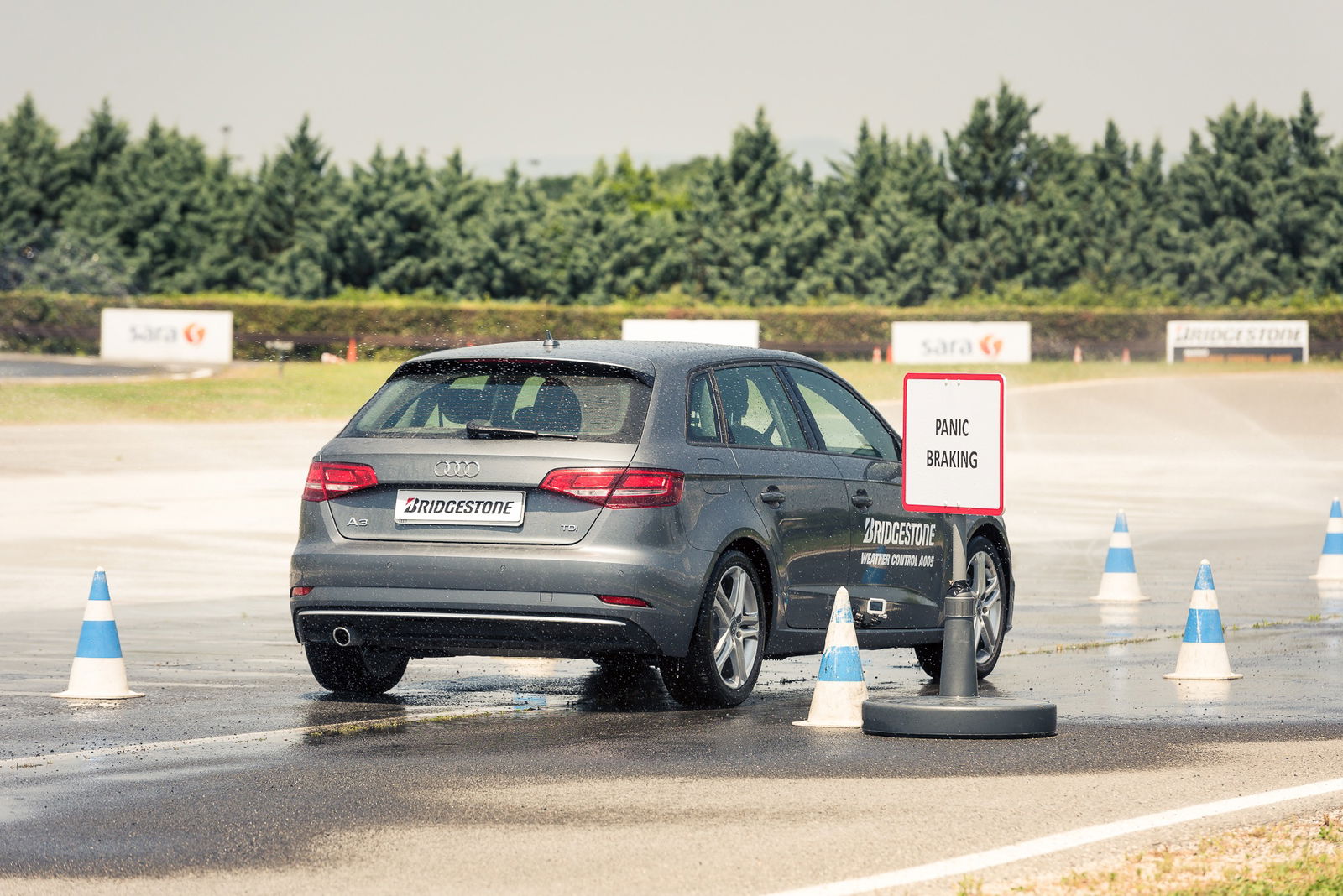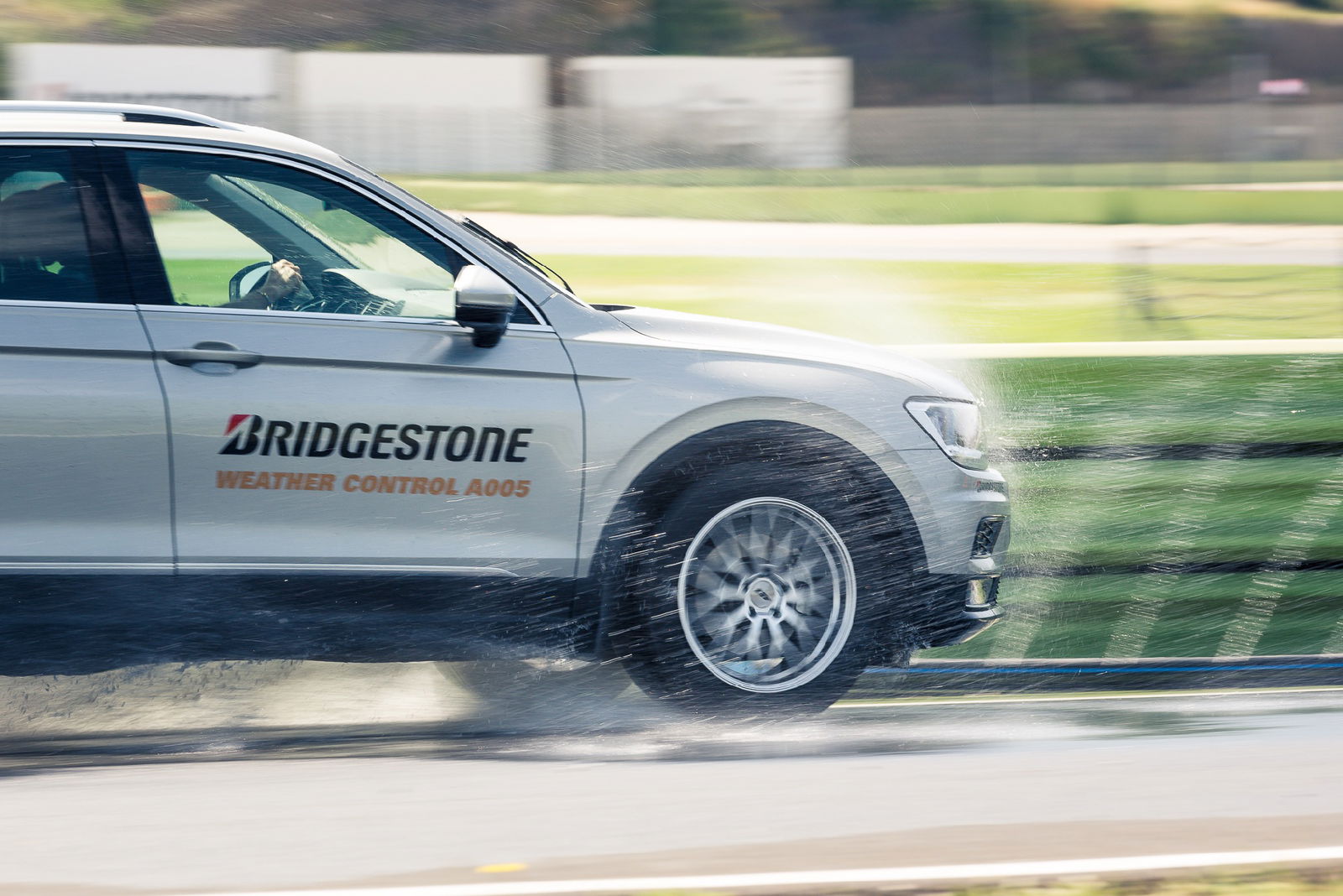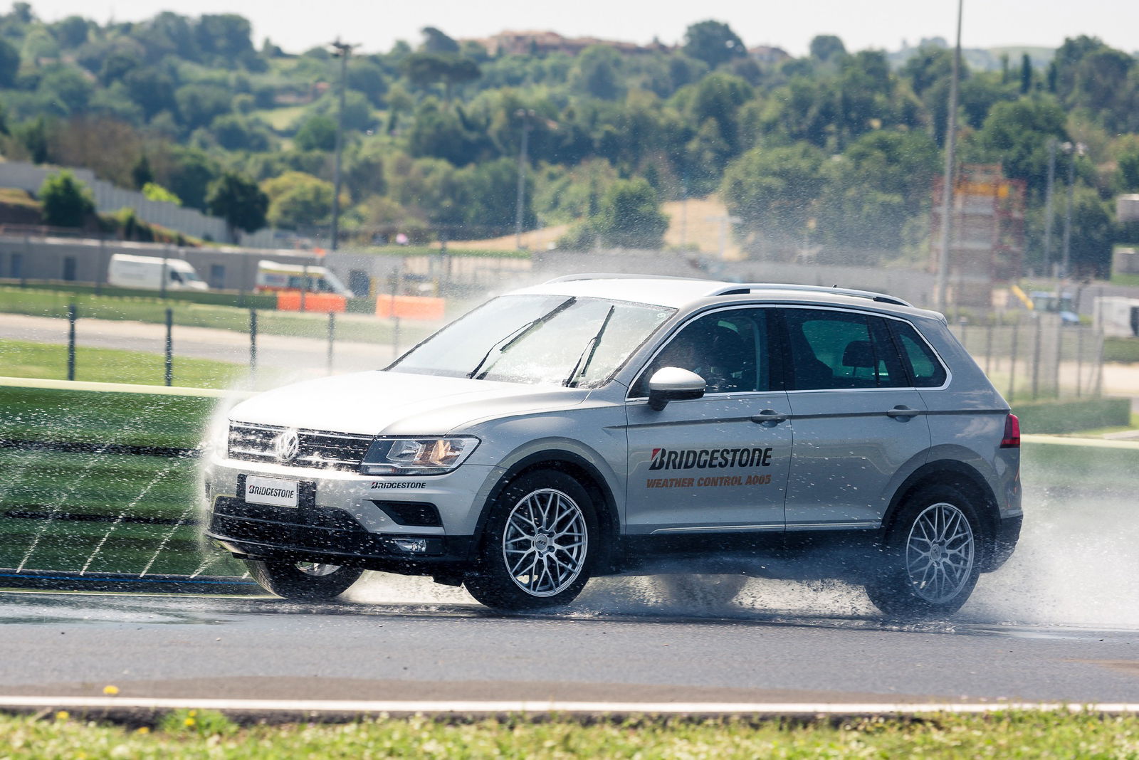 Non temono il bagnatoImmancabili, dunque, la prova di frenata d’emergenza da 70 km/h (il cosiddetto “panic stop”) e una a bassa velocità con le ruote sterzate (condizione che può verificarsi nella guida in città per evitare un microtamponamento o schivare un pedone disattento); in aggiunta, un cambio di corsia veloce e la percorrenza di una curva lenta, con forte carico laterale. Davvero soddisfacente il comportamento in frenata: nonostante l’asfalto fosse abbondantemente allagato, alla pressione del pedale del freno le Weather Control A005 trovato rapidamente aderenza, scivolando pochissimo e facendo lavorare l’ABS nel modo più appropriato. D’altra parte, i tecnici Bridgestone hanno sottolineato come la A005 abbia ottenuto, nei test eseguiti secondo lo standard Tüv Süd con una Volkswagen Golf 1.6 TDI, spazi di frenata sul bagnato inferiori di 3 metri rispetto al concorrente di riferimento, che la casa ha individuato nel Michelin CrossClimate+ (su neve, invece, il vantaggio è di 2 metri).