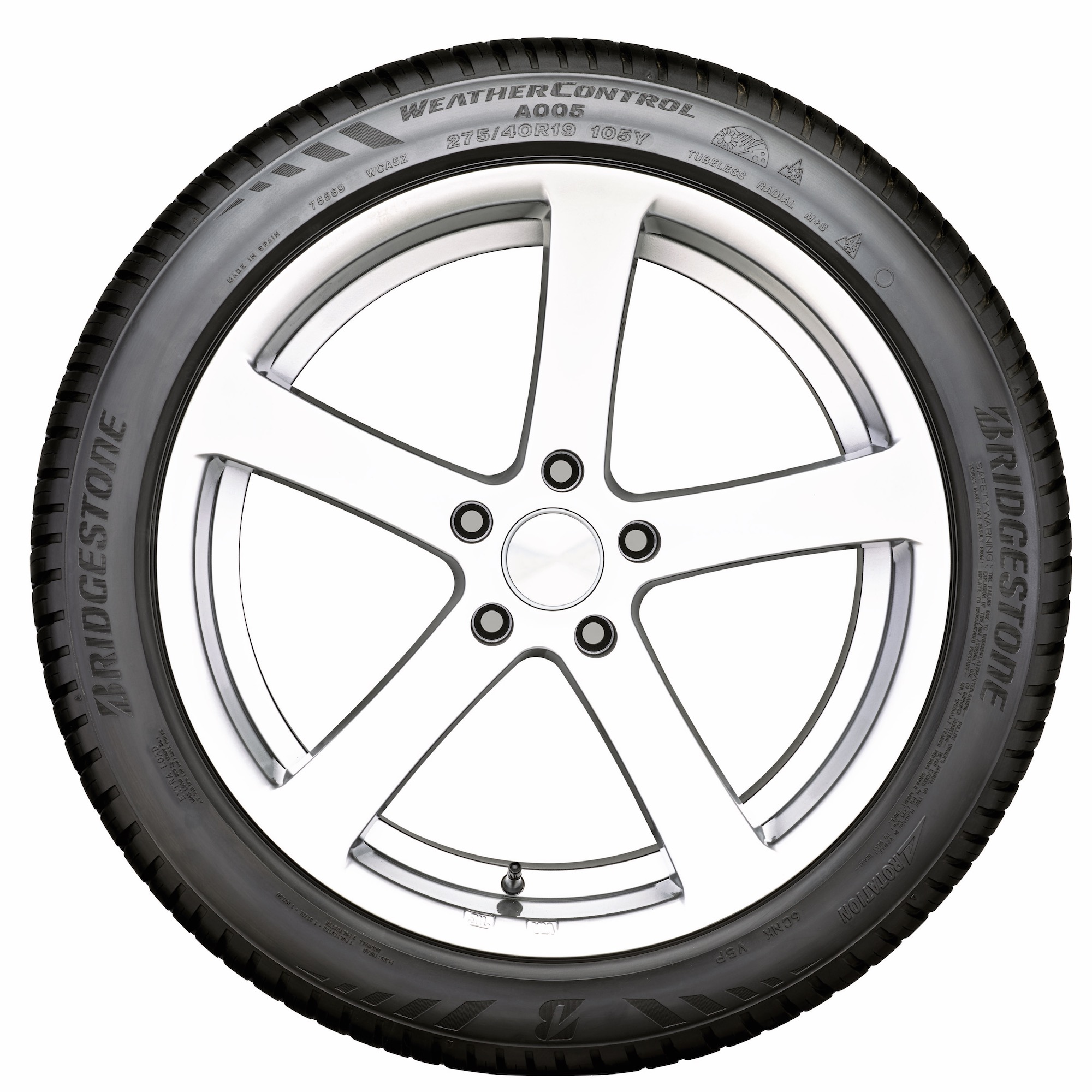 Mescola esclusivaLa mescola utilizzata per le “all season” Bridgestone, ad alto tenore di silicio, è stata studiata ad hoc, basandosi anche sull’esclusiva tecnologia NanoPro-Tech, che riduce la resistenza al rotolamento e quindi i consumi. L’obiettivo era quello di ottimizzare l’interazione della mescola stessa con la carcassa e con il disegno del battistrada, così da ottenere prestazioni equilibrate in tutte le condizioni di utilizzo. Il tutto senza trascurare la durata chilometrica, che secondo la casa è paragonabile a quella delle estive Bridgestone Turanza T005; aspetto, quest’ultimo, non scontato per una copertura che vanta non solo la marcatura M+S, ma anche e soprattutto l’omologazione 3PMSF (3 peak mountain snowflake), ossia il simbolo del fiocco di neve all’interno di una montagna stilizzata che siamo abituati a vedere sulle invernali vere e proprie. Infine, il costruttore rimarca che le Weather Control A005 sono in classe A – la migliore – per quanto riguarda l’aderenza sul bagnato, uno dei parametri riportati nell’etichetta europea che da fine 2012 deve corredare gli pneumatici.