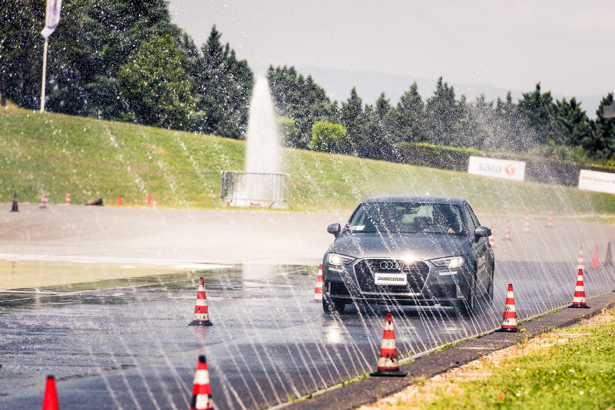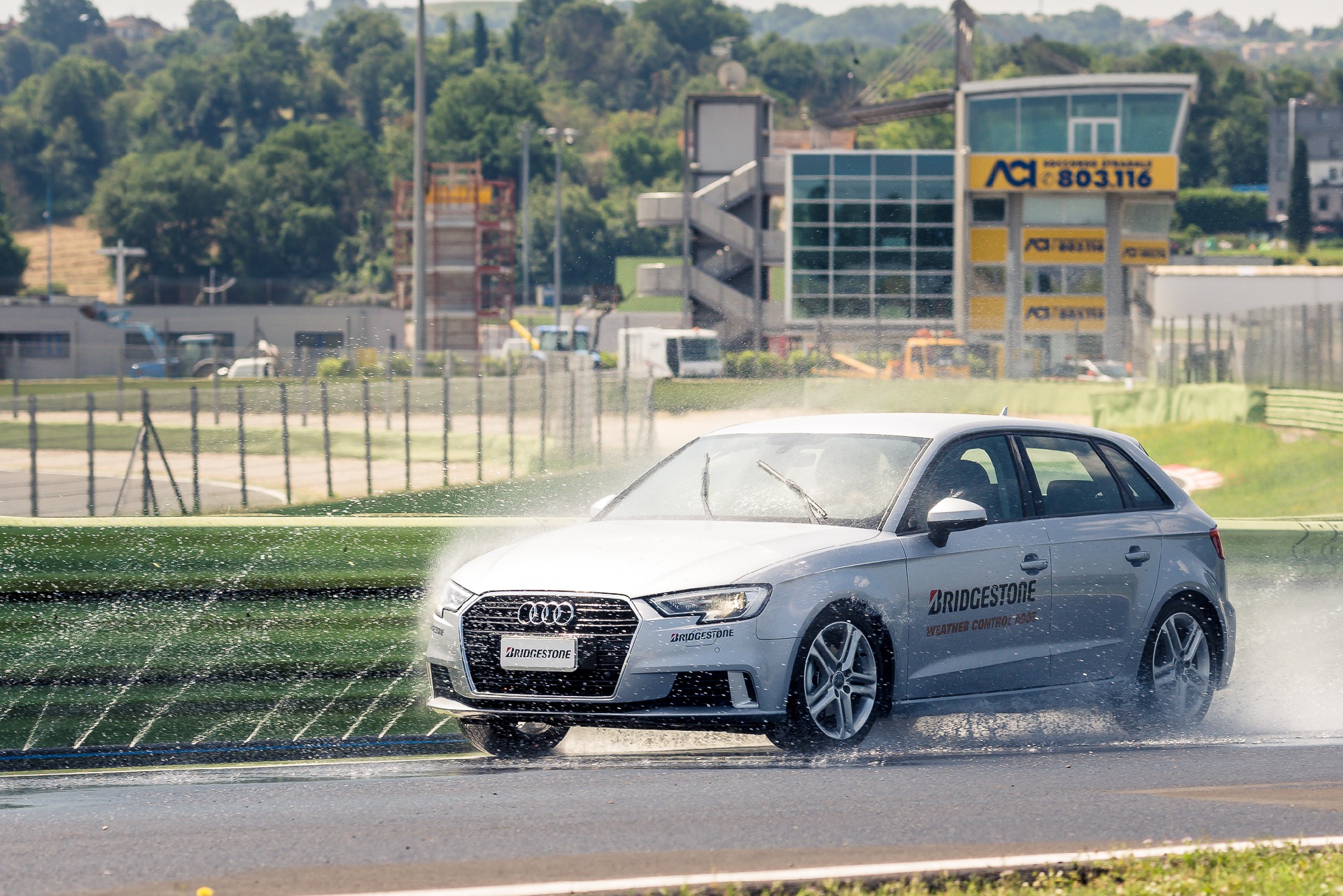 Rassicuranti anche in velocitàPremesso che un giudizio definitivo potrebbe essere espresso soltanto confrontando le nuove Weather Control A005 con le principali concorrenti e a parità di condizioni, la stessa sensazione di sicurezza l’abbiamo riscontrata in un’altra prova, consistente nel percorrere un veloce e lungo tornante – sempre allagato – alla velocità di 90 km/h: secondo la Bridgestone è una condizione critica che replica efficacemente quel che accade quando ci si immette un po’ troppo “allegramente” in una rampa autostradale. In questo caso l’aderenza non ci ha deluso nemmeno quando abbiamo messo di proposito in crisi l’assetto, rilasciando bruscamente l’acceleratore e “chiudendo” lo sterzo per innescare l’intervento dell’Esp. Una breve sessione di guida su strade statali a fine giornata ci ha consentito di apprezzare – almeno fino alla velocità di 90 km/h – il comfort assicurato dalla capacità di assorbimento delle asperità e dalla trascurabile rumorosità di rotolamento.