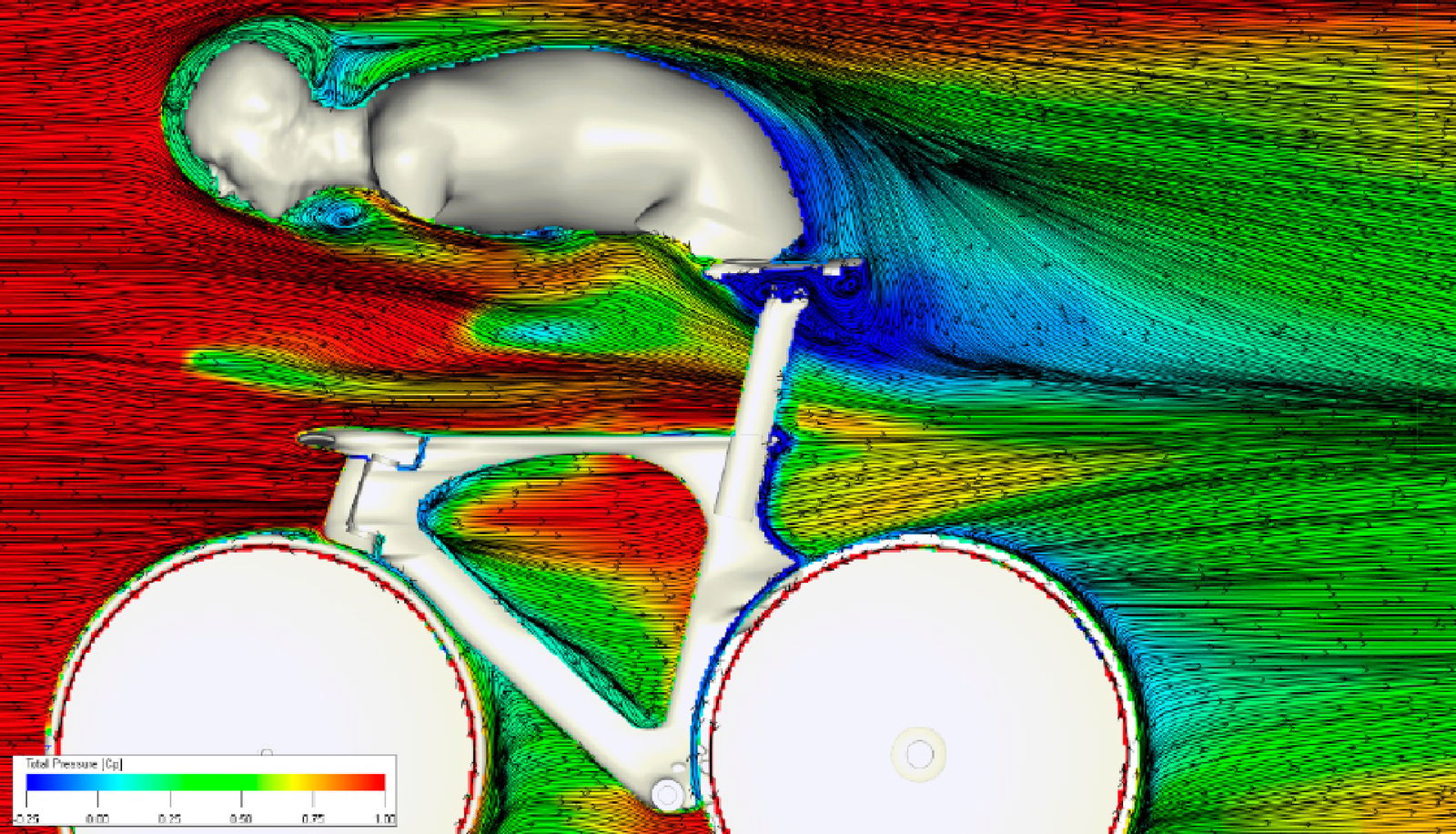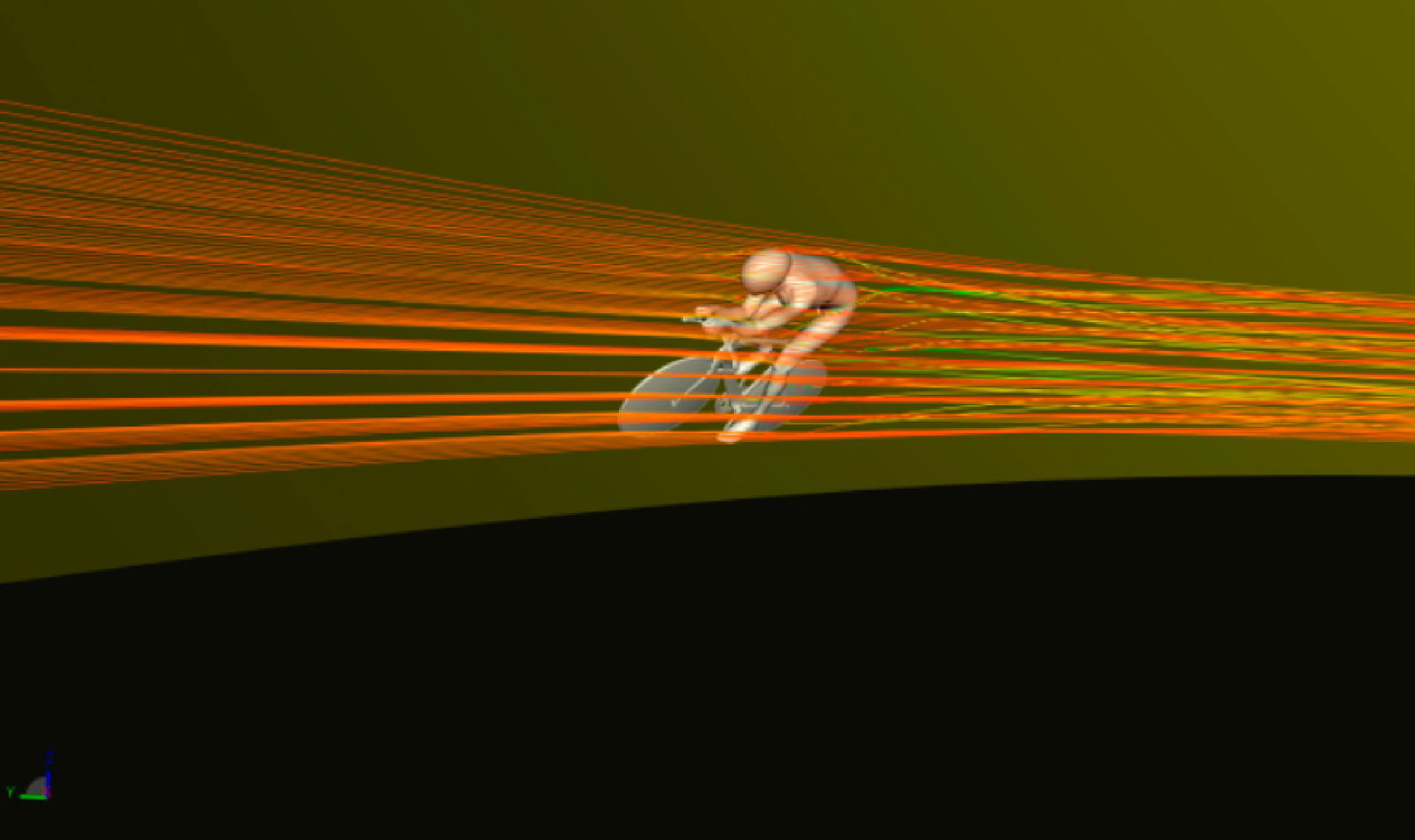 Durante tutta la fase di sviluppo è stato anche passato molto tempo in galleria del vento per misurare i risultati e valutare i miglioramenti del progetto. Sono stati studiati l’efficienza della bici e del complesso bici+atleta attraverso analisi di CFD (Computational Fluid Dynamics), che usa metodi numerici e algoritmi per risolvere i problemi che coinvolgono flussi di fluido. Senza mai dimenticare che la pista ha una lunghezza di 250 m e un banking (pendenza in curva) di 42°, quindi sviluppando la bici per ottenere il massimo in questa particolare condizione di percorrenza.