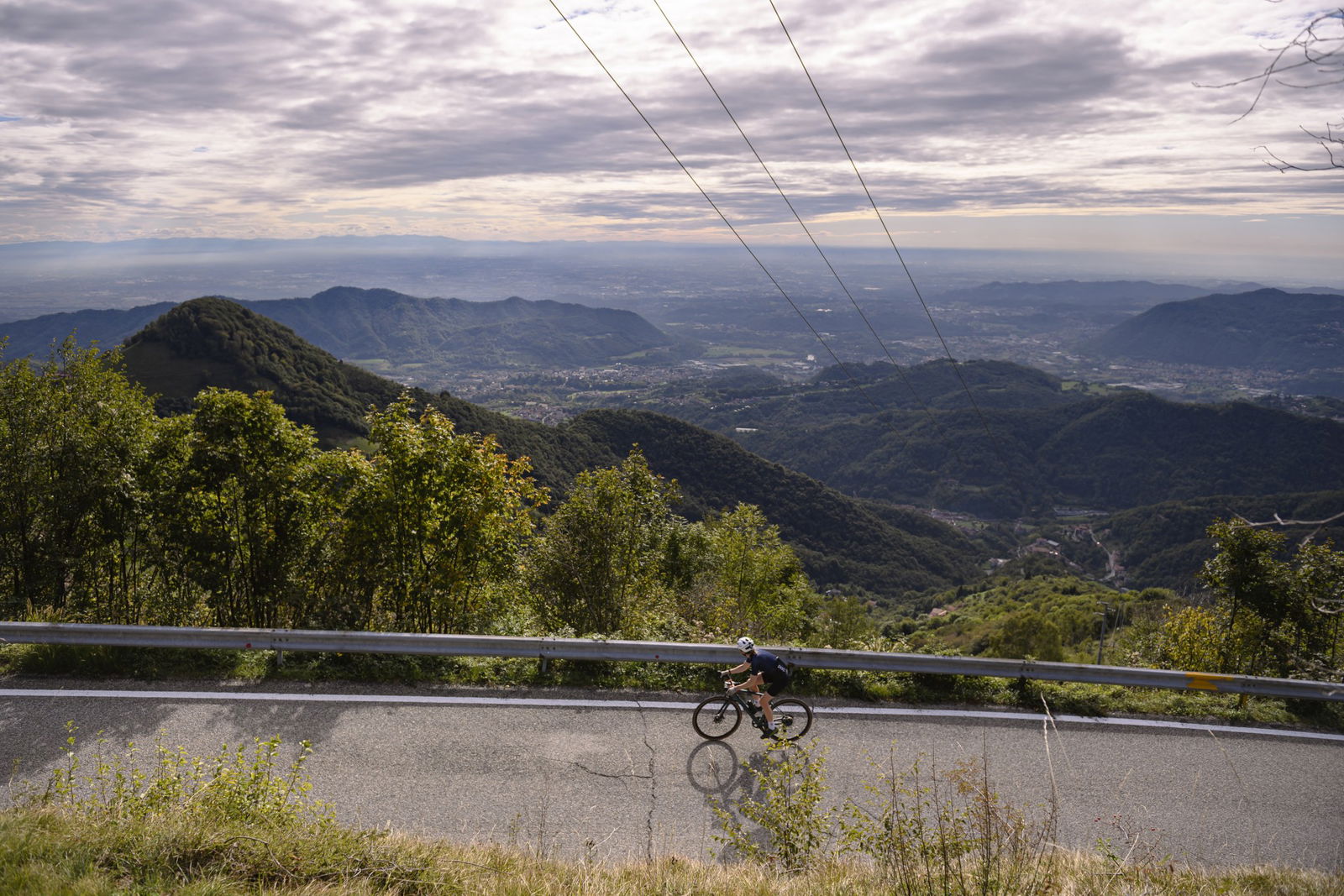 Molto sudore, tanta fatica e qualche imprecazione. Ci capita anche di spingere la bici per qualche decina di metri ma fa parte di un piacere lungo duecento chilometri. La nostra velocità media sale e scende di continuo, ma non ci importa, questa volta i Watt non ci interessano. La testa è altrove, perché riusciamo finalmente a pedalare dove volevamo, attraverso un paesaggio che ci ha stuzzicato nel corso degli anni, percorrendo stradine e sentieri che avevamo fino a oggi solamente guardato dal boro della strada e che ci erano sembrati troppo dissestati o semplicemente troppo remoti per essere considerati. Viviamo dunque ogni stop e ogni deviazione come una novità e persino le ciclabili riescono a darci un brivido di eccitazione… La discesa dei 19 tornanti di Selvino – un tratto che percorreranno anche i professionisti – ce la godiamo al tramonto e si trasforma in una veloce corsa verso la Città Alta di Bergamo. Lo stimolo dei pro, che sarà anche la loro ricompensa, è un posto sul podio, il nostro è una fumante Quattro Stagioni, con vista sulle luci della città.