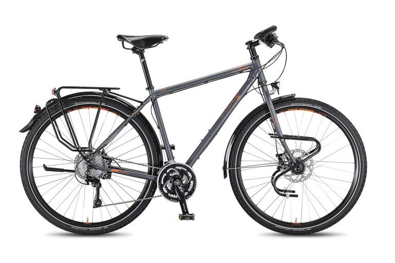 Ha la mountain bike nel proprio DNA: la bicicletta austriaca può contare su ruote da 29 pollici con pneumatici Schwalbe Marathon Mondial, telaio in acciaio con forcella rigida, freni a disco Shimano RT68 CL e cambio, sempre Shimano, della serie XT (3x10v) con guarnitura 48/36/26 e pacco pignoni 11/34. Dotata di serie di parafanghi, portapacchi e della dinamo integrata nel mozzo anteriore, è equipaggiata con una elegante sella Brooks B17 dal look vintage. Dispone di tre attacchi per portaborraccia e ha scelto di sacrificare la leggerezza a vantaggio della robustezza – pesa 16,4 kg –, costa 2.099 euro.