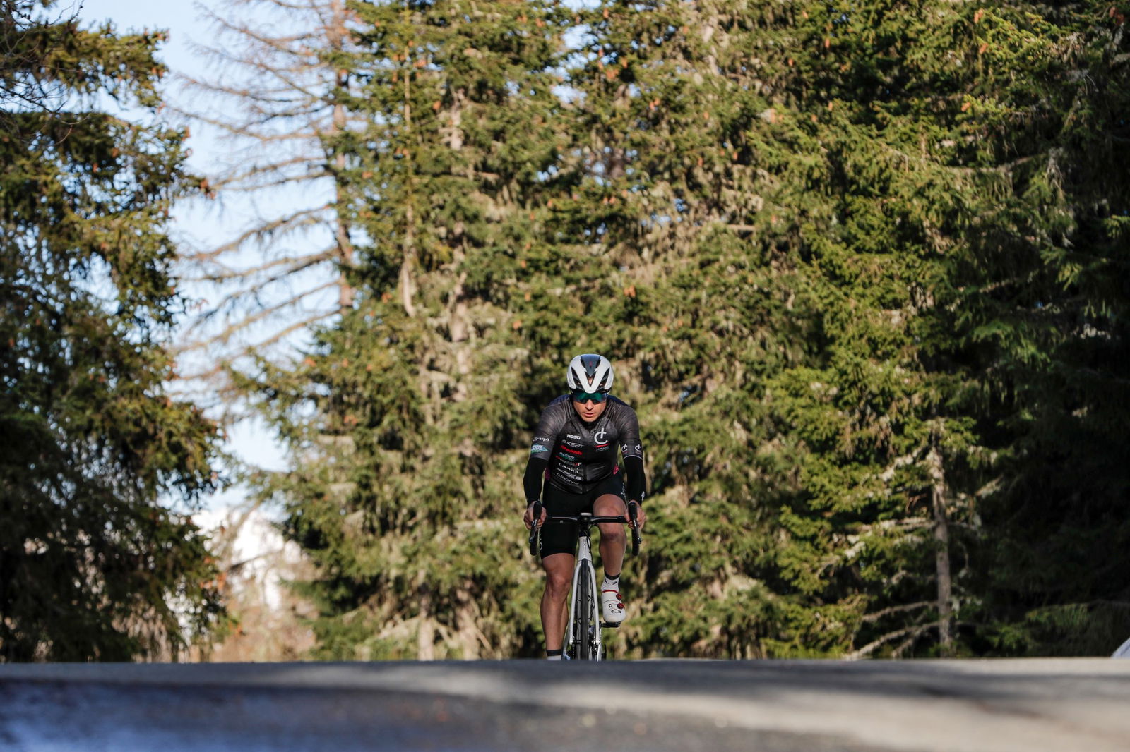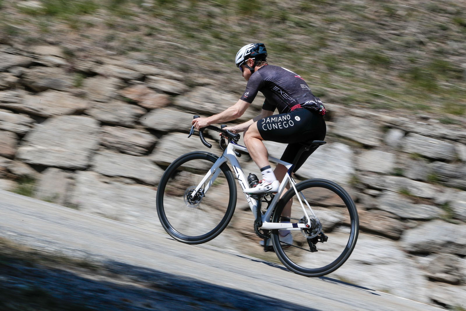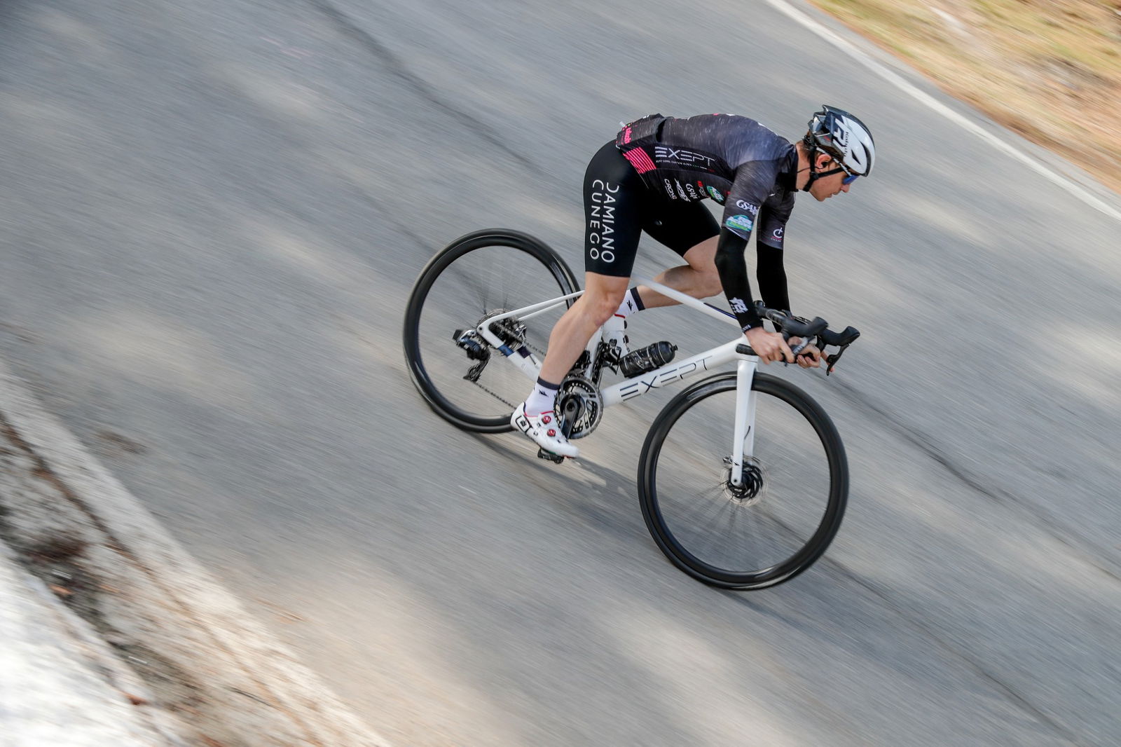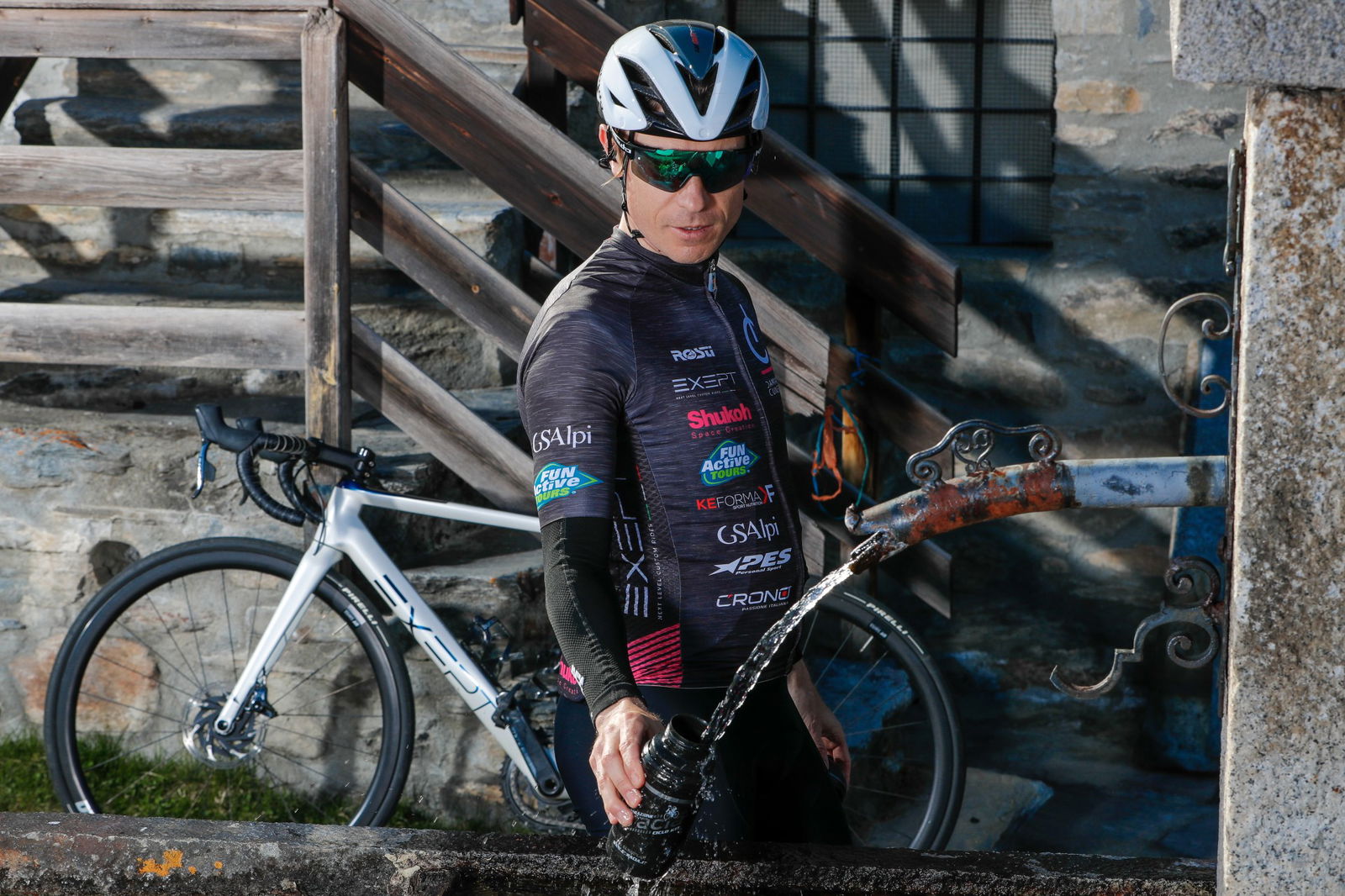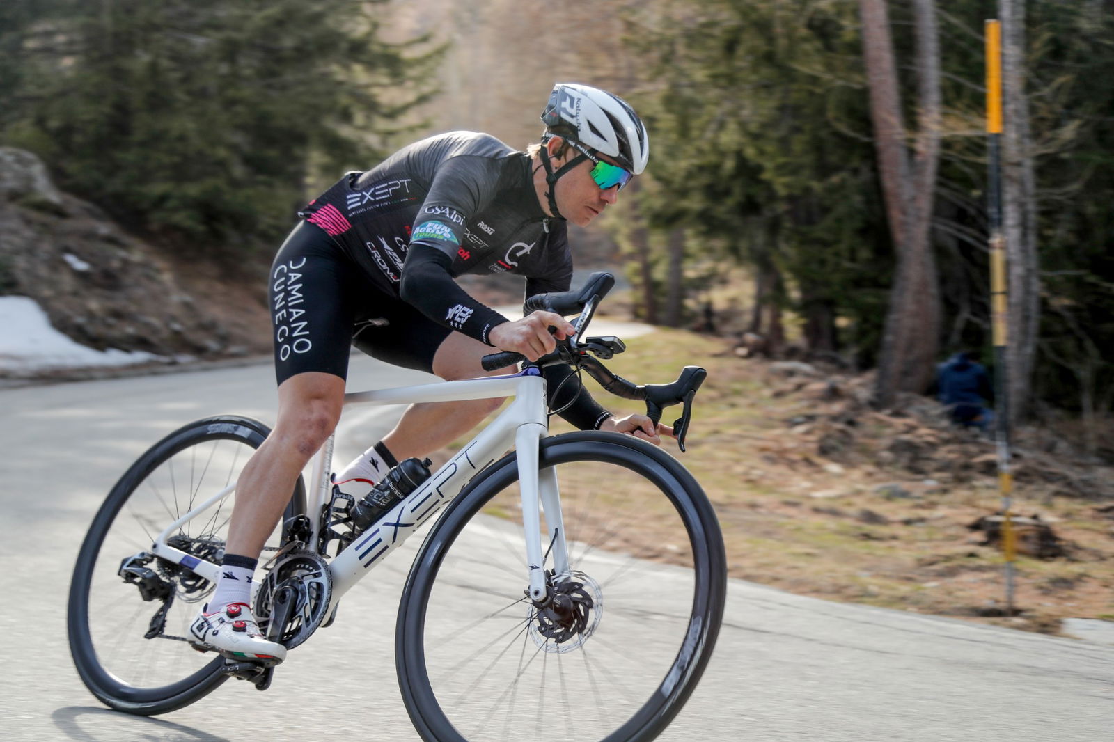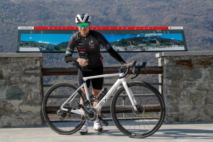 Il mood è rilassato e a dettare i tempi e i ritmi della giornata sono fotografo e operatori video, a partire dalla colazione al tavolino del bar in centro a Saint Vincent… Se lo spirito è da gita scolastica, i tempi e l’impegno sono da lavori forzati: si comincia a salire a freddo, si ripetono scene, si rifanno rampe e tornanti, in salita e discesa per dare modo a che deve riprendere da terra e dal cielo di acquisire la sua dose di immagini. Il pranzo è poco più di un rifornimento in gara, con la differenza che noi mettiamo le gambe sotto un tavolo e i panini non ce li lanciano con la borsa di tela.Poi si riprende: “Damiano, questa la rifacciamo stando un po’ più a destra“, “bello questo tornante, qui facciamo anche il drone“, “ancora una, pedalando in fuorisella“, “un po’ più aggressivo sulla discesa, una volta ancora“… Così, quando arriviamo in cima al San Carlo sono arrivate le sette di sera. Ci fermiamo per riempire la borraccia, sgranchire gambe e schiena e realizzare qualche immagine statica della Exept su cui pedala Damiano. La temperatura sta scendendo e dobbiamo ancora arrivare a Courmayeur, possibilmente prima che la luce cali troppo.
