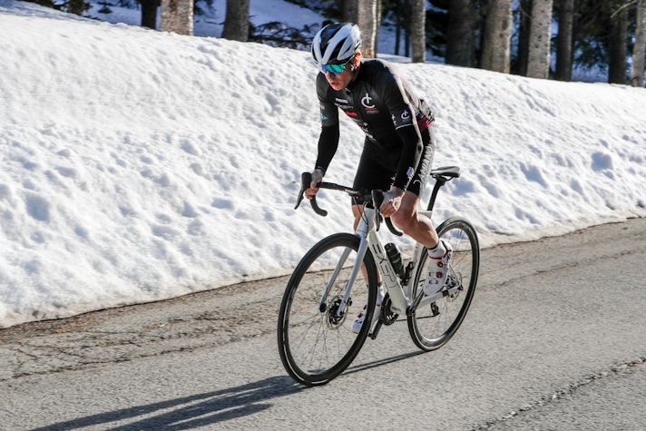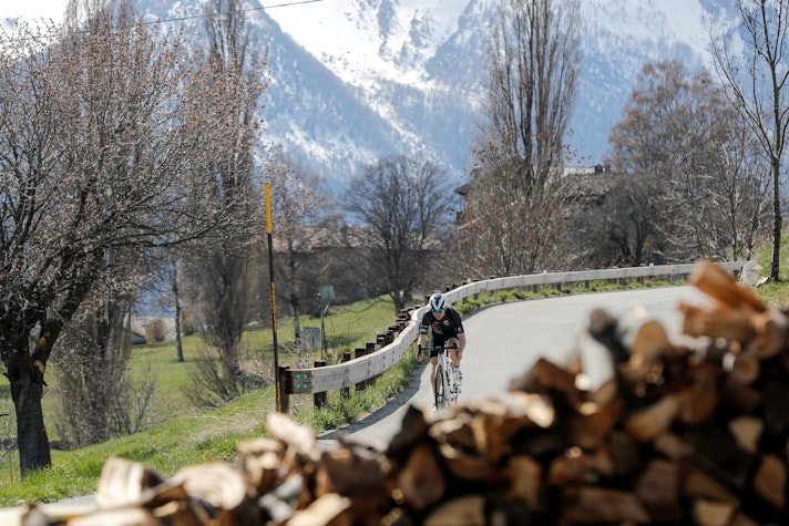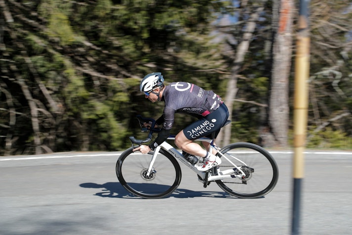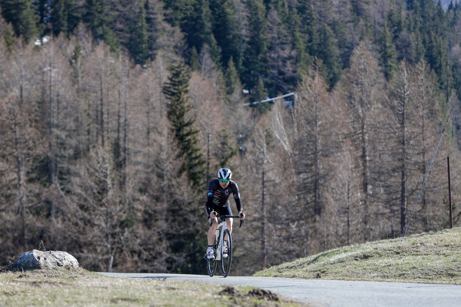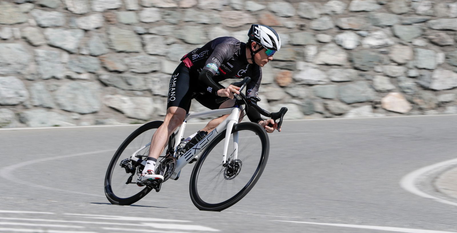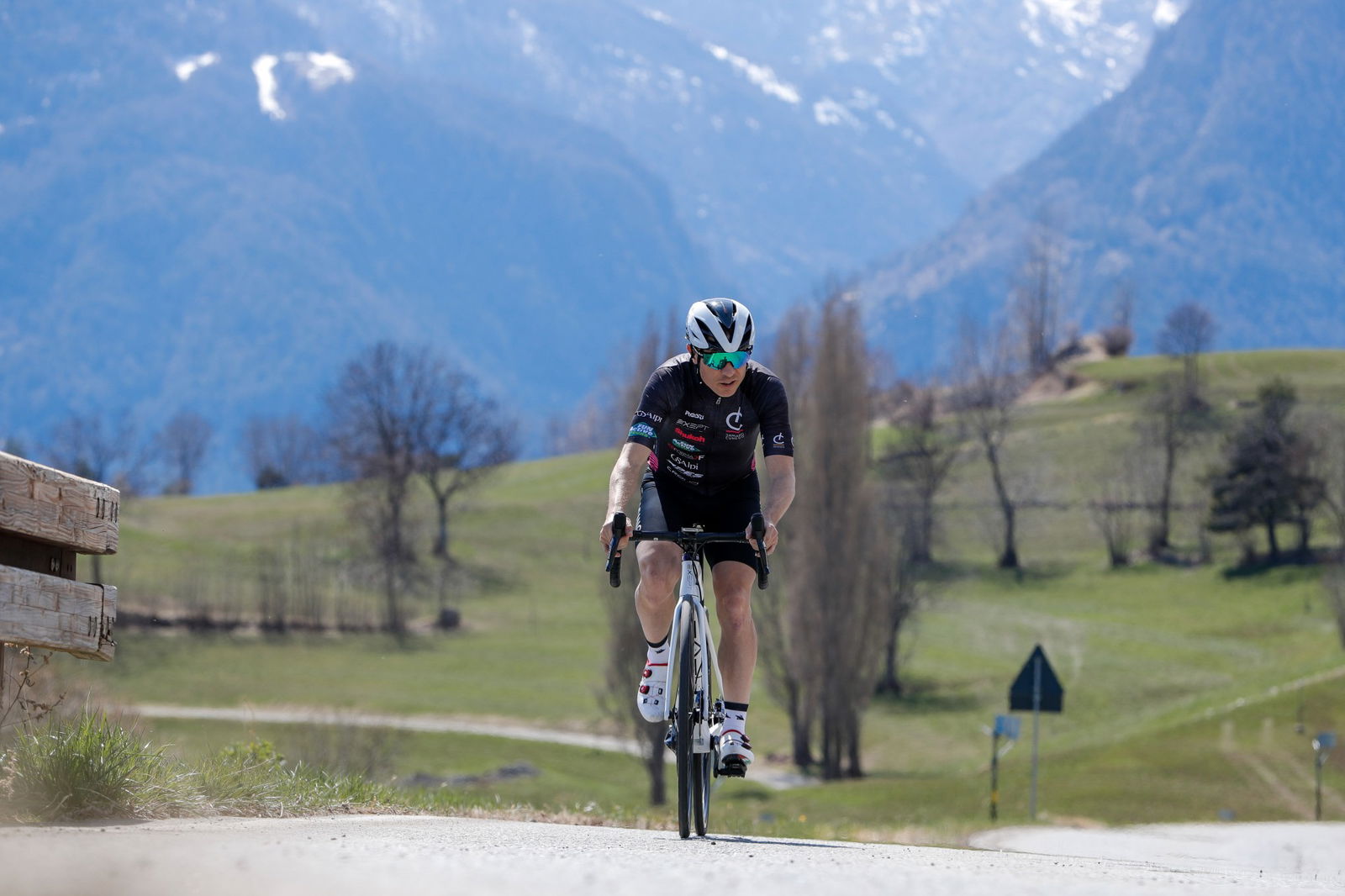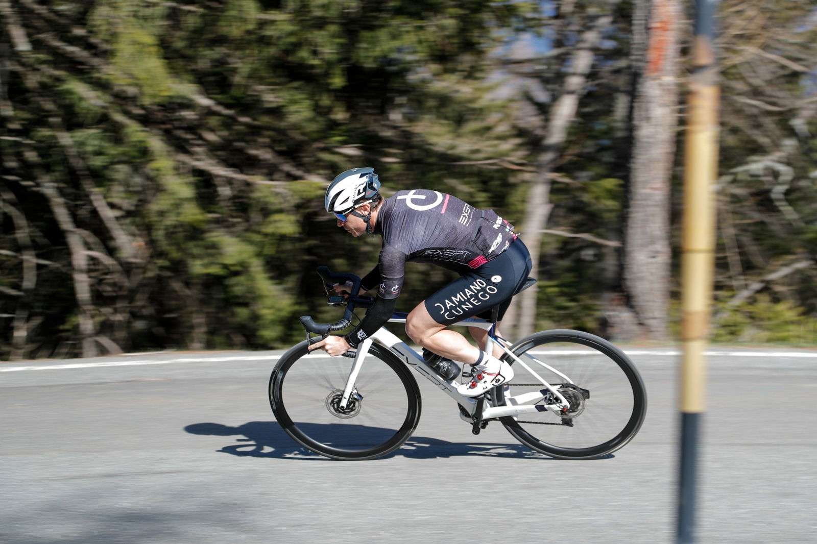 Il mood è rilassato e a dettare i tempi e i ritmi della giornata sono fotografo e operatori video, a partire dalla colazione al tavolino del bar in centro a Saint Vincent… Se lo spirito è da gita scolastica, i tempi e l’impegno sono da lavori forzati: si comincia a salire a freddo, si ripetono scene, si rifanno rampe e tornanti, in salita e discesa per dare modo a che deve riprendere da terra e dal cielo di acquisire la sua dose di immagini. Il pranzo è poco più di un rifornimento in gara, con la differenza che noi mettiamo le gambe sotto un tavolo e i panini non ce li lanciano con la borsa di tela.Poi si riprende: “Damiano, questa la rifacciamo stando un po’ più a destra“, “bello questo tornante, qui facciamo anche il drone“, “ancora una, pedalando in fuorisella“, “un po’ più aggressivo sulla discesa, una volta ancora“… Così, quando arriviamo in cima al San Carlo sono arrivate le sette di sera. Ci fermiamo per riempire la borraccia, sgranchire gambe e schiena e realizzare qualche immagine statica della Exept su cui pedala Damiano. La temperatura sta scendendo e dobbiamo ancora arrivare a Courmayeur, possibilmente prima che la luce cali troppo.