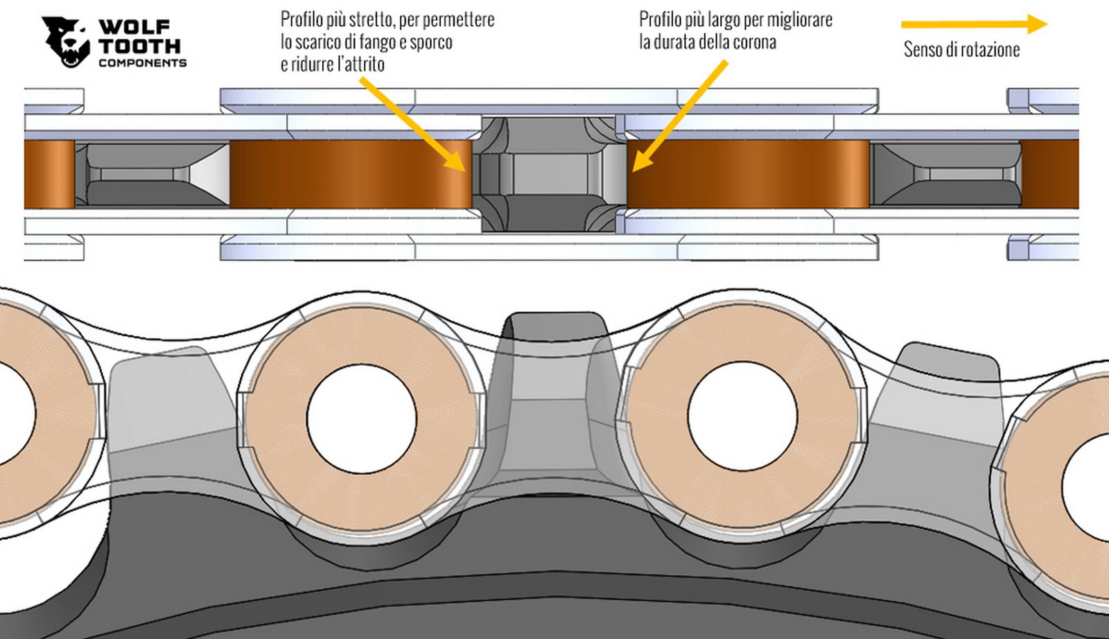 La trasmissione è uno degli elementi cruciali di una bicicletta, dato che è ciò che trasmette la potenza impressa dalle nostre gambe alla ruota, quindi al terreno, trasformandola in movimento.Esistono numerose aziende produttrici di componenti aftermarket dedicate alla trasmissione e prendere in considerazione l’upgrade della propria bici su questo fronte è una decisione che può portare a buoni risultati in termini di performance e affidabilità, soprattutto nella mountain-bike, dove lo stress cui sono sottoposte queste parti è molto maggiore rispetto alla strada.Una buona trasmissione, per non perdere le sue doti, deve essere però supportata da una cura e manutenzione all’altezza, sia per mantenerne inalterata nel tempo l’efficacia, sia per allungarne la vita.L’americana Wolf Tooth, specializzata nella produzione di corone e pignoni, anche per le modifiche su trasmissioni a 10 velocità, è una di quelle Case più apprezzate e la durata e la silenziosità che contraddistinguono i suoi prodotti, grazie a questo nuovo profilo dei denti, sono ulteriormente migliorate.Profilo dei denti asimmetricoSi tratta di una soluzione efficace e diffusa, che prevede per la parte anteriore del dente una forma differente rispetto a quella posteriore. Il concetto è molto semplice: la parte anteriore è quella che trasmette la forza sulla catena, quella posteriore deve provvedere a scaricare fango, detriti e sporcizia. Per questo motivo, avendo due funzioni completamente diverse, è logico che abbiano anche due forme diverse.Più materiale solamente dove serve