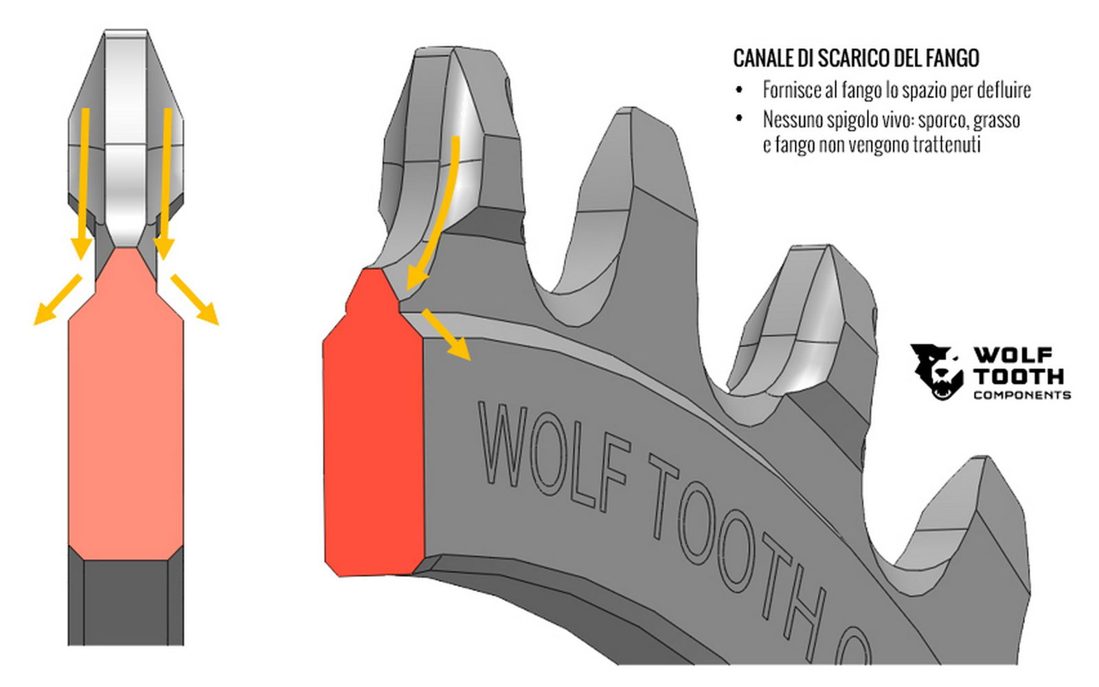 Questa vista in sezione mostra chiaramente il canale di scarico del fango, che permette alle nuove corone anticaduta Wolf Tooth di funzionare al meglio anche in condizioni particolarmente gravose e su terreni pesanti.Si tratta di un vero e proprio canale creato eliminando materiale non necessario, come spiegato in precedenza, che permette al fango di scorrere attraverso le maglie della catena. Tutte le superfici sono disposte di modo tale che non ci siano angoli vivi che trattengano lo sporco.Le corone 104 BCD direct mount per SRAM, Race Face Cinch e Cannondale sono già dotate del nuovo profilo dei denti, che sarà esteso a tutta la gamma nelle prossime settimane.Per altre info e per scoprire l’intera gamma dei prodotti Wolf Tooth, che comprende anche una nuova linea di attrezzi e accessori:www.riecycle.it/wolftooth/