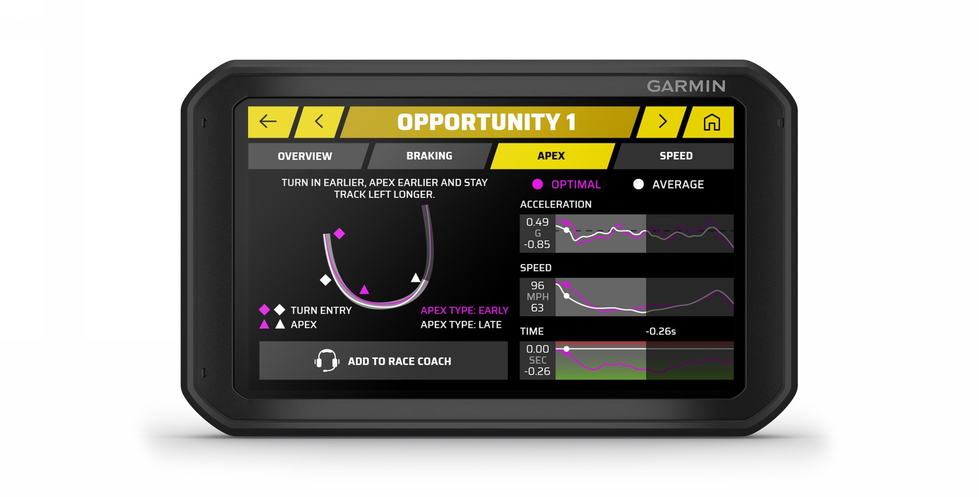 Garmin Catalyst, grazie ai suoi sensori, è in grado di registrare gli elementi fondamentali per un buon approccio alla curva, ovvero staccata, inserimento, punto di corda, uscita, e accelerazione. Fino a oggi, per conoscere in modo teorico il giro più veloce, era necessario suddividere ogni “lap” in singoli segmenti e sommare il tempo più veloce registrato di ognuno. Questo però non corrisponde alla verità, poiché il punto finale di un segmento veloce non è detto che coincida con il punto di inizio del miglior segmento successivo. Garmin Catalyst, attraverso la funzione True Optimal Lap, raccoglie le metriche della corsa e identifica i punti in cui i segmenti possono essere uniti senza soluzione di continuità per creare il vero giro di pista più veloce. In questo modo si ottiene un “best time” ipotetico sulla base delle traiettorie effettivamente percorse, fornendo al contempo i tempi verosimilmente raggiungibili.