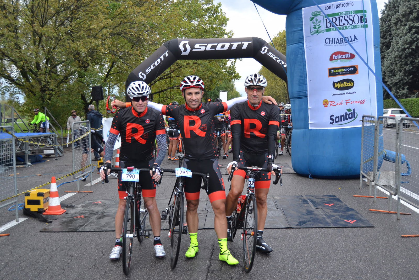 Il via, anticipato di 5 minuti per evitare l’incrocio in Brianza con una gara juniores – ma chi è arrivato sulla griglia a 1 minuto dall’orario ufficiale cosa avrà pensato? -, vede in griglia circa 1.800 atleti, un numero significativo visto che la GF Milano era alla sua prima edizione. La parte iniziale del percorso si snoda tra rettilinei e rotonde, con l’acqua caduta nella notte a bagnare divise e bici immacolate. Noi di RED partiamo in quattro, perché il quinto ha fatto tardi ed è arrivato in partenza quando non c’era più nessuno… Bresso, Nova Milanese, Monza, Concorezzo: l’effetto “elastico” nelle rotonde è micidiale, con il primo gruppo, velocissimo, che sembra allontanarsi alla velocità della luce, proiettato in orbita da un cannone spaziale! La situazione cambia da Lesmo in poi, su verso Camparada, Correzzana e Casatenovo: i partecipanti cominciano a frazionarsi in gruppi, sempre più distanti uno dall’altro. Per chi, dopo un lungo inseguimento dalle posizioni intermedie della griglia di partenza, si trova a ridosso dei migliori, il problema è tenere il passo sui tanti falsopiani in salita, dove i primi viaggiano senza apparente difficoltà a 45 km/h. Bisogna ragionare, perché il Lissolo con la sua pendenza massima del 18% non è lontano e il rischio di “saltare” appare più concreto che mai. Affiorano i ricordi delle gare Pro, gli scatti degli atleti nel punto più ripido.In salita il tempo sembra fermarsi: complici le pendenze impegnativa (meno male che c’è il 34×28!), per fortuna intervallate da tratti in discesa, si trova il tempo per guardare gli avversari, cercando di intuire se sono “a tutta” o stanno tirando il fiato. Con un occhio è anche utile sbirciare dietro, per evitare di essere raggiunti e magari superati da un gruppo numeroso. Superata la parte centrale del percorso, quella più dura, le strade tornano tipicamente brianzole, cioè mosse ma senza strappi duri.L’abilità del corridore sta nella gestione dei rapporti: non bisogna esagerare, rischiando di compromettere la freschezza muscolare, ma nemmeno passeggiare, per evitare che rientrino dalle retrovie decine se non centinaia di altri concorrenti. Al bivio tra percorso medio e lungo scelgo il primo, come deciso prima di partire. Ma c’è una sorpresa: la maggior parte dei componenti del mio gruppo gira a destra e si prepara ad affrontare le salite del percorso da 130 km. Rimaniamo in tre, uno dei quali dopo pochi chilometri a ruota, senza tirare un metro, ci dice testuale: “Vi offro una cena se mi portate al traguardo”. Non è questa offerta, però, a convincere me e il compagno di “fuga” a dare tutto, bensì la sensazione di essere davanti in classifica. Sensazione confermata dalla moto della scorta tecnica che ci segue mentre affrontiamo gli ultimi 40 chilometri di gara, praticamente una cronometro a coppie. Fino a Verano Brianza salite e discese si susseguono, ogni volta un po’ più dolci. Poi è tutta una volata fino al traguardo, con la moto che ci apre la strada e ci evita di perdere tempo soprattutto da Carate Brianza a Monza. Proprio in questa zona molti partecipanti hanno avuto problemi: senza scorta, infatti, non si può fare altro che rallentare alle rotonde e fermarsi ai semafori rossi, perdendo tempo e rischiando comunque incontri pericolosi con il cofano delle tante auto che contribuiscono a rendere lento e fastidioso il traffico domenicale.