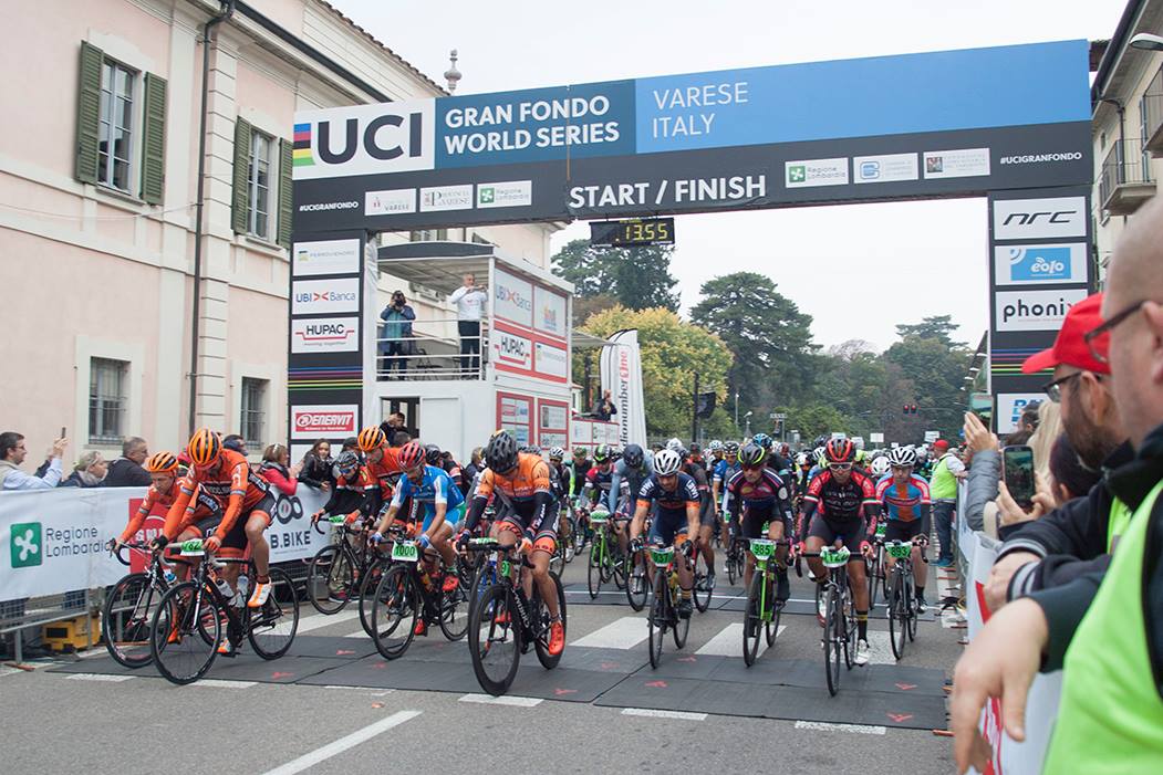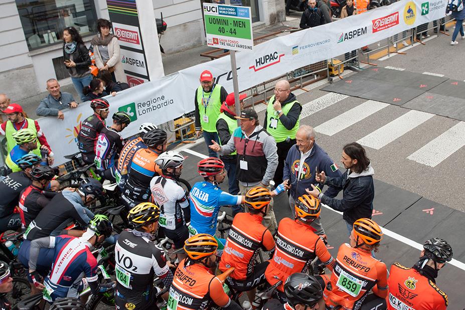 Voglia di salita e di emozioni mondiali? C’è la GF Tre Valli Varesine, appuntamento imperdibile per gli appassionati delle corse a media e lunga gittata. Il 1° ottobre, una domenica autunnale per temperatura e colore del cielo, nel centro di Varese totalmente chiuso al traffico, si sono radunati in più di duemila. Partenza alle 8.30 per categorie di età, separate una dall’altra di 7 minuti. La gara, inserita nel circuito UCI Gran fondo World Series, propone due percorsi: il medio da 103 km e 1.447 metri di dislivello in salita, e il lungo da 130 km e 1.993 metri di dislivello. Noi di RED Ciclismo siamo al via, suddivisi nelle categorie 35-39 (Fabio Banfi), 40-44 (me) e 45-49 (Luca Cribiù), quest’ultima la più numerosa per partecipanti.