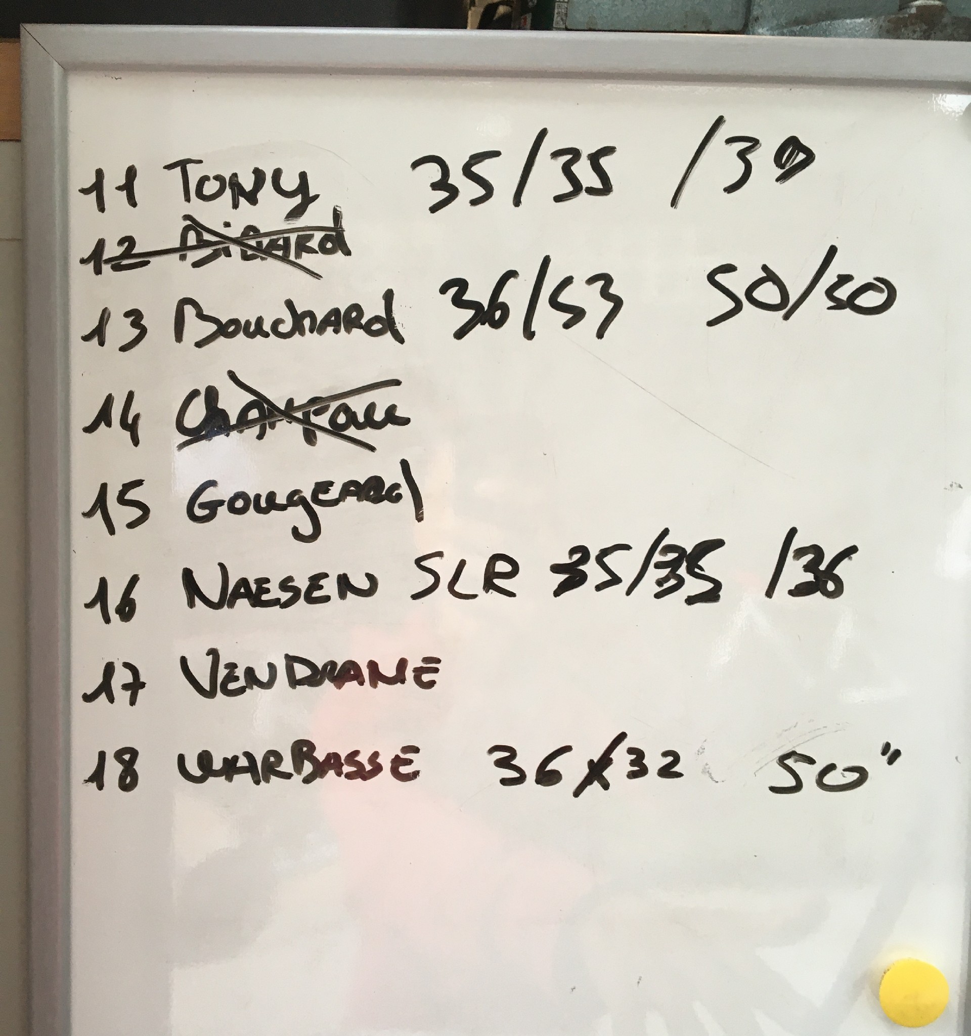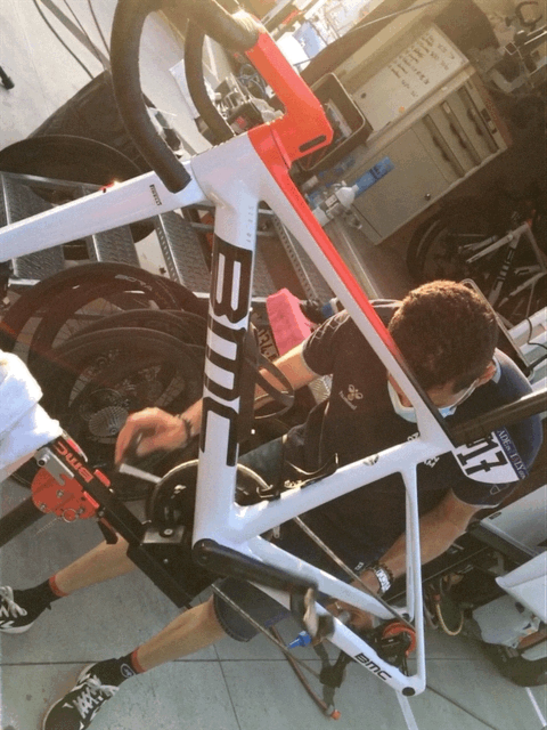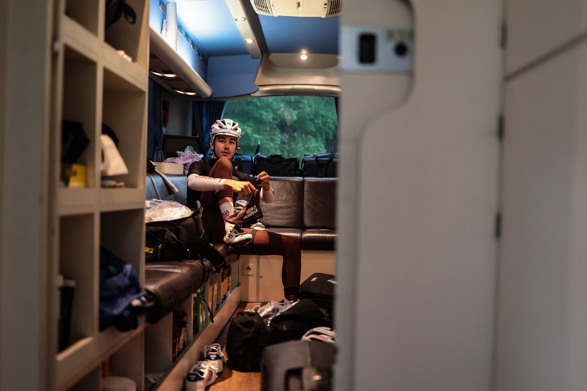 Nella due giorni passata al seguito del Team AG2R Citroën, abbiamo condiviso parte della vita del campo base, nel pomeriggio precedente lo Zoncolan. La squadra proveniva dal bel successo di Vendrane nella volata della frazione precedente, quindi il clima era sereno e i ragazzi carichi. Mentre gli autisti lavano le ammiraglie e gli altri mezzi di servizio, i meccanici puliscono le stupende BMC dei corridori, ingrassano movimenti centrali, registrano trasmissioni, spurgano freni, e le preparano per l’indomani. Attaccato alla porta del loro bus attrezzato a officina hanno il promemoria che ricorda le esigenze di ogni corridore per la tappona in arrivo: bici, ruote e rapporti sono scelti in base alle condizioni e alla strategia di gara. L’altro bus è quello su cui viaggiano gli atleti. Nei vani dove di solito si stivano i bagagli ci sono due lavatrici industriali, che ogni giorno centrifugano divise e biancheria. Poi c’è il van cucina: ogni team viaggia con il suo cuoco perché, nonostante alloggino sempre in albergo, i ragazzi seguono un regime alimentare ben preciso. I team, eccezion fatta per il dormire, sono praticamente autonomi e autosufficienti.