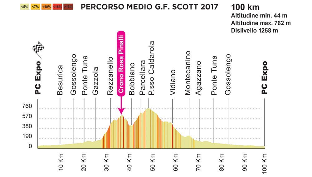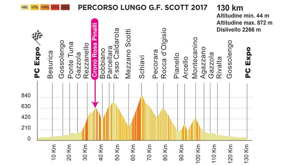 Percorso lungo: Piacenza Expo, Besurica, Gossolengo, Ponte Tuna, Rivalta, Rezzanello, Monticello (RIST.), Bivio Bobbiano, Pietra, Passo Caldarola, Mezzano Scotti (PUNTO ACQUA), Schiavi, Cicogni, Pecorara (RIST.), Cˆ del Diavolo, Rocca d’Olgisio, Pianello, Arcello, Montecanino (RIST.), Agazzano, Gazzola, Gossolengo, arrivo Piacenza Expo.In occasione della Granfondo Scott di quest’anno è stato ideato un nuovo traguardo, la Cronoscalata in Rosa che assegnerà la maglia Pink alla prima donna classificata.Il ritrovo è previsto alle 7.30 del 3 settembre a Piacenza Expo, per formare le griglia e partire due ore più tardi. Sul sito della manifestazione fino al 1° settembre 2017 è ancora possibile iscriversi.