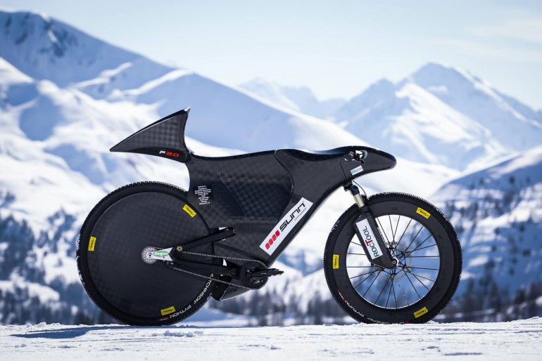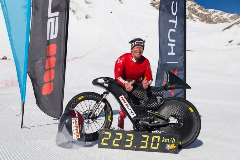 Il mezzo su cui è decollato è una mtb da downhill appositamente settata, con una carena aerodinamica in fibra di carbonio e ruote, anch’esse realizzate con la pregiata fibra, studiate appositamente da Mavic.