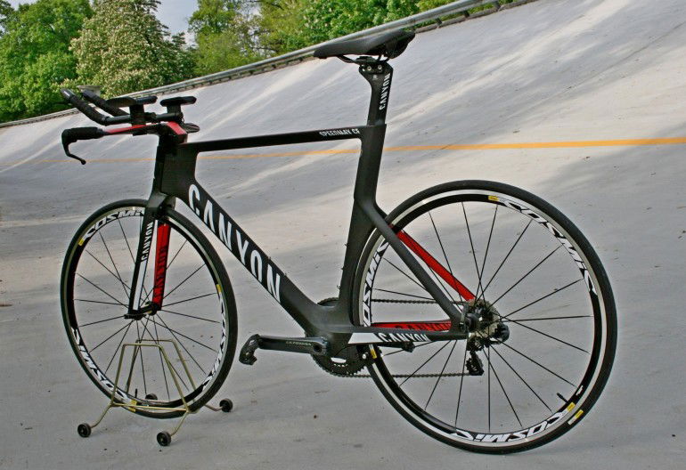 La prima preoccupazione dei tecnici Canyon? Ottenere la maggior efficienza aerodinamica possibile. Innanzitutto definendo opportunamente la forma degli elementi del telaio in carbonio, cosiddetta a “tridente”, appuntito in varie direzioni per penetrare non solo l’aria generata dall’avanzamento ma anche l’eventuale vento che proviene lateralmente. Per limitare le turbolenze tutti gli spazi tra i vari componenti sono ridotti. I freni, ad esempio: sia quello anteriore sia quello posteriore sono completamente integrati nella forcella e nei foderi orizzontali.Inoltre sia i cavi dei freni sia quelli del cambio sono inseriti all’interno del telaio attraverso inserti nell’attacco manubrio e quindi completamente protetti dall’aria. Per evitare turbolenze all’altezza del reggisella si è persino evitato di utilizzare il classico collarino, preferendogli un sistema integrato nel tubo orizzontale.La forcella della Speedmax, anch’essa in carbonio, vanta una chicca che consiste negli inserti Rake Shift: il ciclista può intervenire sulla posizione dei forcellini su cui si innesta la ruota anteriore, modificando l’interasse della bicicletta e conseguentemente le sue caratteristiche di guida. Ci sono tre posizioni e ognuna offre una differenza di 2,5 mm.La Speedmax CF 8.0 del nostro test, con gruppo Shimano Ultegra Di2 e ruote Mavic Cosmic Elite S WTS, pesa 8,1 kg e costa 3.999 euro. Non è un peso piuma, come non lo sono normalmente le bici da cronometro, complici in questo caso le ruote non proprio leggerissime. L’offerta di ruote aero comunque è talmente vasta che ci pare azzeccata la scelta di Canyon di lasciare al post-vendita l’eventuale acquisto di componenti più leggeri. RIDEBella! La Speedmax fa la sua figura con quelle forme aguzze e inusuali, che catturano lo sguardo di ciclisti e non solo. E fatta bene, secondo gli standard abituali della Casa tedesca, con le superfici delle tubazioni, i raccordi e le connessioni molto puliti, senza imperfezioni. Lo stesso discorso vale per la verniciatura, omogenea su tutta la superficie del telaio, anche vicino a fori e rivetti.Potete cucirvi addosso la Speedmax come volete: la sella presenta un sistema di regolazione a due viti parallele al reggisella, molto pratico e ben accessibile. Anche le appendici del manubrio e l’altezza dei poggiagomiti sono regolabili, per adattarli a misure e stile di guida.Un neo della Speedmax legato a tutte queste regolazioni e alla viteria in generale è che le viti sono di varie misure e forme: portaborraccia, chiusura placchetta freni e attacco manubrio, forcellini, chiusura estensioni, chiusura sella… Se volete cambiare assetto durante l’uscita, dovrete portarvi in giro una fornita cassetta di attrezzi, che vanno dalle chiavi torx a quelle a testa esagonale da 2.5, 3 mm ,4, 5, 6 e oltre. Troppe, bisognerebbe razionalizzare.