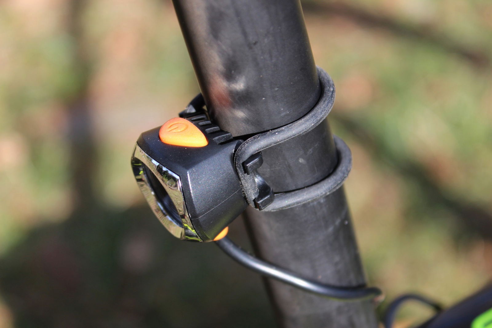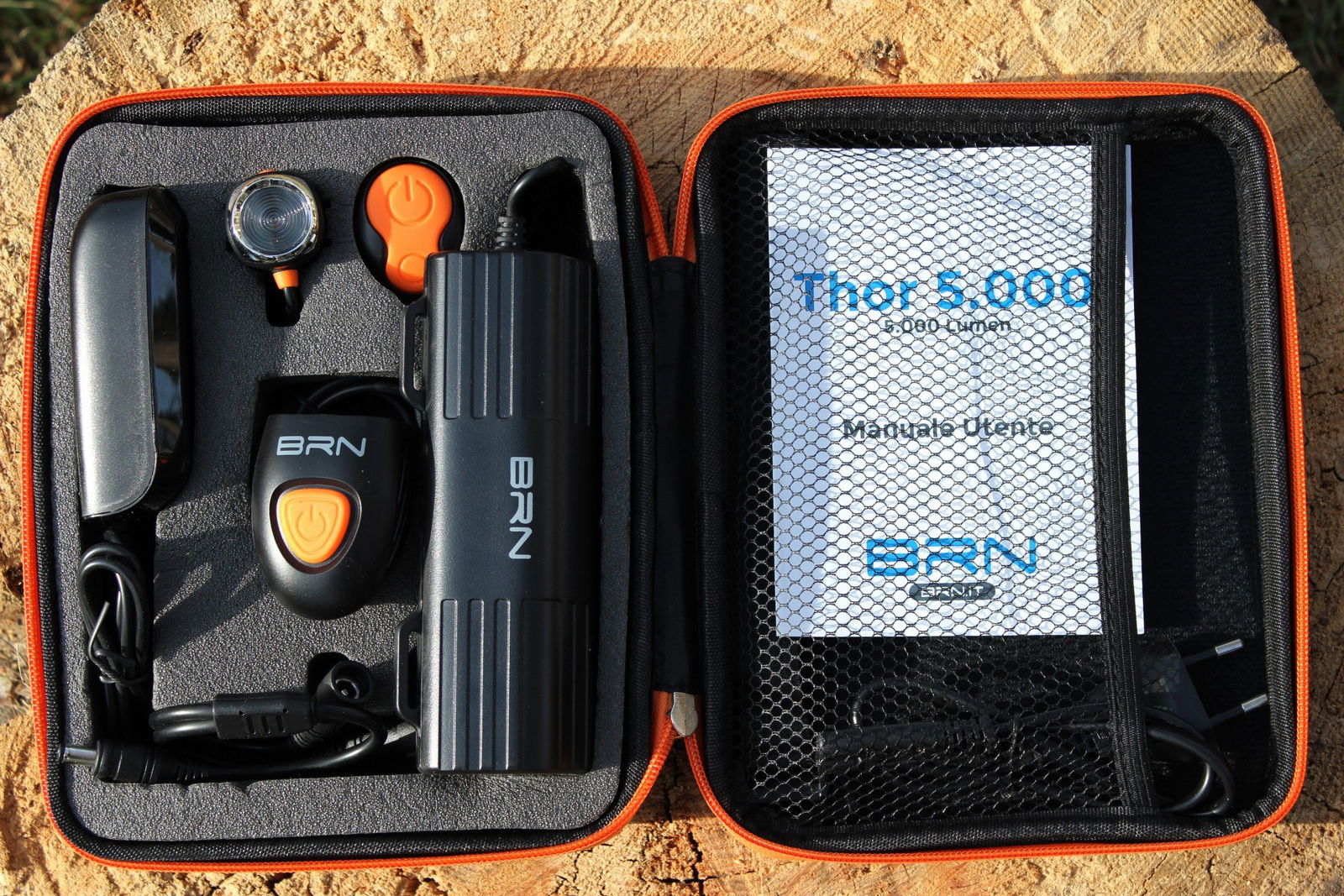 wireless in dotazione. La luce anteriore ha 5 led CREE XM-L2, che sviluppano un fascio di luce da 5000 Lumen. È possibile configurarlo come solo faro anteriore, solo faro posteriore, doppio faro anteriore e posteriore (in dotazione c’è un cavetto sdoppiato di alimentazione).Il pacco batteria al litio, che garantisce una autonomia da 3.6 a 10 ore, si fissa al telaio grazie a fascette con velcro e gommini protettivi. Thor 5000 è impermeabile sia alla pioggia battente, sia da spruzzi intensi come quelli che si possono trovare durante un guado.