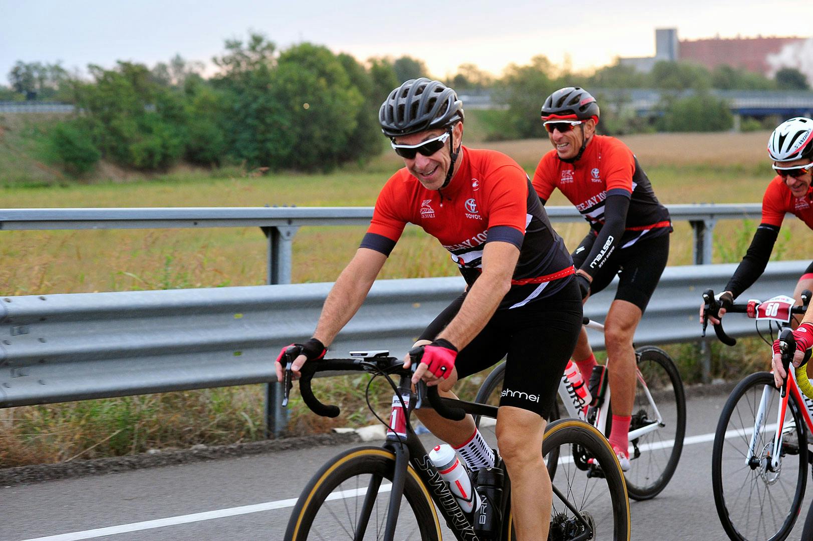 30 settembre 2018, è l’alba della Milano Ride Deejay 100. Il Team Red è in griglia, più agguerrito che mai. Oggi si punta in alto. E già non mi tornano i conti: cosa ci faccio in mezzo a oltre mille ciclisti che pedaleranno assatanati lungo un percorso a me poco congeniale? I cento chilometri sono piatti e velocissimi, il dislivello maggiore della giornata sarà quello per uscire dalla rampa del box, con l’automobile, e recarmi qui a Milano, quartiere Citylife.Vedo Linus in griglia, accerchiato dai suoi “spietati” e da Aldo Rock, voci che ascolto spesso alla radio. Sono giorni che ne parlano, sono giorni che medito di stargli davanti! Mi è già capitato di incontrarlo in bici, lungo le “mie” strade del triangolo lariano, e so che lo posso battere. Una volta scambiai due parole con lui sulla Onno (salita che da Oliveto Lario, frazione Onno, sale in Valbrona) e lo vidi piuttosto provato. Sarà il mio obiettivo di giornata.I miei spietati, invece, sono i soliti Edoardo e Fabio, con l’aggiunta del Bencio, il fortissimo tridente di RED. Poi, oltre a chi scrive, ci sono Igor (maestro di selfie) e Giovanni, quest’ultimo reduce insieme a me e al Bencio dal clamoroso podio alla 12 ore di Monza. Abbiamo ancora le gambe in palla dopo quella gara, chissà mai che oggi possano girare ancora meglio. Vedremo.