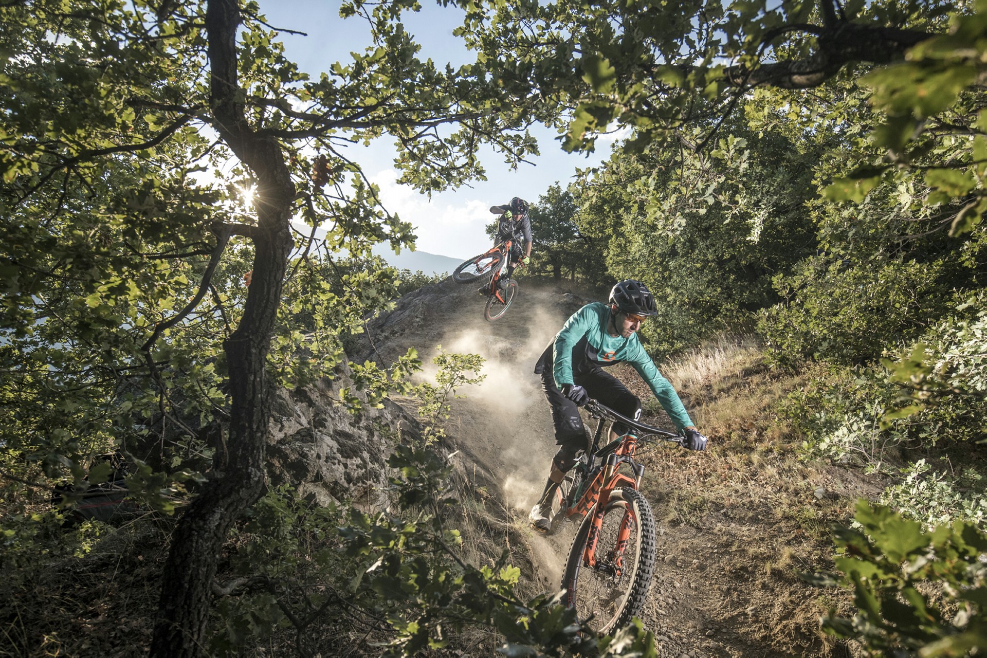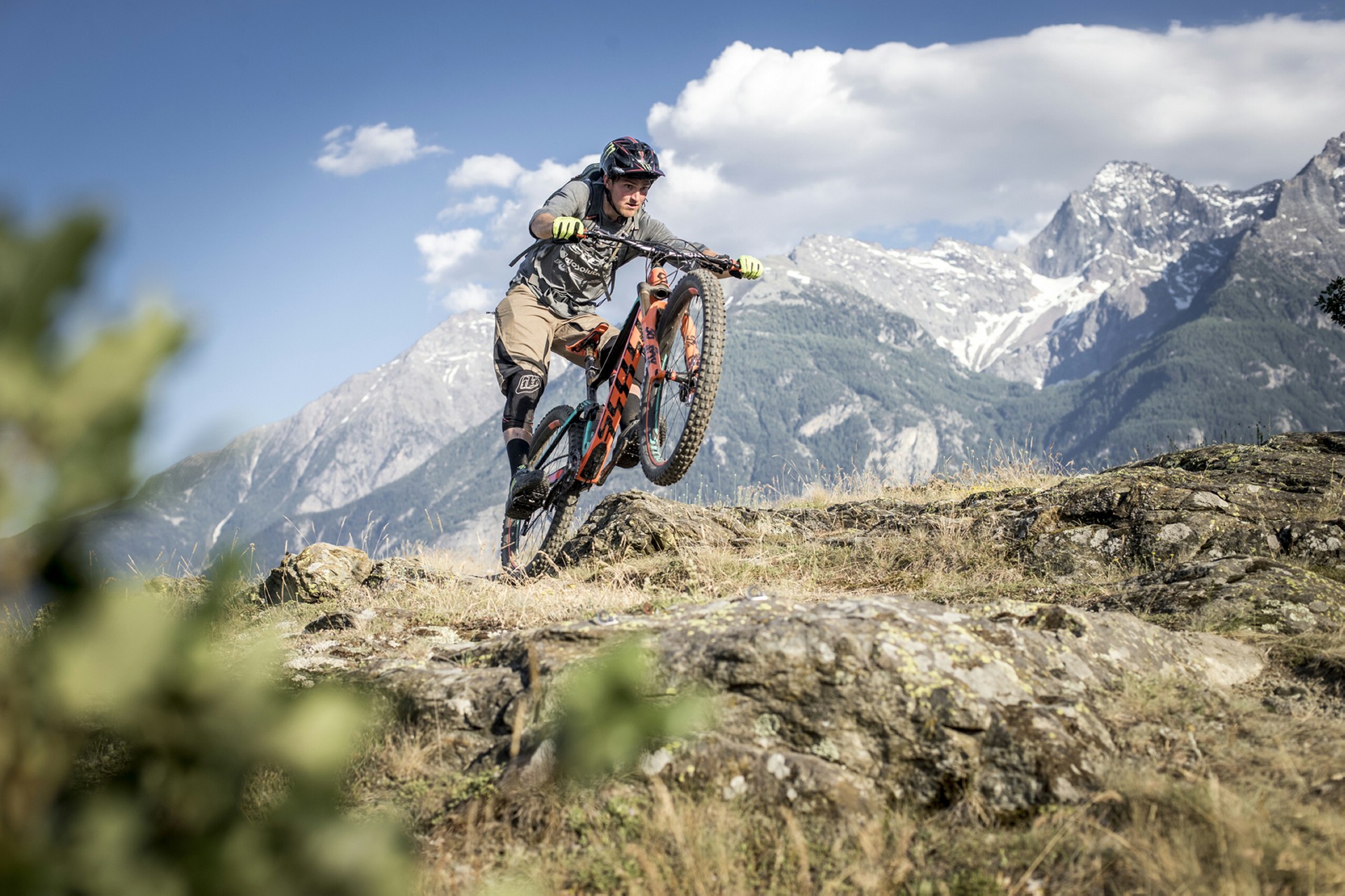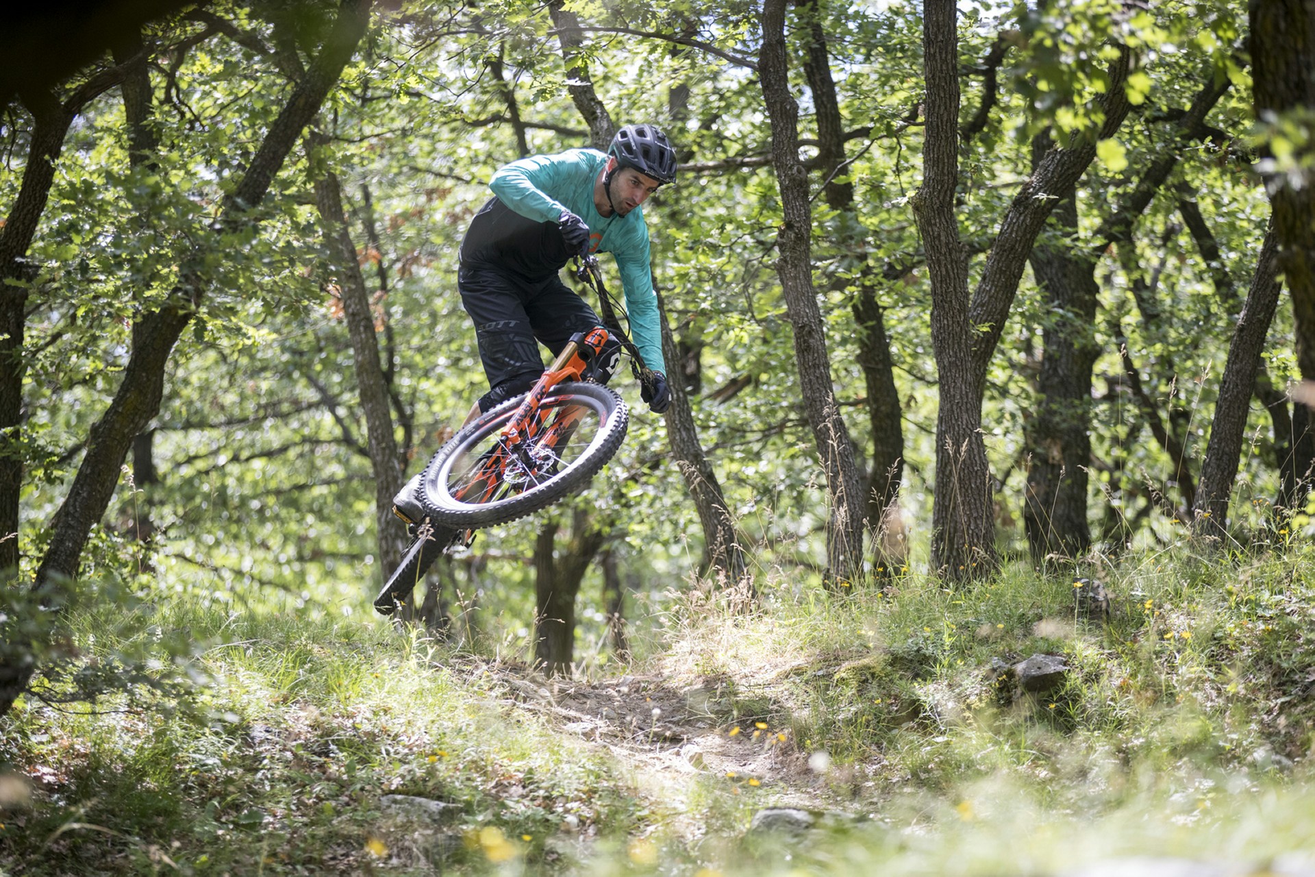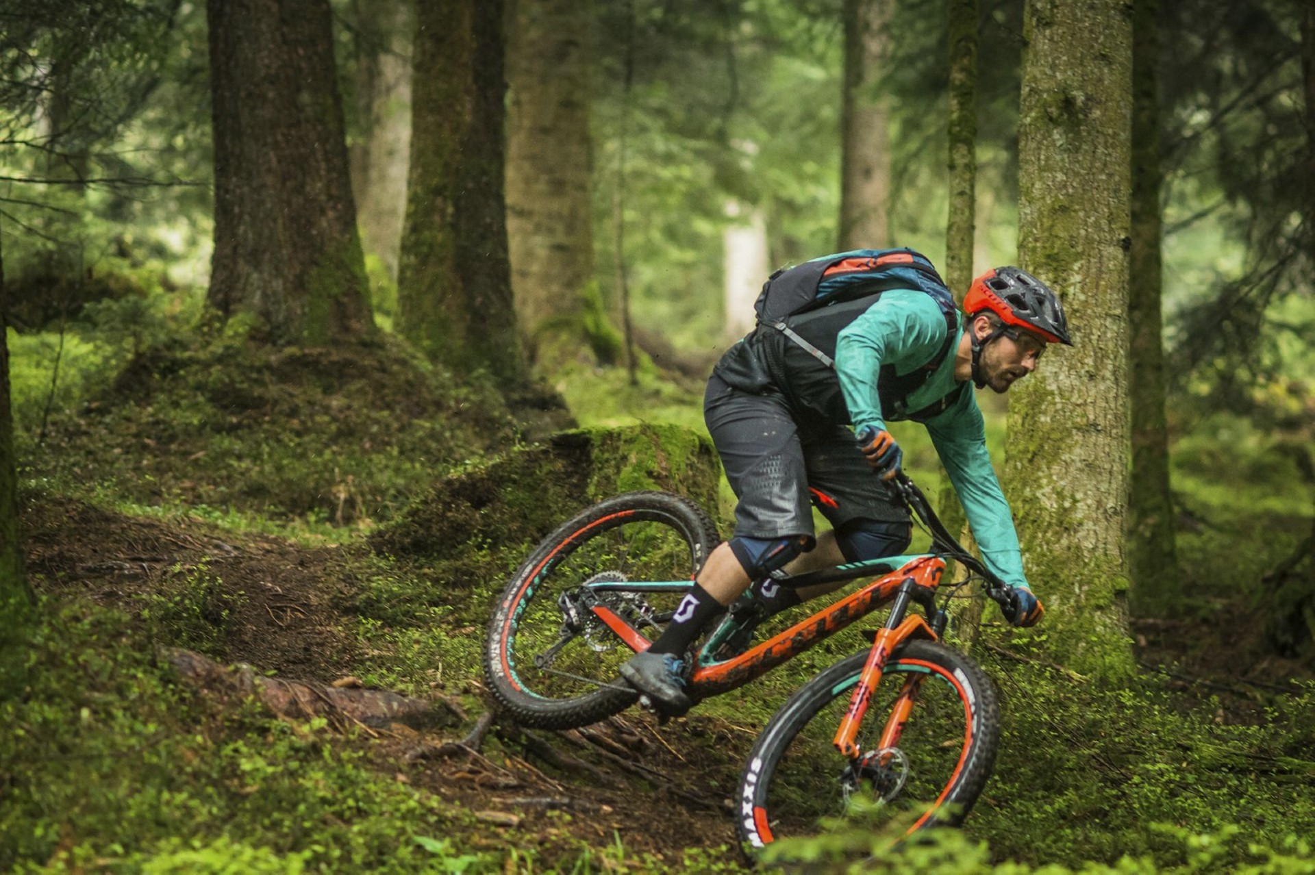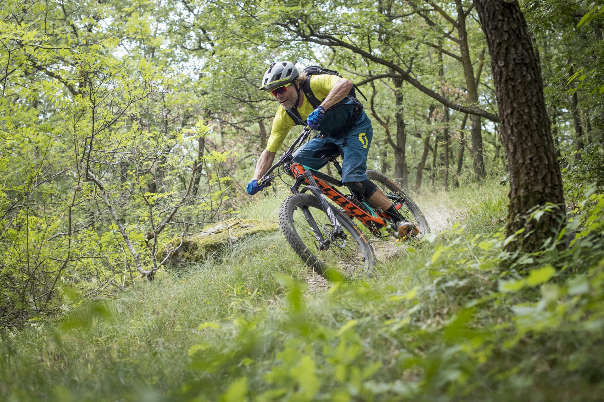 La bici totale è come la quadratura del cerchio: impossibile da ottenere. Però ci si può avvicinare molto e la nuova Genius ne è la dimostrazione pedalabile…Icona di versatilità sin dalla sua apparizione, nel 2004, in questo quinto stadio evolutivo rappresenta davvero lo stato dell’arte nonché il concetto moderno di bici All Mountain/Trail, sia a livello di soluzioni tecniche, sia di prestazioni.”Prima di scendere bisogna salire” è ora più che mai il mantra che ha guidato Scott in questo progetto. Ripidi strappi dal fondo infido, single track fluidi e veloci, discese da paura… Sono questi ambiti estremi a rappresentare i confini entro i quali in cui la nuova Genius è stata progettata per muoversi con disinvoltura.I NUMERI DA CONOSCERELe caratteristiche peculiari del progetto Genius possono essere riassunte in tre dati: 2.249 grammi (il peso del kit telaio+mono), 29″+27,5″ (le due misure di ruote che possono essere montate sullo stesso telaio), 150/110/0 mm (sono le tre opzioni di escursione permesse dal sistema di gestione della sospensione TwinLoc).Partendo dal telaio, è stata l’esperienza acquisita con la Spark e dunque con nuove tecniche di posizionamento dei fogli di fibra di carbonio a contribuire al raggiungimento di questo eccellente risultato in termini non solo di leggerezza complessiva ma soprattutto di rapporto peso/rigidità.Capitolo ruote. La nuova Genius dà la possibilità di passare da una coppia di 29″ a una di 27,5″ senza alcuna modifica, se non il solo rovesciamento di una delle placchette posizionata in corrispondenza degli attacchi del mono, per far sì che l’altezza del movimento centrale non subisca che una impercettibile variazione. Nel primo caso è possibile montare gomme di sezione fra 2,4″ e 2,6″, mentre nel secondo si può spaziare fra 2,5″ e 2,8″ quindi anche in configurazione non Plus.Il TwinLoc Suspension System non è invece una novità, ma mai come in questo caso si rivela un moltiplicatore di versatilità perché al crescere dell’escursione cresce l’esigenza di neutralizzarne il pedal feedback. La regolazione offerta del TwinLoc non agisce infatti solo sul freno in compressione ma anche sulla curva, riducendo l’effettiva escursione e modificando il Sag della sospensione.GEOMETRIA E SOSPENSIONE SONO NUOVEDato per scontato che una Trail sia performante in discesa, la dote che la rende completa ed eclettica è l’efficacia quando si tratta di pedalare, soprattutto in salita. Principali responsabili di questa capacità sono la geometria e la sospensione. La nuova Genius differisce dalla precedente sotto entrambi gli aspetti.In quanto a geometria, in Scott hanno lavorato per migliorare il bilanciamento: più corta di carro (436 mm), più aperta di sterzo (65,6°) e più chiusa di sella (75,3°). Queste misure danno origine a una distribuzione dei pesi che compensa l’avantreno più lungo e il reach maggiore, in modo da garantire stabilità, trazione e maneggevolezza.Stravolta anche la sospensione, che riprende lo schema adottato dalla Spark, con montaggio Trunnion. Questa soluzione ha portato a importanti modifiche anche a livello di costruzione del telaio, caratterizzato ora da una rigidità maggiore nella zona della scatola del movimento dove si concentrano le forze generate dal mono, che ha permesso di scaricare il top tube e distribuire rigidità e leggerezza in modo più mirato.MODELLI E ALLESTIMENTICome al solito, la scelta contempla tre differenti combinazioni di materiali per telaio e carro: full carbon (700 Ultimate e 700/900 Tuned), carbonio/alluminio (710, 720/920) e alluminio (730/930, 740/940, 750).Ovviamente, chi avesse le idee chiare sulla taglia di ruote più adatta ai propri gusti, può contare su allestimenti già definiti: i modelli in configurazione 27,5″ (serie 7) sono Plus con pneumatici da 2,8″ mentre quelli con ruote da 29″ (serie 9) sono equipaggiati con gomme da 2,6″.