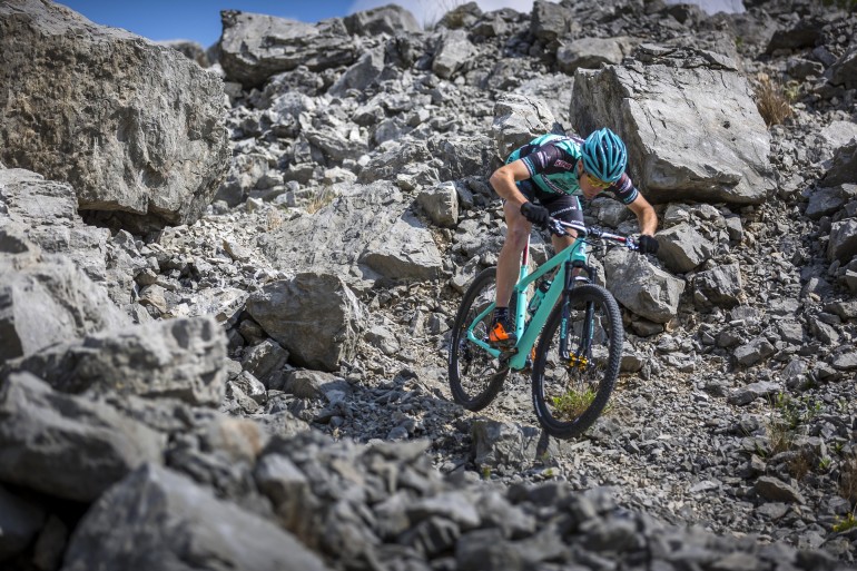 La prima impressione in sella a questa bici è che la posizione sia molto carica sul manubrio. Frutto dell’impostazione racing, ma ovviamente si può scegliere una piega manubrio più morbida e inserire qualche spessore in più per ottenere un’impugnatura più alta.Il percorso del test presenta quasi 1000 metri di dislivello in appena 20 km, su sentieri prevalentemente rocciosi. Roba da gambe buone e da bici che amano scalare.In salita la Methanol CV mostra subito le sue doti di arrampicatrice: si avvertono i benefici del carro compatto, della posizione carica sull’avantreno e dell’angolo di sterzo chiuso. Nei saliscendi guidati regala un’ottima sensazione di maneggevolezza. Anche la reattività alla pedalata è degna di nota, grazie alla scatola del movimento centrale oversize, che trasmette tutta la potenza impressa alla guarnitura. Nei tratti più scivolosi per la presenza del fango, i tubeless Kenda Honey Badger mostrano qualche limite dovuto alla tassellatura poco pronunciata. Sui sassi e su ogni tipo di fondo asciutto, invece, la bici mostra una trazione invidiabile.