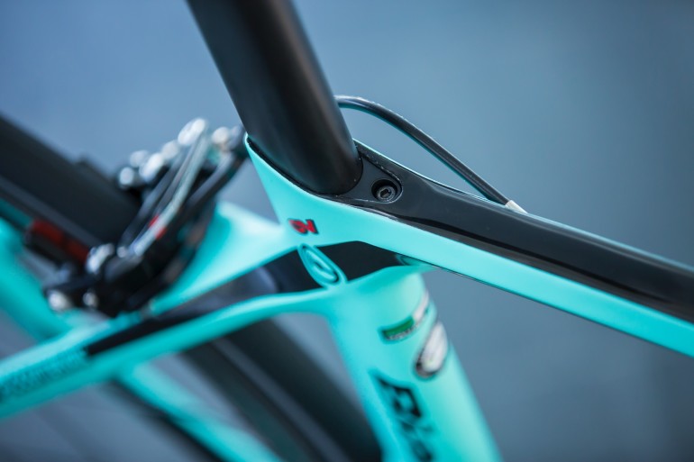 I tubi del telaio monoscocca sono di dimensioni generose e lo spazio tra questi e le ruote è ridotto al minimo, per ridurre le turbolenze. Il tubo sterzo è più affusolato della versione precedente e ora somiglia molto a quello del modello da crono Aquila. Anche i componenti della Oltre XR4 sono tutti orientati a fendere l’aria: manubrio integrato e reggisella hanno forme appiattite e il sistema di serraggio di quest’ultimo è completamente integrato nel tubo orizzontale.Degna di nota è la testa regolabile del reggisella (offset 25 mm o -10 mm). I freni sono di tipo Direct Mount, fissati su due assi anziché uno solo come i sistemi tradizionali, e ciò consente di posizionare il corpo freno più vicino al telaio e ridurre le turbolenze, oltre a conferire una maggior rigidità alla struttura.Il telaio monoscocca pesa 980 grammi in taglia 55. In circolazione ci sono telai più leggeri ma la Oltre non è una bici da “scalatore” quanto da “velocista” e comunque, opportunamente montata, riesce a stare con facilità sotto il limite di 6,8 kg imposto dall’Unione Ciclistica Internazionale per le gare dei professionisti.