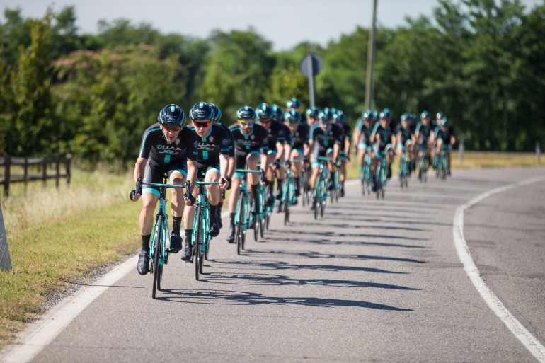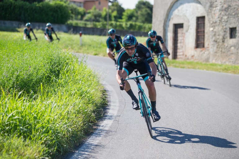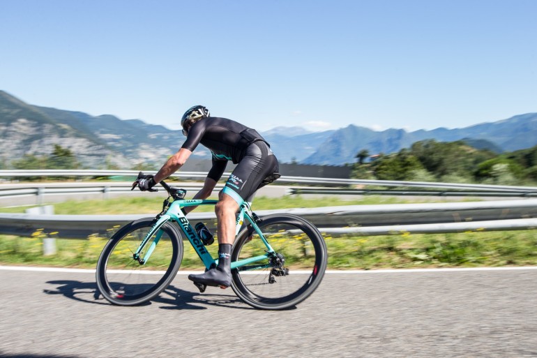 La forcella, anch’essa in countervail, pesa 370 grammi. La testa misura 1.4” (0,1 in meno del modello precedente) e il profilo si è assottigliato per ridurre la resistenza dell’aria. I forcellini sono interamente in carbonio, con una finitura in metallo nei punti di contatto con i mozzi ruota. La Oltre XR4 sarà disponibile a breve nei negozi Bianchi nelle misure da 47 a 61. Tra pochi giorni verranno diffusi i listini.Cinque le colorazioni, tra cui l’immancabile celeste, che però dalla Specialissima dello scorso anno in poi ha assunto una nota fluo che lo differenzia da quello classico. Sulla nuova road bike Bianchi è possibile montare tutti i migliori gruppi, dal Campagnolo Super Record, anche EPS, al nuovo Shimano Dura Ace, passando per lo SRAM RED eTAP. Ognuno di questi si può associare alla guarnitura con misuratore di potenza Rotor 3D+ InPower.Non è prevista per ora una versione con i freni a disco, un po’ perché le Case sembrano aver rallentato la spinta su questa soluzione e un po’ perché su una bici con il carro così compatto (407 mm in taglia 55) per essere rigido, sarebbero un controsenso, visto che un’azienda del calibro di Shimano garantisce il perfetto funzionamento del sistema (in particolare che non cada la catena) solo sulle bici con carro superiore a 415 mm.RIDEFranciacorta, 8 del mattino. Nell’abbigliamento che ci consegnano per il test non mancano copriscarpe e calottina copricasco, per essere anche noi il più aerodinamici possibile. Certo, l’outfit stride con la gamba non depilata ma questo è solo un dettaglio che credo non inciderà sulle prestazioni.