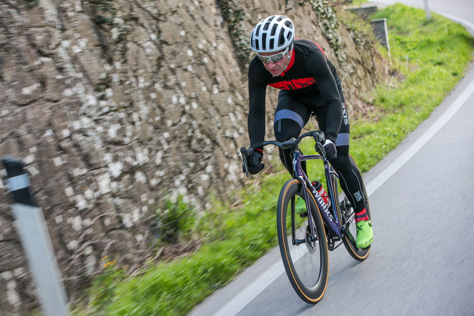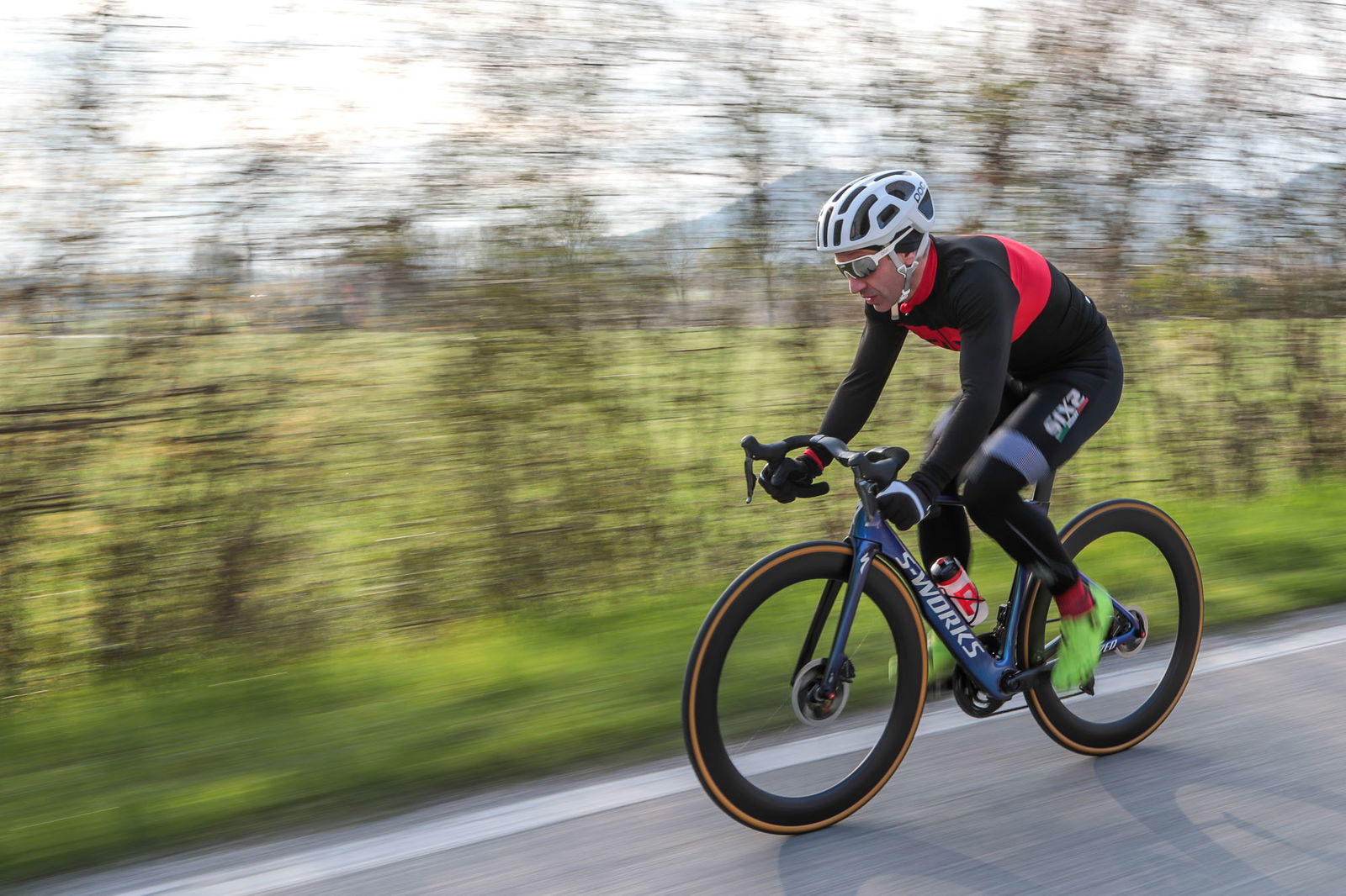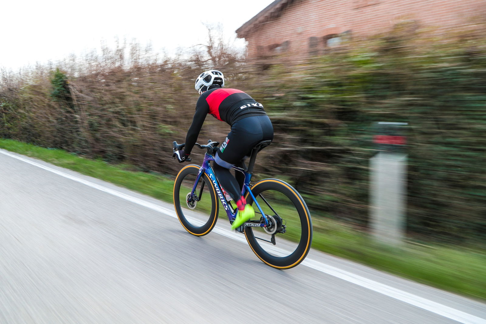 Spesso sono i primi chilometri in sella a regalare sensazioni che saranno confermate dalla successiva esperienza. Un po’ come nel più travolgente dei colpi di fulmine, quando l’irrazionalità irrompe, sconvolgendo tutti i piani. Primi chilometri, dunque. La Venge Disc, qui in taglia 52, è raccolta, compatta senza essere troppo sacrificata nelle dimensioni. Almeno se la si considera per la bici che è, un modello nato per le corse. Compatta e rigida. Rigida e reattiva. Reattiva e scattante. Nonostante i copertoncini di ampia sezione, la risposta che arriva dalle ruote è netta, senza compromessi, a testimoniare da una parte la rigidità delle ruote stesse e dall’altra le qualità del telaio. Su entrambi gli assi, come pure nella zona del movimento centrale, le scelte progettuali hanno privilegiato la reattività al comfort, nel nome delle prestazioni. Queste caratteristiche sono a tal punto evidenti da rendere immediato inquadrare la bici nella categoria delle agoniste pure. Rispetto ad altri modelli aero di alta gamma, la Specialized S-Works Venge Disc stupisce per la qualità della risposta dinamica, paragonabile a modelli “tradizionali”, che però non possono contare sullo stesso studio aerodinamico e nemmeno sul folgorante impatto estetico di questa bici.