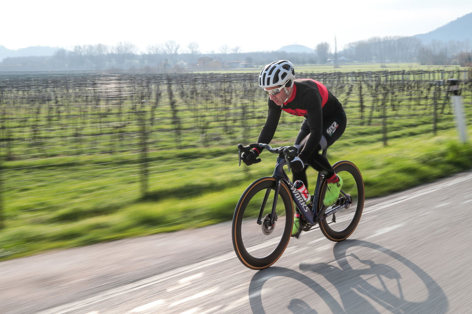 La pianura è ovviamente il terreno d’elezione della S-Works: la posizione in sella privilegia il carico sull’avantreno, grazie anche alla sella piccola e corta che sembra spingere in avanti. Il manubrio aero è comodo, totalmente privo di cavi a vista e largo quanto basta per appoggiare comodamente le mani in presa alta o esibirsi senza eccessivo stress nell’impugnatura bassa. La scorrevolezza percepita è da riferimento: realtà o suggestione, il ciclista si convince ben presto che tutti i Watt che spinge sui pedali – tanti o pochi – arrivino direttamente sull’aslfalto. Nelle variazioni di velocità laSpecialized S-Works Venge Disc impressiona: poche pedalate sono sufficienti per “chiudere il buco”, per tentare una fuga o anche solo per assaporare il gusto dell’aria in faccia. Questa peculiare attitudine esalta il ciclista, infondendo motivazione e innescando un circolo virtuoso tra atleta e mezzo meccanico, un dialogo che spinge in là il confine delle prestazioni.