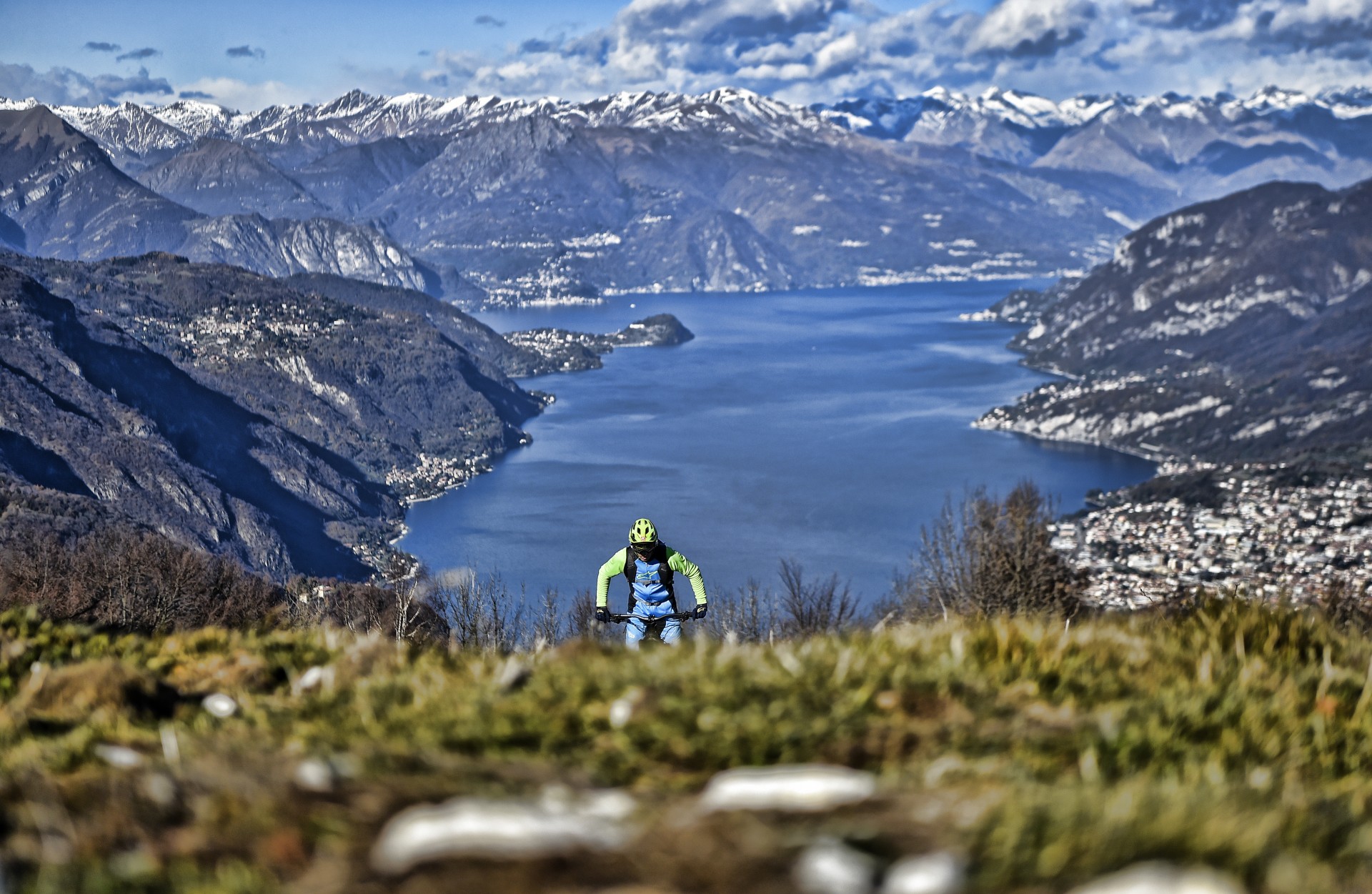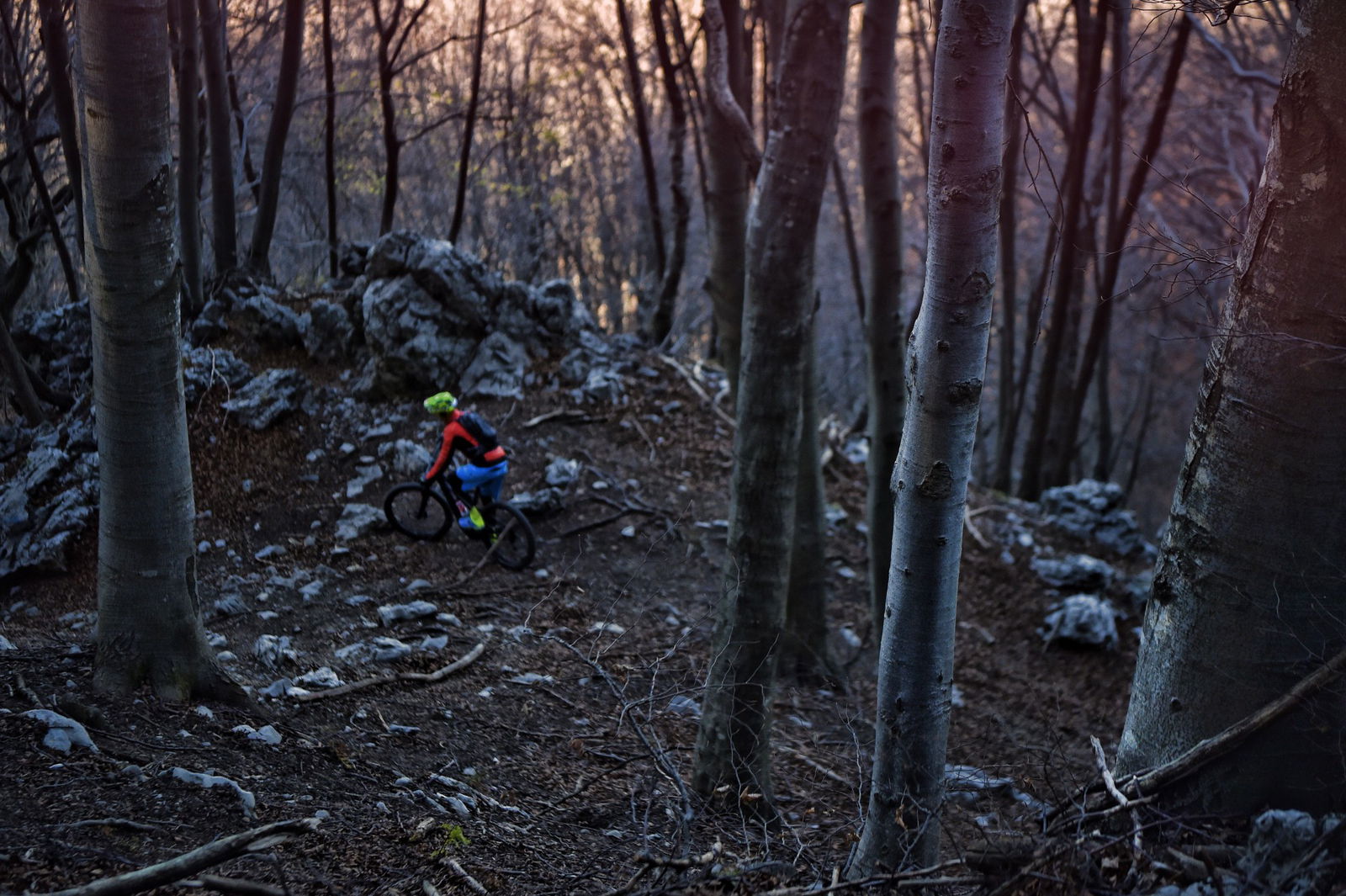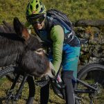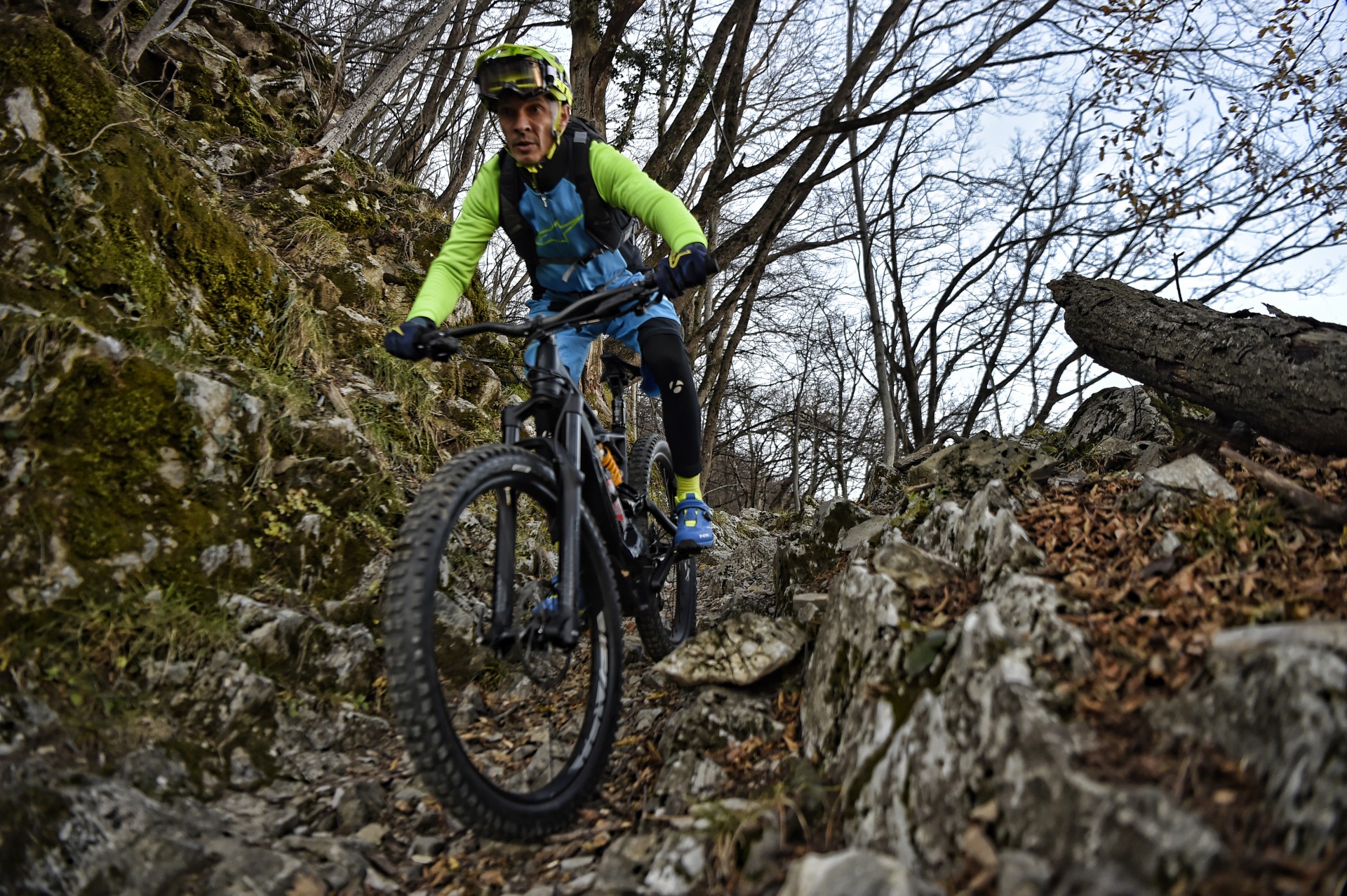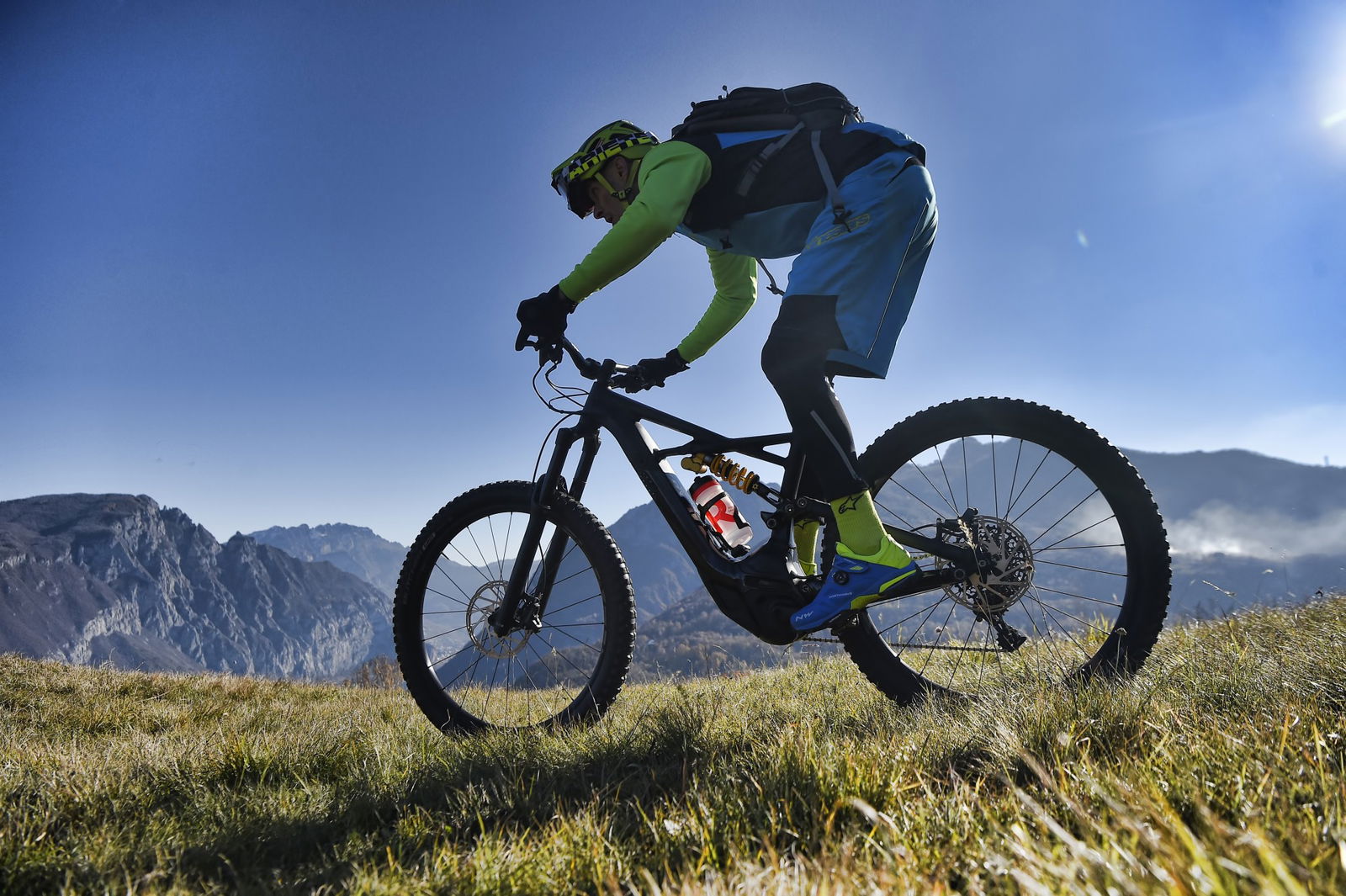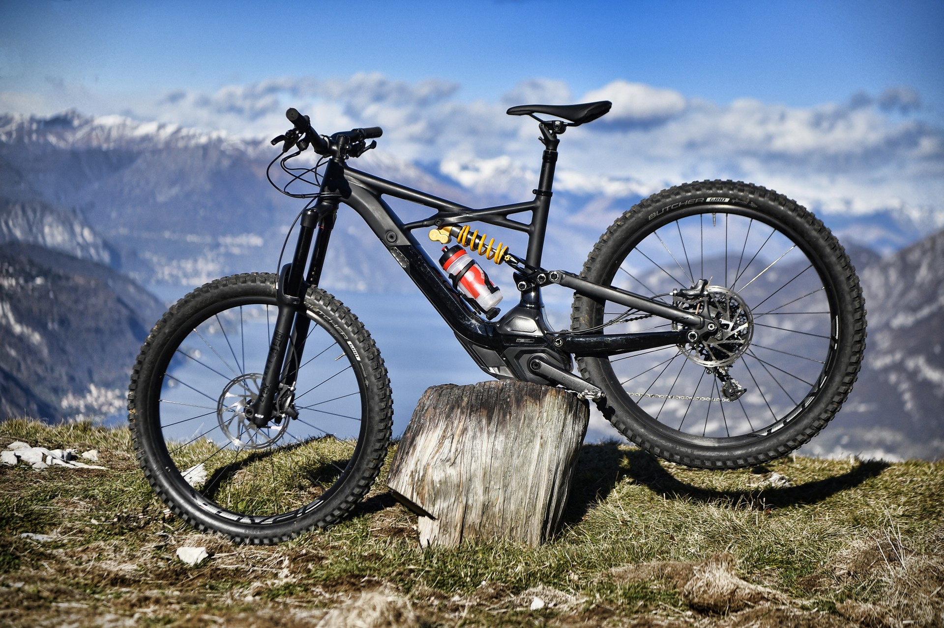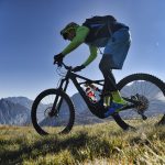 GIÙ A TUTTAPagato (con discreto piacere, come abbiamo già fatto notare) l’inevitabile prezzo della salita, l’investimento in sudore e calorie più che dallo scenario (comunque stupendo) è ripagato dalla discesa, ma era scontato. Il primo movimento automatico è premere con il pollice il comando del Command Post WU, che mentre abbassa la sella la inclina all’indietro, poi si sblocca la forcella e quindi si punta il manubrione verso il basso. Più la si molla, più la Kenevo si esalta e i suoi 180 mm di morbidezza si mangino tutto ciò che le fai scorrere sotto le ruote.Stabile, precisa e decisa (paga un po’ in termini di sveltezza e reattività quando le curve si fanno più strette, ma era normale aspettarselo), ti fa sentire di avere tutto sotto controllo. Se la salita mi ha fatto apprezzare scorrevolezza e grip delle gomme (le casalinghe Butcher da 2.8″), la discesa conferma l’impressione aggiungendo anche il comportamento in piega e frenata, anche se il formato Plus all’anteriore a me non piace troppo perché mi trasmette meno feeling rispetto a sezioni “normali”, soprattutto nelle curve con appoggio e quando un letto di foglie riempie il fondo del sentiero.Ottima la frenata garantita dagli SRAM Code R con dischi da 200 mm, sia per potenza sia per modulabilità e, come di consueto, poco percepibile l’effetto sull’efficacia della sospensione FSR.Dulcis in fundo mi sono anche concesso un paio di chilometri di discesa su asfalto dove ho potuto apprezzare l’architettura del motore a doppia ruota libera, che interrompe l’erogazione e svincola power unit e pedali una volta raggiunta la velocità massima.Due salitone, due belle discese e ancora voglia, energie e batteria sufficienti a fare un altro giro. Peccato che il sole sia troppo basso e che il programma preveda cena a base di polenta…Abbigliamento indossato nel testCasco