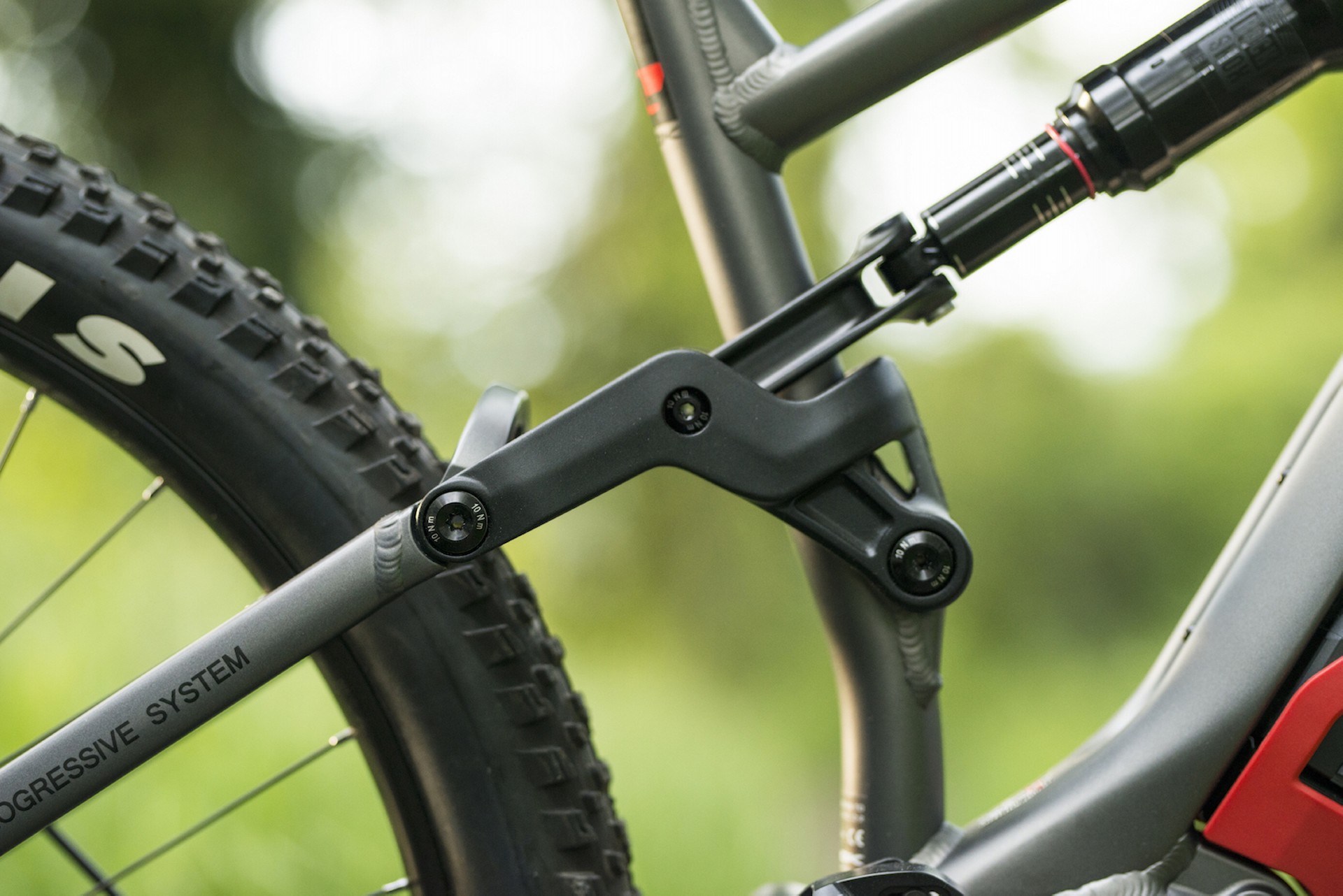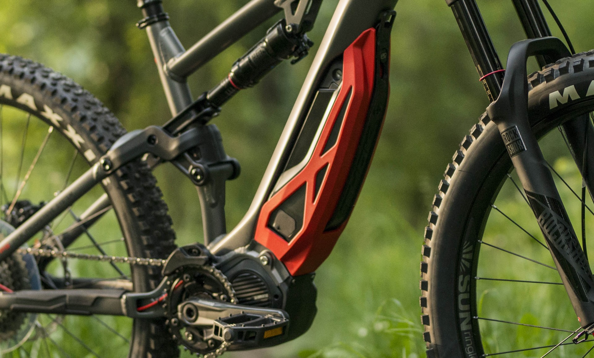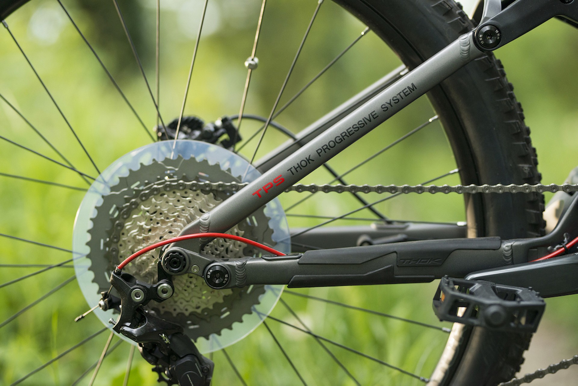 La sospensione, denominata Thok Progressive System, è a parallelogramma: un quadrilatero con snodo sui foderi bassi (Horst Link) che, abbinato ad ammortizzatore metrico con rocker dedicato, determina una curva progressiva e un comportamento compatibile con l’utilizzo Trail/All Mountain. I foderi sono piuttosto corti (siamo a 450 mm) per dare compattezza e rigidità al carro.POWER UNITLa scelta è caduta su Shimano, con il suo pacchetto STEPS E8000, di peso e ingombri contenuti, affidabile e prestazionale. La batteria (da 504 W/h e 1000 cicli di ricarica) è alloggiata in modo da abbassare quanto più possibile il baricentro e distribuire i pesi secondo le linee di progetto; è dotata di una copertura in ABS e fissata con una fascia elastica che copre l’interruttore di accensione. Il motore, protetto da un guscio antiurto, ha tre livelli di assistenza (Eco, Trail e Boost), oltre alla modalità Power Walk, indispensabile soprattutto su bici di questa tipologia con le quali, quando si mettono i piedi a terra per superare ostacoli, questi hanno la “O” maiuscola e scavallarli spingendo 22 chili di bici non è così agevole.