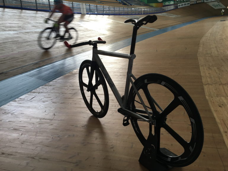 Il telaio, compatto e con profili piuttosto sottili, è in lega di alluminio/magnesio (serie 7000) arricchita con scandio e zirconio per migliorare le caratteristiche meccaniche della lega portandola a un limite di rottura vicino a quello del titanio (oltre il 30% più rigida dell’Ergal) il che permette di ridurre il peso complessivo del telaio del 20% (e la leggerezza si percepisce). Particolare l’attacco dei foderi obliqui che avvolgono il tubo verticale, così come il clamp reggisella integrato nell’estremità del tubo orizzontale. La rigidità e la stabilità di traiettoria promesse si apprezzano, così come l’accelerazione e il rilancio all’uscita delle curve. Merito anche della geometria e dell’avantreno, con sterzo conico e forcella molto lavorata.In T°Red definiscono Manaia Pista una bici da pista totale e, in effetti, a seconda di come la si configura riesce ad adattarsi (senza compromessi) sia all’inseguimento sugli ovali sia ai criterium su strada.Sul finire delle due ore di apertura si sente il crepitio del due tempi di un derny. Vabbè, è ora di uscire, penso, ma vedo che nessuno di chi sta girando accenna a rallentare. Capisco in fretta che il motore si è acceso per noi… Il derny entra in pista e raccoglie chi vuole mettersi in scia come un aspirapolvere le briciole di pane sulla tovaglia. Si va, con l’emozione della prima volta. Testa bassa, occhio sulla ruota di chi precede, niente cambi e velocità che cresce piano piano con il passare dei giri. I primi due sono forti e lo avevo già capito dai body e dai quadricipiti, infatti si fermeranno solo quando si spegnerà il motore, io mi difendo per cinque o sei giri, fino a che per tenere il ritmo entro un po’ in affanno, con il cervello ipnotizzato dal parquet che scorre sotto gli occhi e il collo che chiede pietà. Che bello. Sono contento come un bambino, soddisfatto come un adulto e lascio il velodromo con una quasi certezza: Parquet batte Inverno 1-0.Geometria Manaia PistaAngolo sterzo 74°Tubo sterzo 130 mmTop tube (virtuale) 570 mmBB drop -50 mmFronte/Centro 603 mmSlooping 0°Angolo sella 75°Foderi bassi 392-412 mmReach 426 mmStack 533 mmAbbassamento foderi 142 mmLunghezza forcella 368 mmRake 38 mm