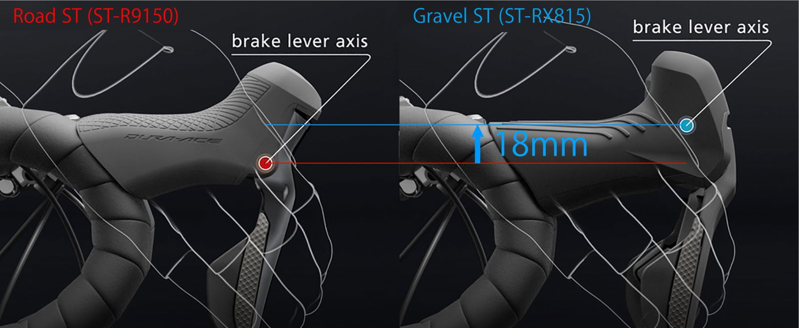 Sono state sviluppate appositamente per il gravel (Di2: ST-RX815 o meccanico: ST-RX810 / RX600 / RX400) con un asse più lungo di 18 mm, un profilo della leva freno curvo e una finitura strutturata antiscivolo.Per rendere possibile l’utilizzo dei reggisella telescopici, Shimano ha realizzato una particolare leva per freno a disco sinistra (RX810-LA) che, se utilizzata con una trasmissione 1×11, è in grado di controllare l’attivazione del telescopico mantenendo la zona del manubrio pulita e ordinata. La famiglia Shimano GRX presenta per la prima volta leve freno a disco idraulico specifiche per utilizzo monocorona. Della stessa famiglia la leva 1×11 Di2 sinistra, dotata di tre pulsanti (due pulsanti laterali e un pulsante superiore) per l’azionamento di funzioni ausiliarie come l’attivazione delle luci o l’accesso al computer di terze parti. Pesi: RX815-L/R Di2: 565 g; RX600-L/R: 611 g, RX400-L/R (10-speed): 613 g.