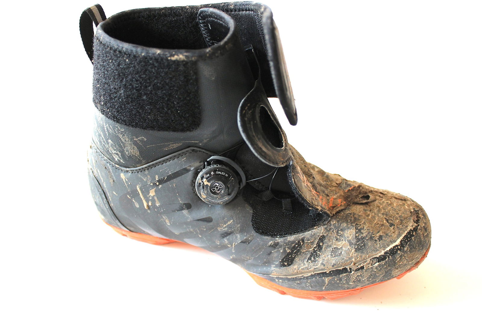 Se finora l’inverno ci ha regalato temperature non estreme e sentieri piuttosto asciutti, ci ha pensato dicembre a posare sui trail una buona dose di fango. Ecco dunque che se un paio di scarpe promette di tenerlo fuori anziché farci sguazzare i piedi, è un plus da tenere in considerazione al momento di orientare la scelta.La Defroster Trail è ciò che Specialized ha concepito proprio per queste condizioni. Il suo look è inconfondibile: se fosse un guanto sarebbe una moffolona, che ispira calore e protezione al primo sguardo e, se non fosse per l’oblò nella patella superiore, che lascia in vista la ghiera di regolazione della chiusura, sarebbe difficile distinguerla da un copriscarpe.COM’È FATTASollevata la patella che protegge l’apertura, basta sganciare il registro Boa e tirare la mezzaluna di plastica per smollare completamente la chiusura e permettere di infilare agevolmente il piede. La calzata è comoda e le dimensioni interne consentono di indossare anche calzettoni più spessi, senza tuttavia creare imbarazzi quando si tratta di stringere bene il piede e tenere il tallone al suo posto, cosa che non sempre è così scontata con questo tipo di calzature…spec chiusuraNella parte superiore della tomaia, la linguettona in neoprene presenta un doppio velcro su entrambi i lembi, che permette di tenerla perfettamente allineata e regolare la fasciatura in modo ottimale. A proposito di regolazioni, l’oblò dal quale fa capolino permette di agire sulla rotella del registro anche con i guanti, per stringere o allentare la chiusura senza aprire la scarpa e anche senza scendere dalla sella.COME SI COMPORTAI piedi si trovano a loro agio, merito della soletta Body Geometry e della fodera in Thinsulate, che mantiene una temperatura di comfort. Umidità e fango non sono un problema poiché la tomaia e le cuciture sigillate offrono una straordinaria barriera, che arriva addirittura a far desiderare, quando le temperature si avvicinano ai 10°, una traspirabilità che potrebbe essere anche migliore.La rigidità della suola, la sensazione di contenimento e la neutralità della fascia che avvolge la caviglia offrono sensazioni che non si discostano molto da quelle che si provano quando si pedala con una buona calzatura estiva, risultato notevole se pensiamo che ai piedi si indossano scarpe da un chilo la coppia (nella misura 43).spec suolaUn consiglio, per concludere. Quando saltate in sella cercate di restarci il più possibile, perché il grip della suola non è il punto forte delle Defroster Trail: anche se contribuisce a scaricare bene il fango, il disegno poco aggressivo dei tasselli non è molto amico del biker quando, su terreni poco consistenti, si tratta di mettere i piedi a terra e cominciare a spingere…SCHEDA TECNICAPrezzo 199 euroTomaia foderata con Thinsulate®, impermeabile con cuciture sigillateSoletta con barriera refrattariaCollarino tomaia in neopreneSuola in nylon stampata. Indice di rigidità 6.0Chiusura con registro Boa® L4Talloniera riflettenteRinforzi su talloniera e puntaSuola esterna e soletta interna Body GeometryCompatibile con i sistemi di aggancio a 2 viti